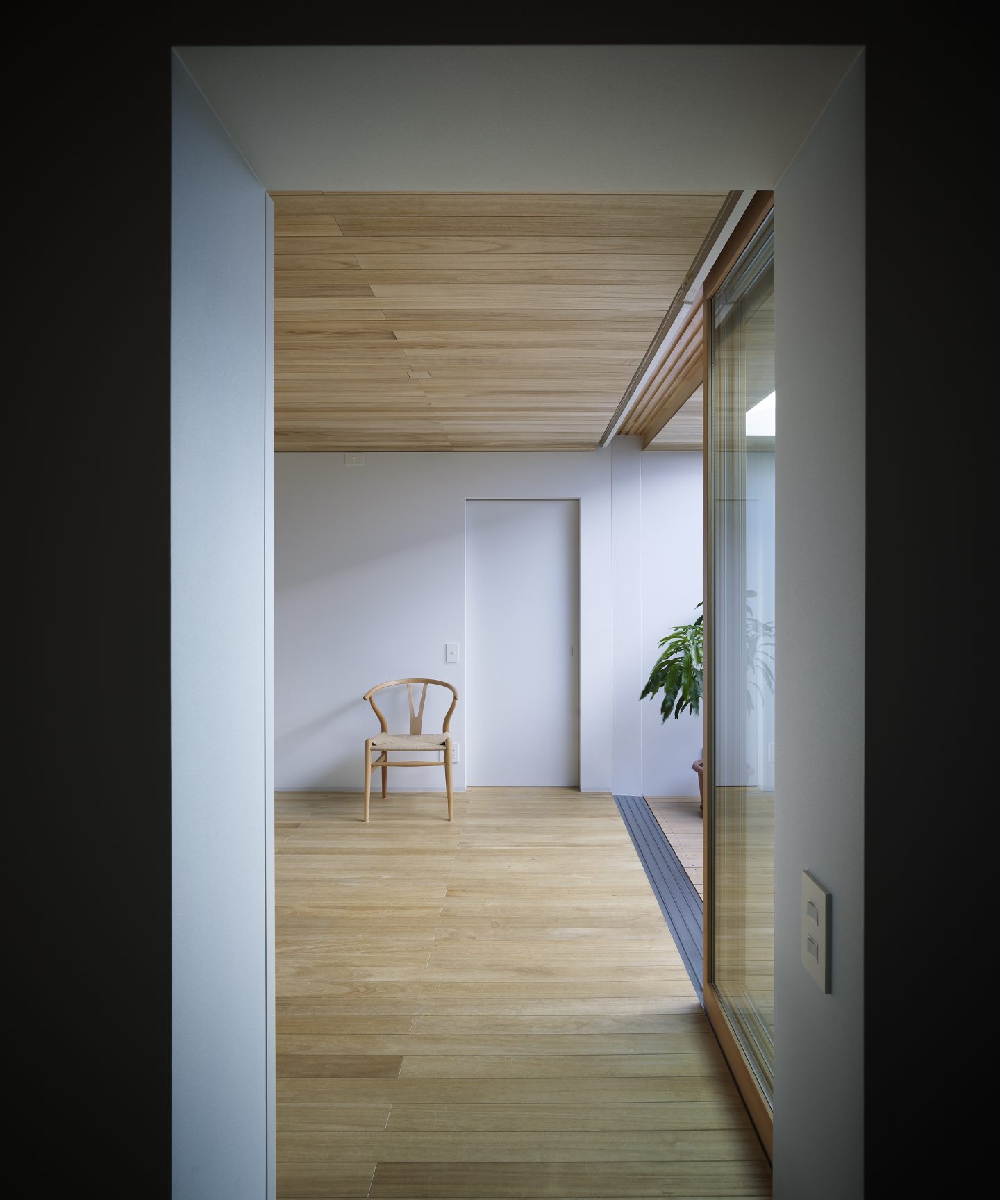 また、このあいだが外部で起こる様々な自然の現象との緩衝体になることで、守ることと開くという、相反する性格を同時に持ち合わせています。構造は木造でありながらも、自由な開口部が選択できる工法を考えました。本来、木構造は柱・梁と筋かいによって耐震要素を補完しますが、ここでは柱が筋交いであり、筋交いが柱であるような、柱を斜めに使用した構造を採用することで、軸組がシンプルに構成され、木造でありながらも、開口に制約を与えない構造になっています。