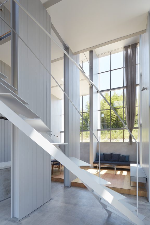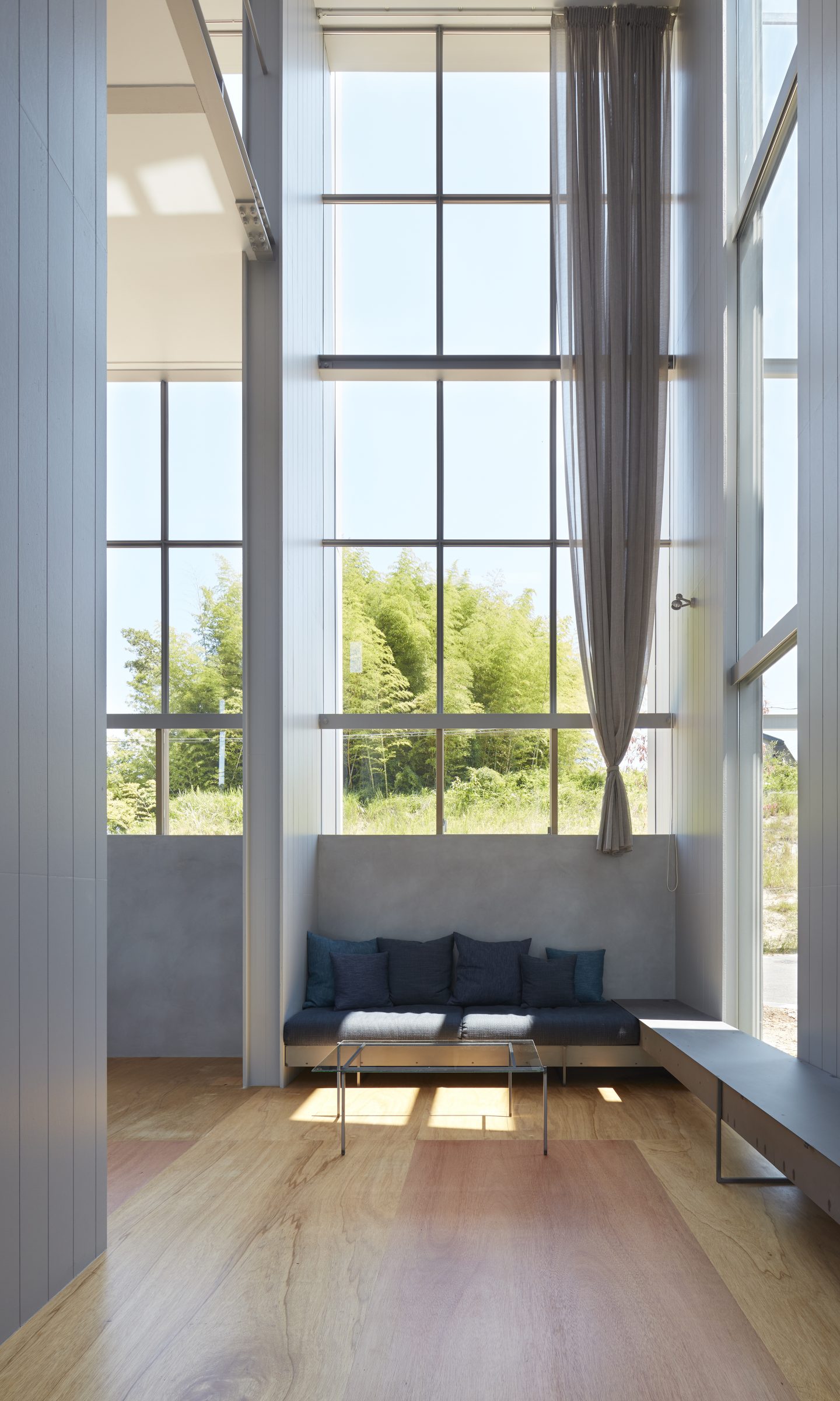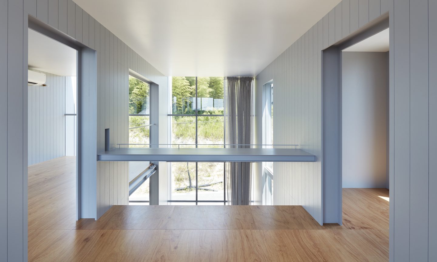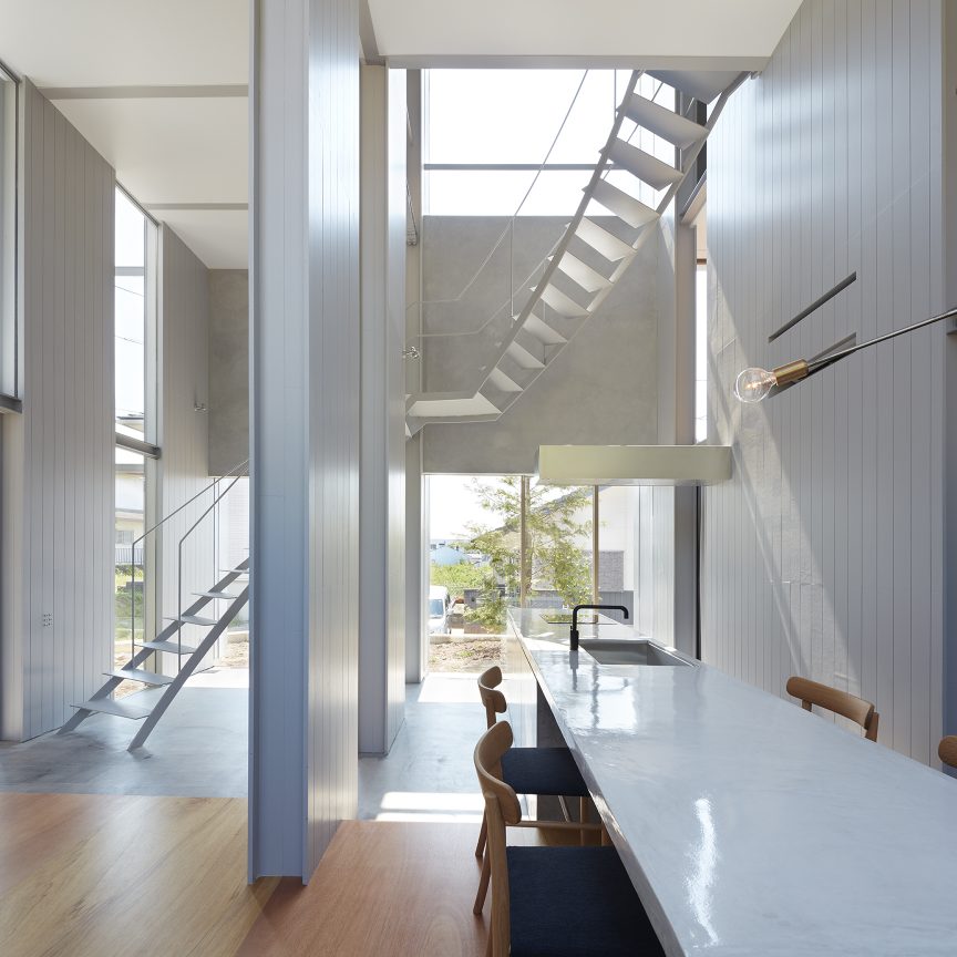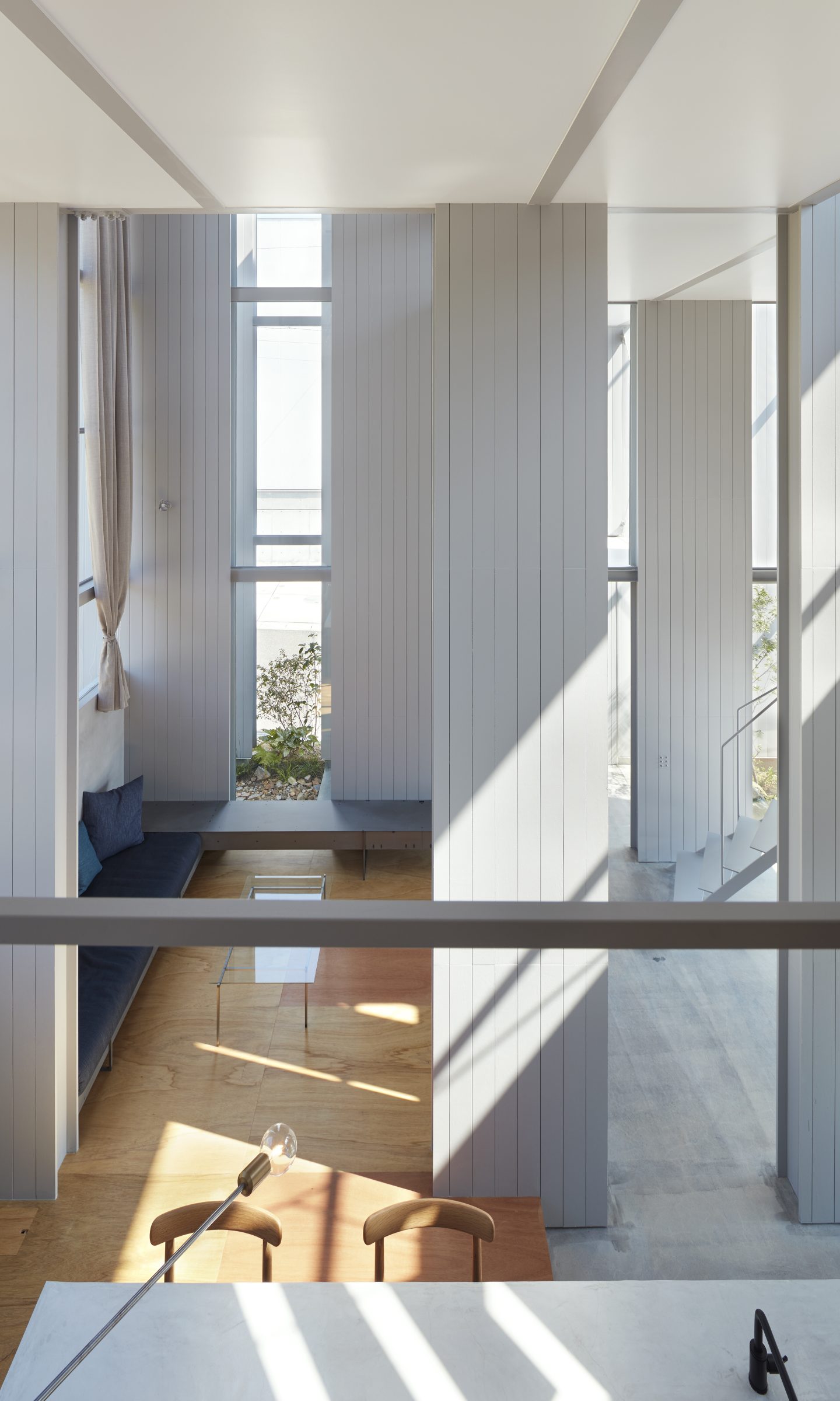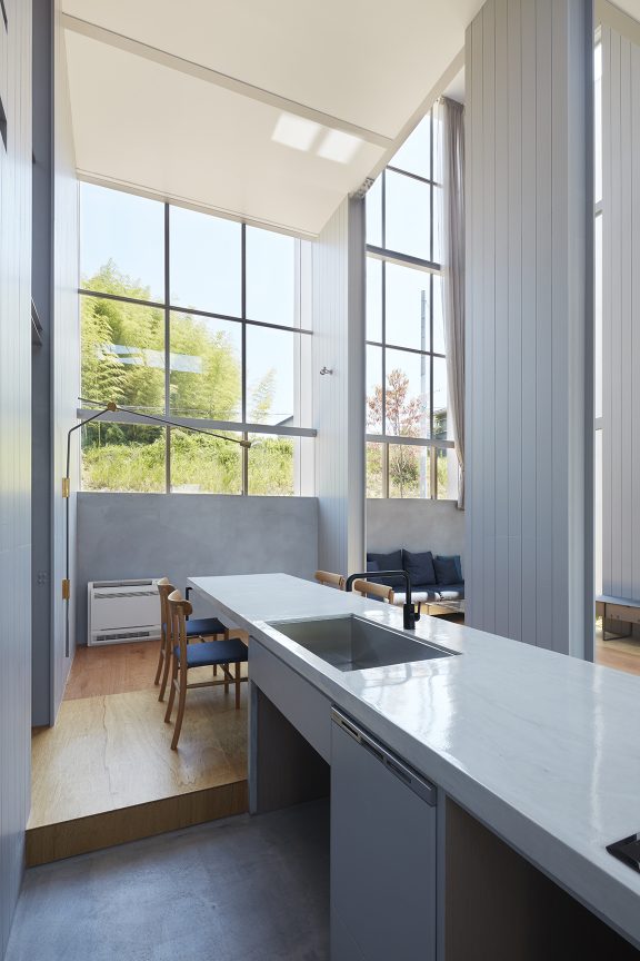 そのわずかな自然環境との関わりを頼りに、敷地に壁を5枚配することで、空間を閉じながら開いていく。内外や部屋同士は壁によって分節されながら、大きな開口によってつながり、ひとつの場所に分節と連続が同居し始める。向こう側と、またその向こうの空間が、今いる場所からあらゆる方向へと距離をつくり、どこまでも続いていくような錯覚に陥る。その「どこまでも」という感覚を設計することで、さらに向こう側の空間を想像し始める状態が生まれた。そして、自然に対して感じたのと同様の「スケールが解らない」という大きさが存在し始める。