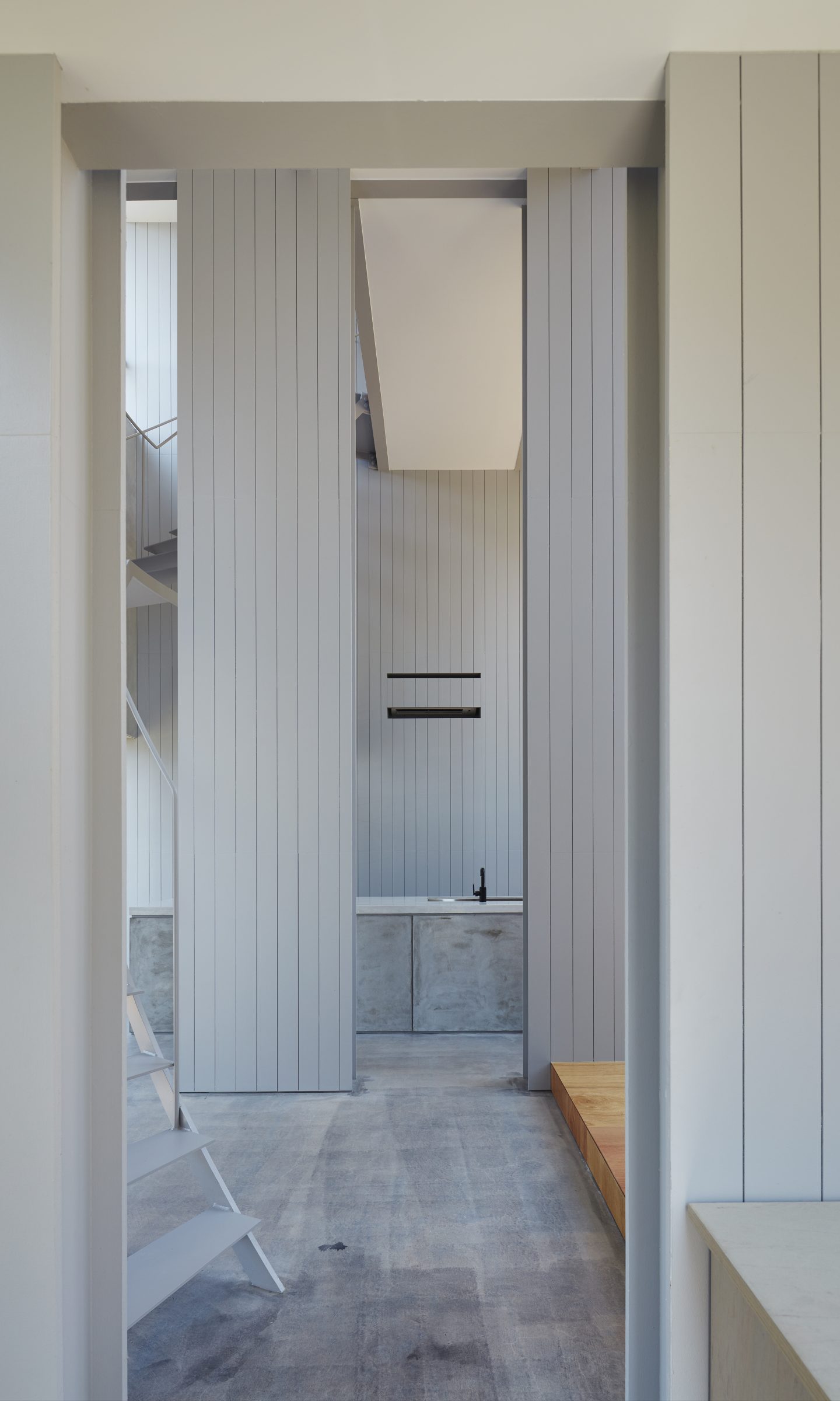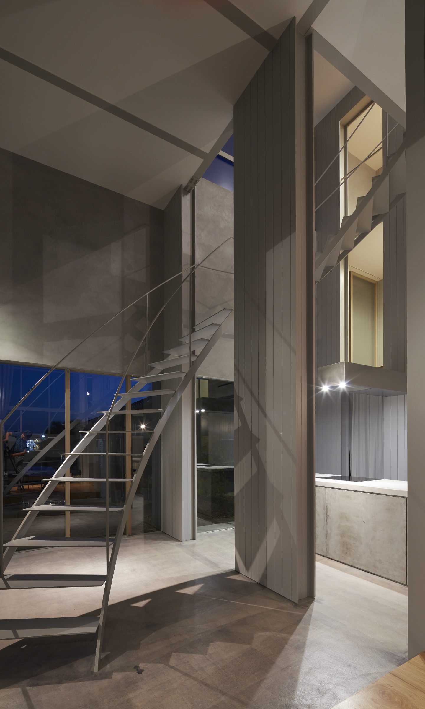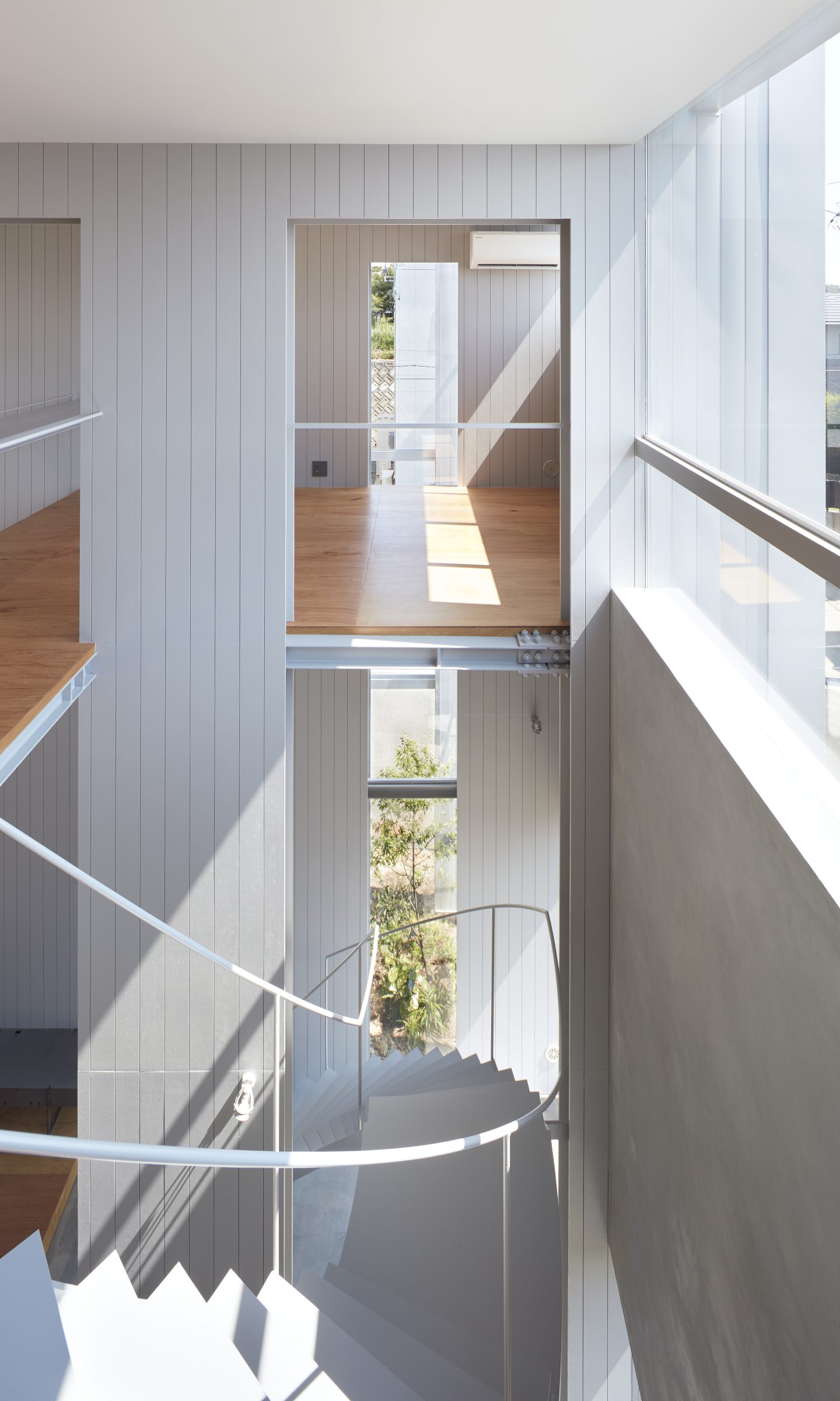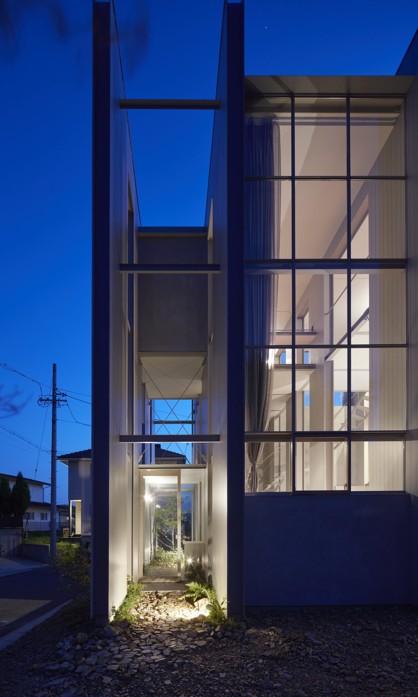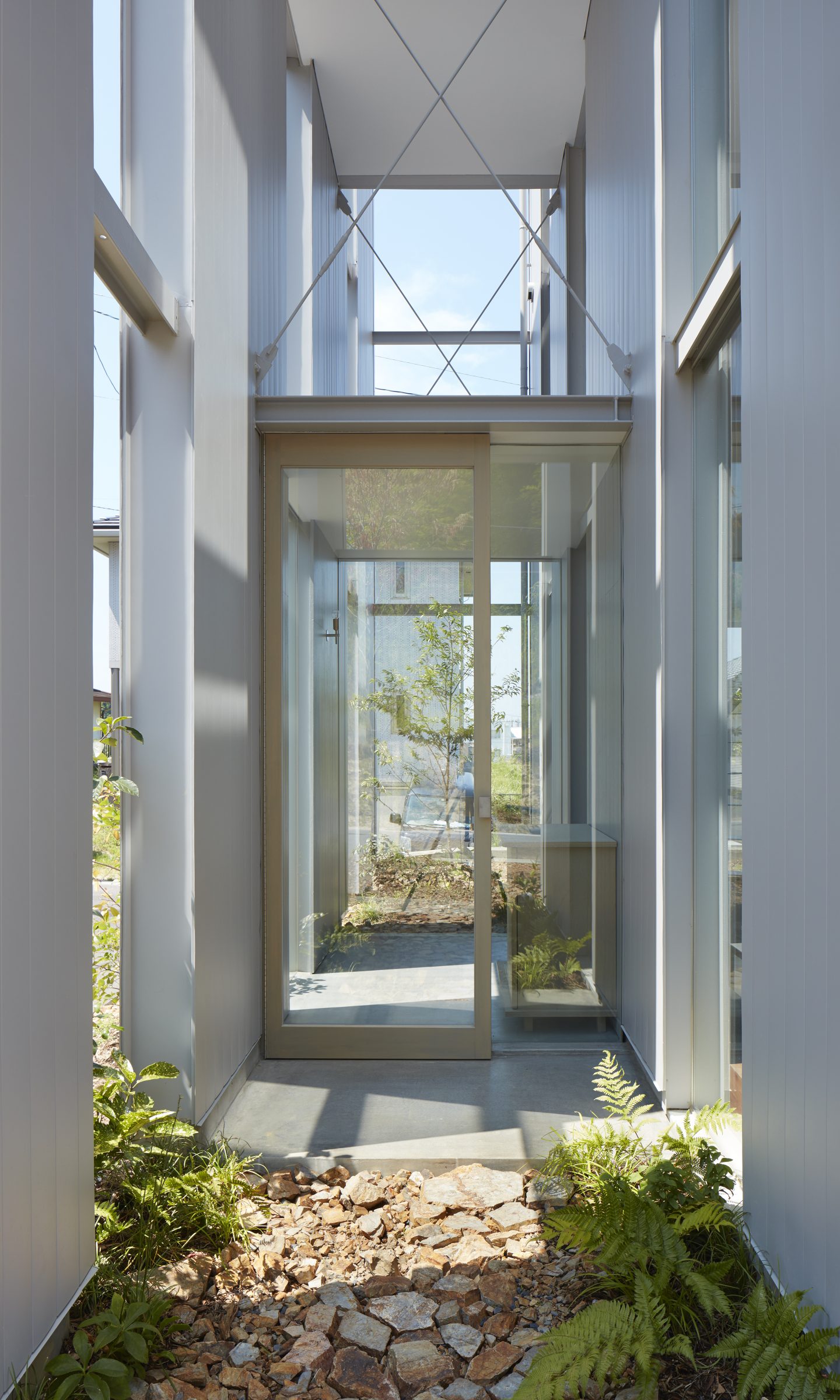 そのわずかな自然環境との関わりを頼りに、敷地に壁を5枚配することで、空間を閉じながら開いていく。内外や部屋同士は壁によって分節されながら、大きな開口によってつながり、ひとつの場所に分節と連続が同居し始める。向こう側と、またその向こうの空間が、今いる場所からあらゆる方向へと距離をつくり、どこまでも続いていくような錯覚に陥る。その「どこまでも」という感覚を設計することで、さらに向こう側の空間を想像し始める状態が生まれた。そして、自然に対して感じたのと同様の「スケールが解らない」という大きさが存在し始める。