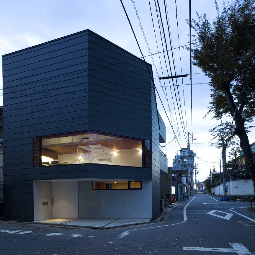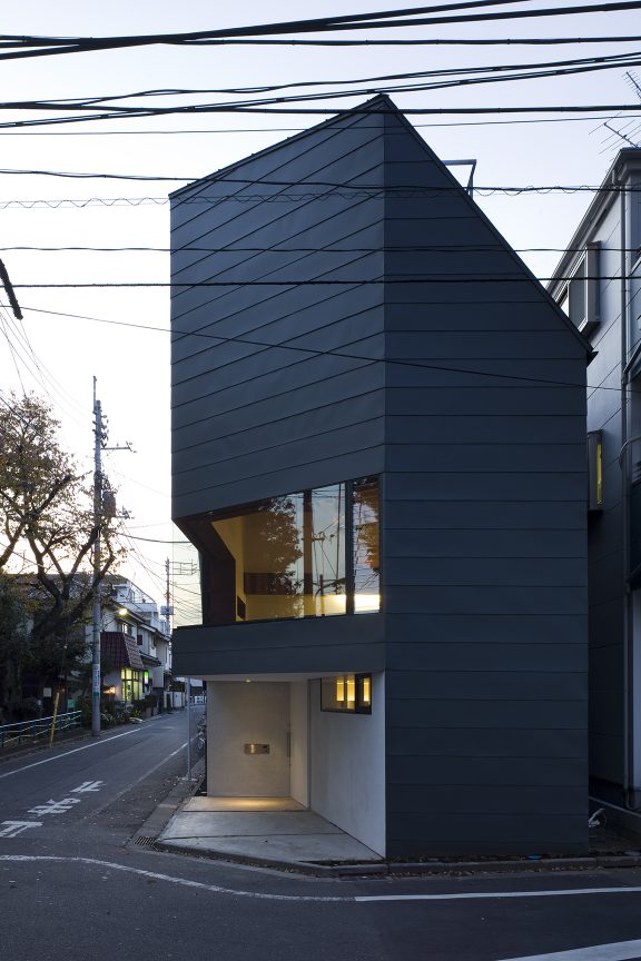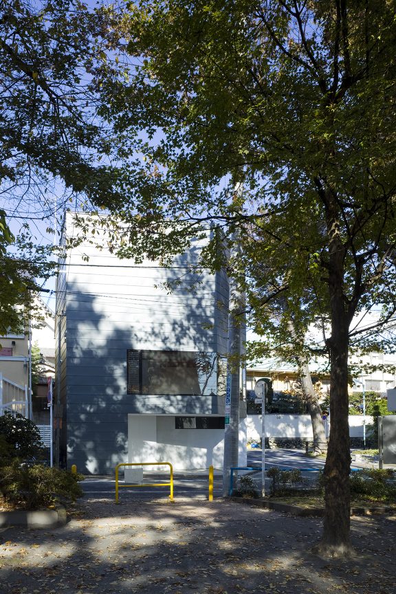 敷地は、東京都板橋区の住宅地の一画に位置する15坪の小さな角地にあります。南側には道路を挟んで公園があり、四季を感じることのできる環境が約束されています。ここに夫婦と子供1人と祖母と犬1匹の家族が楽しく生活するための明るく広がりのある住宅が求められました。小さな敷地ですが、公園までもが自分の敷地であるかのような、そんなおおらかな場所を持つ住宅にしたいと当初から考えていました。