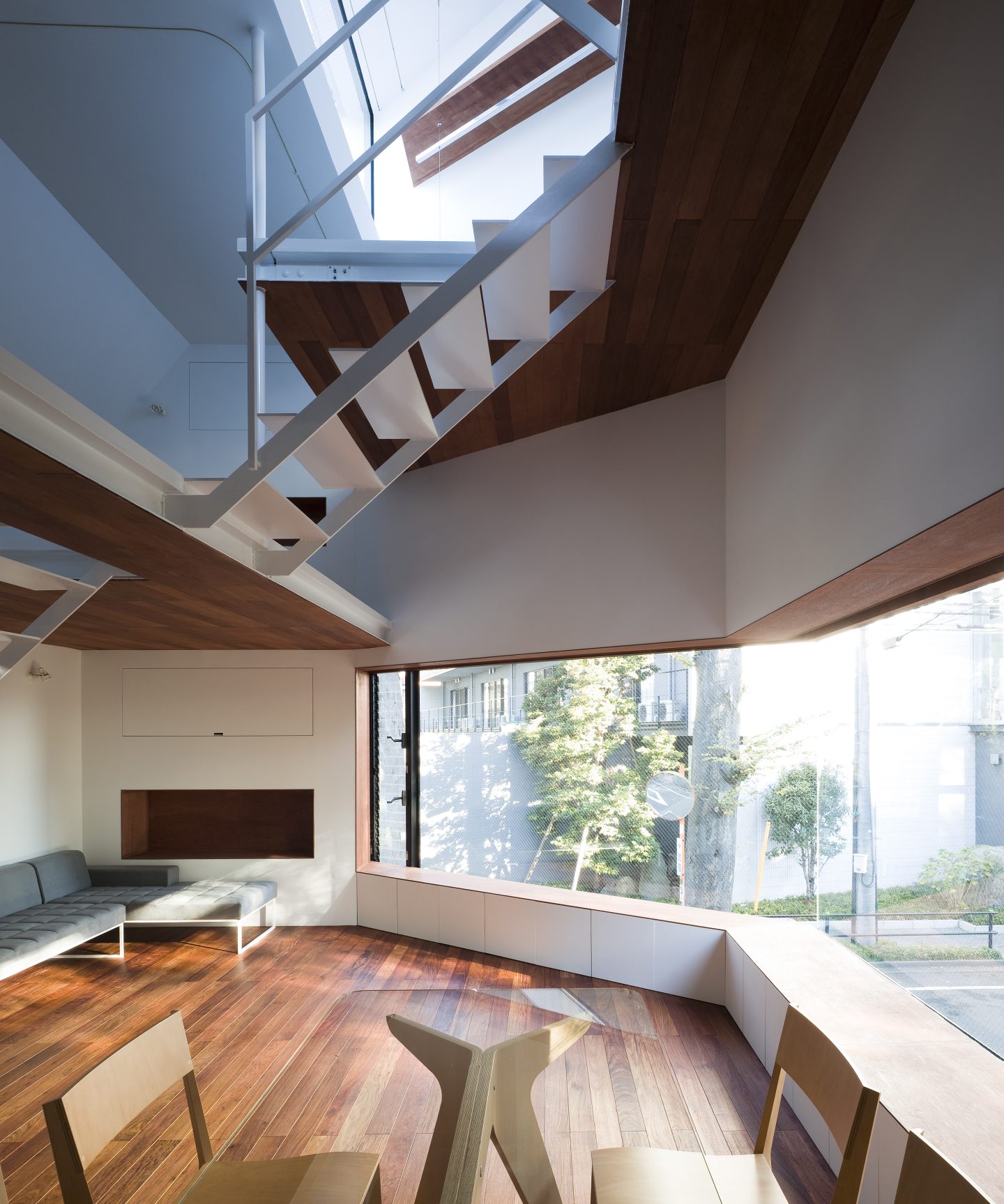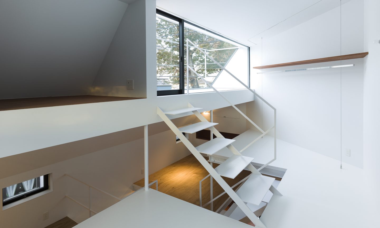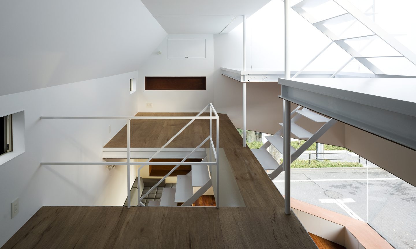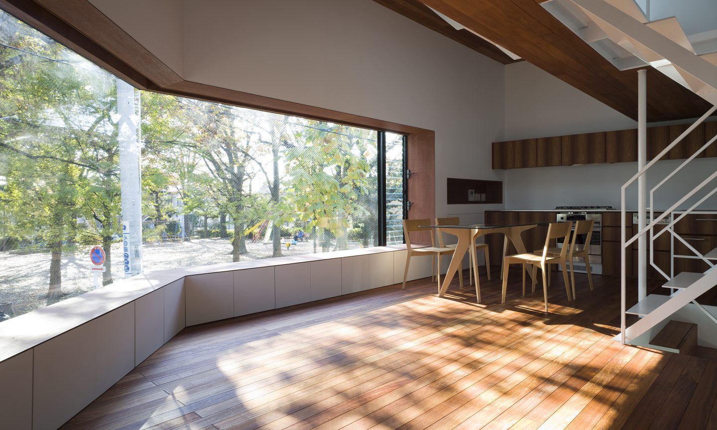 2階のリビングスペースに設けられた大きな出窓のような、ベンチのような、景色を切り取る開口部によって、あたかも公園のベンチに座っているかのような気分を味わうことができ、公園であそんでいる子供たちを眺めたり、スキップフロアによって、家族間のコミュニケーションがはかられたりと、各場所がつながりあっていることで、精神的な安心感のある空気をデザインしています。