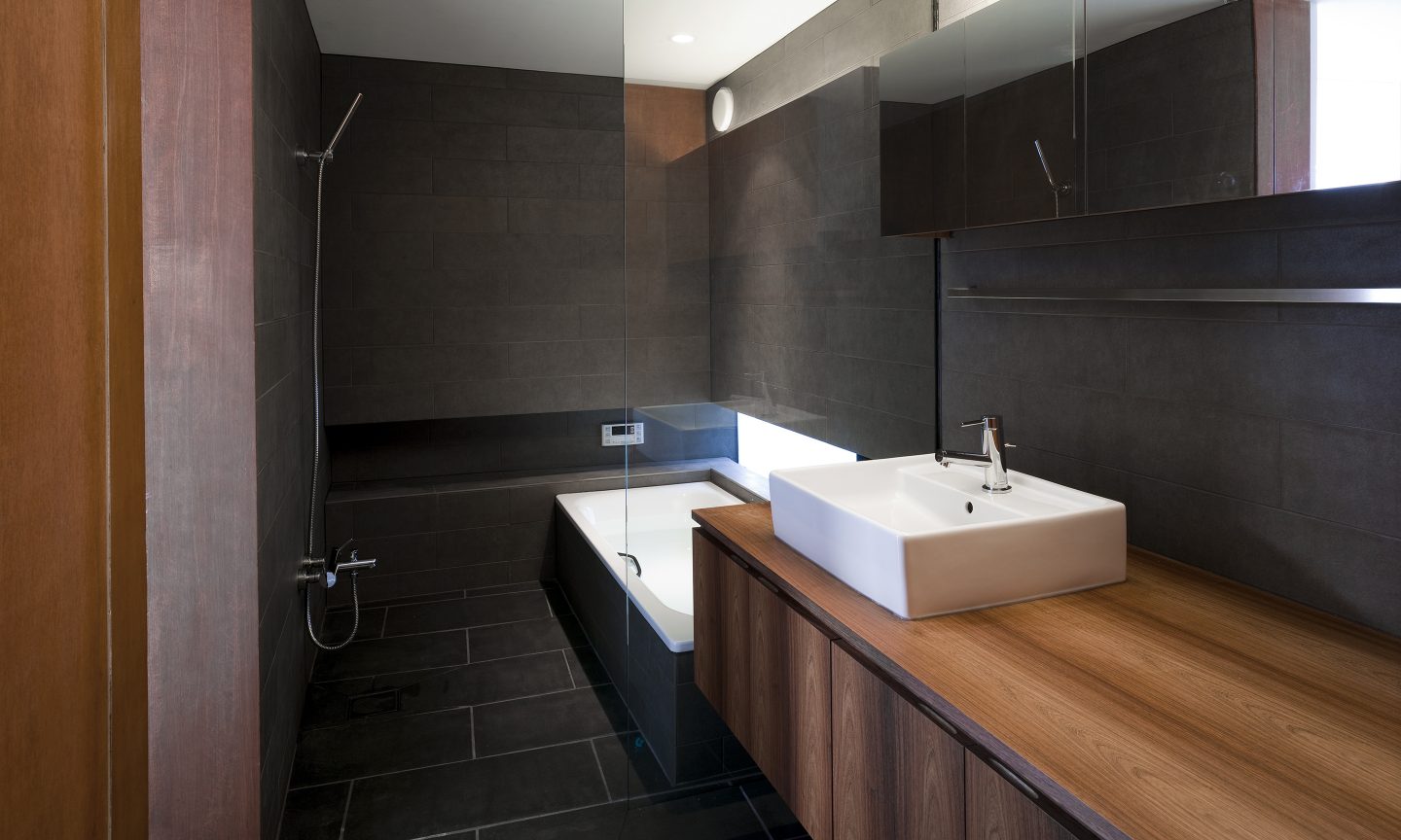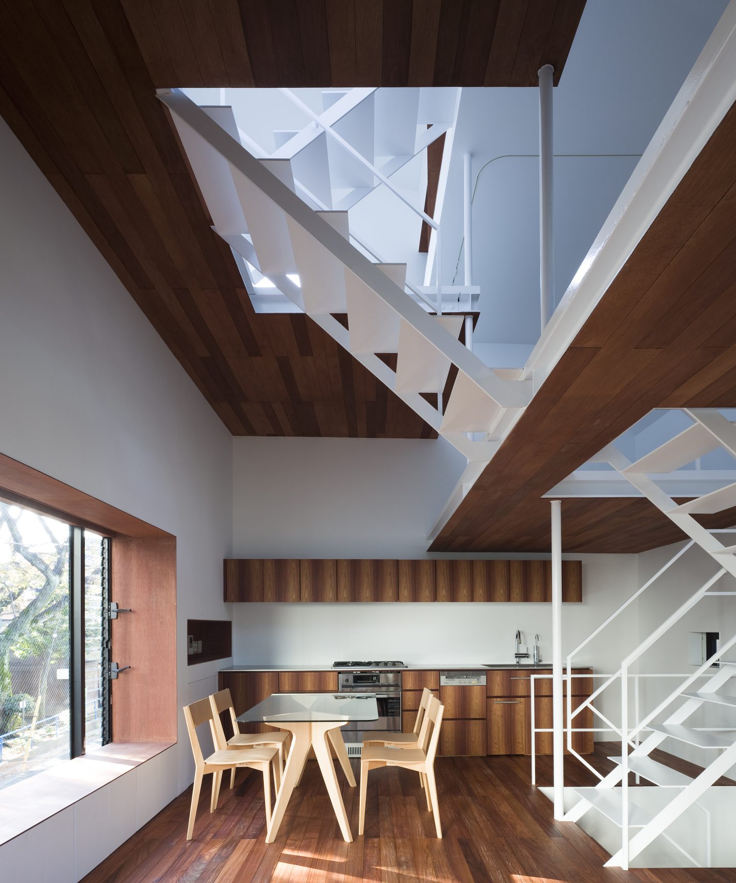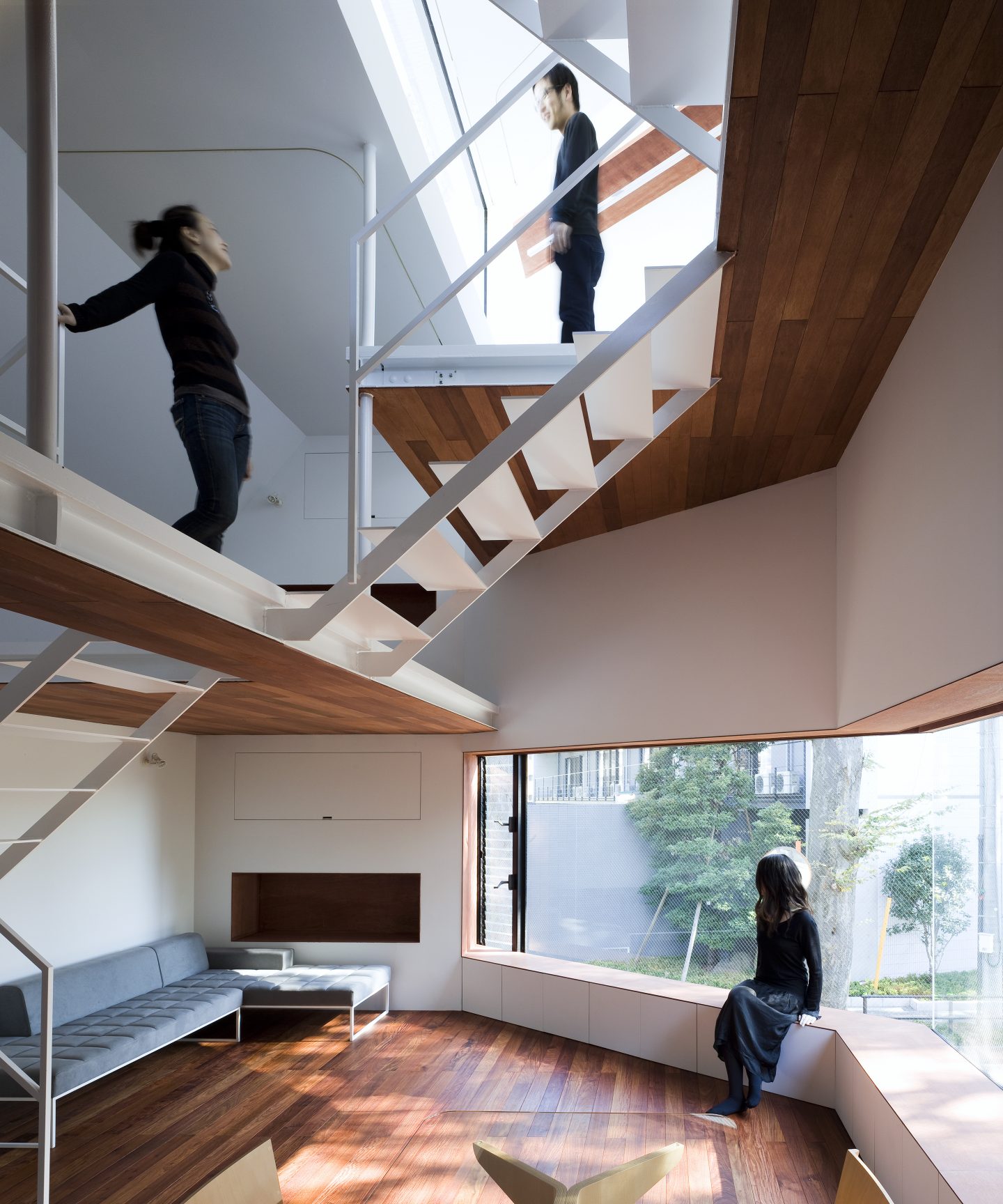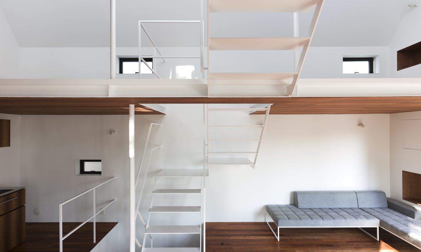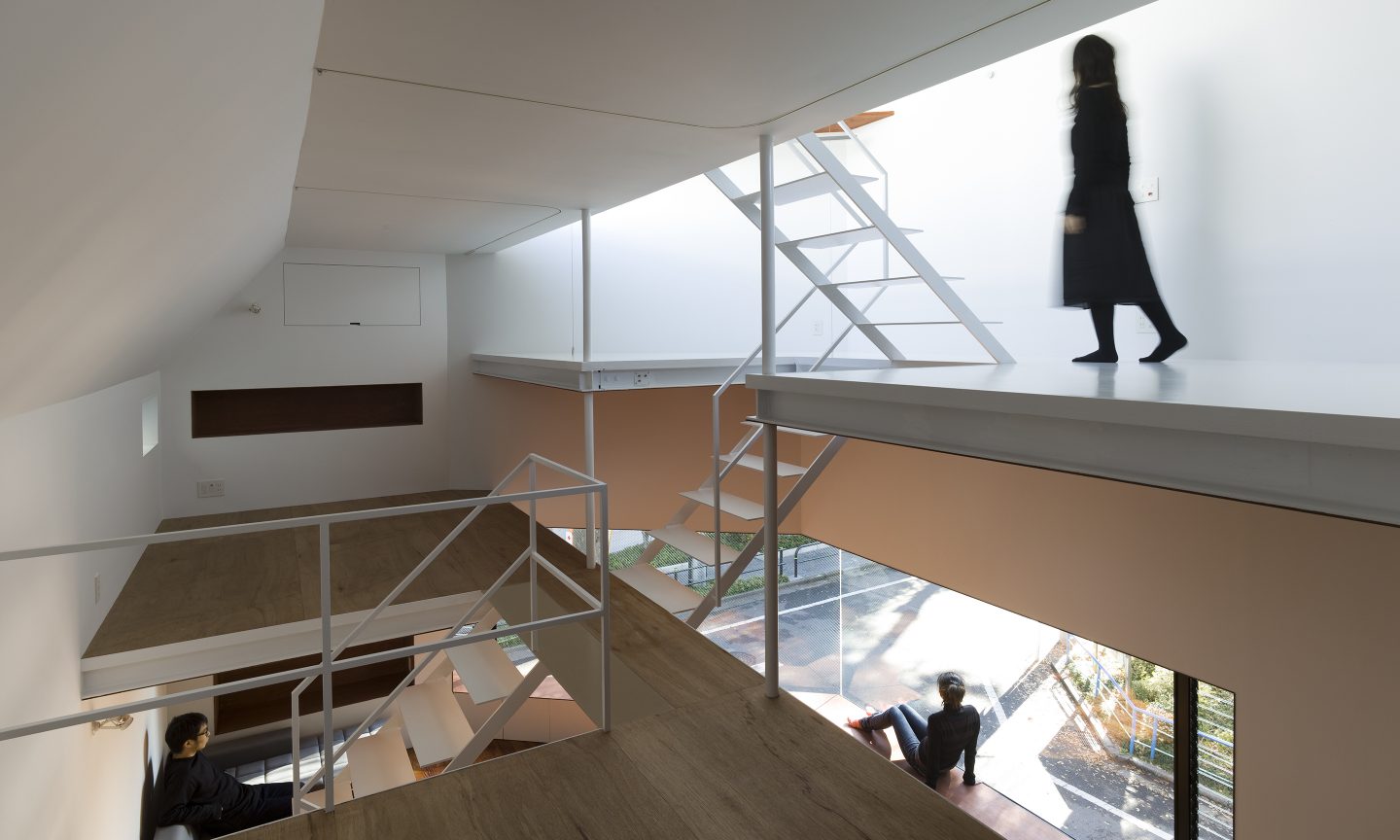 2階のリビングスペースに設けられた大きな出窓のような、ベンチのような、景色を切り取る開口部によって、あたかも公園のベンチに座っているかのような気分を味わうことができ、公園であそんでいる子供たちを眺めたり、スキップフロアによって、家族間のコミュニケーションがはかられたりと、各場所がつながりあっていることで、精神的な安心感のある空気をデザインしています。