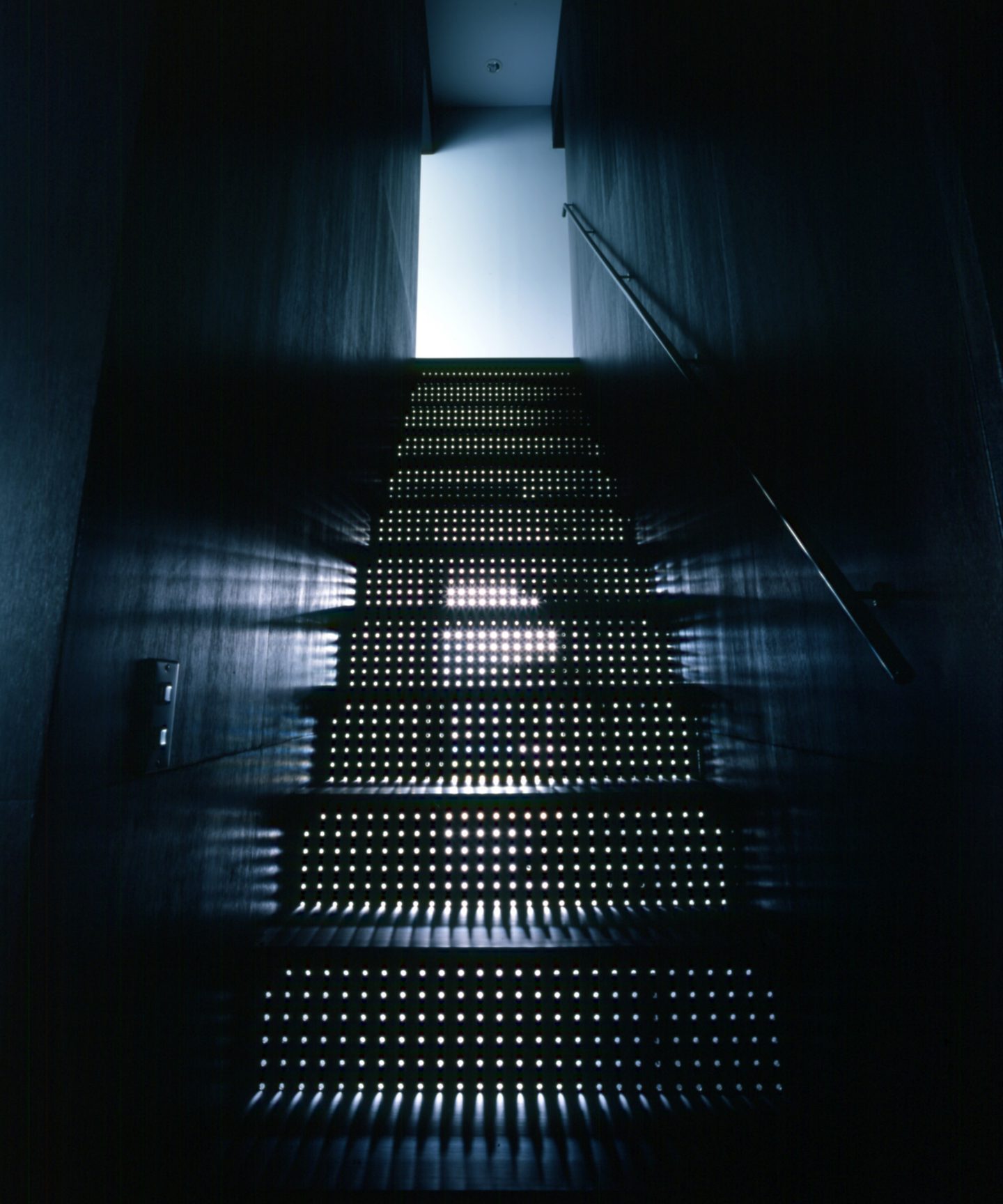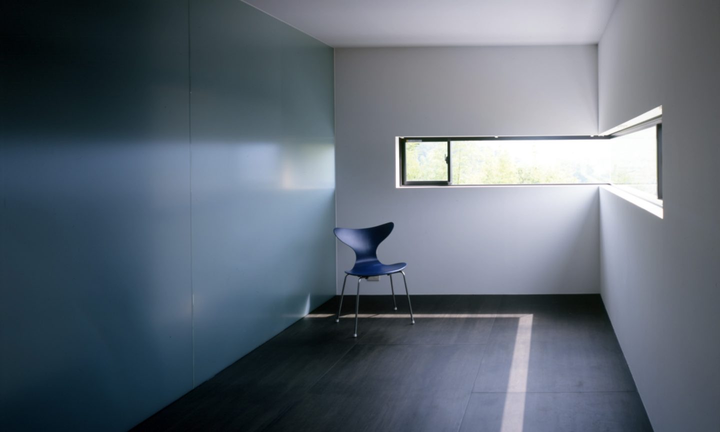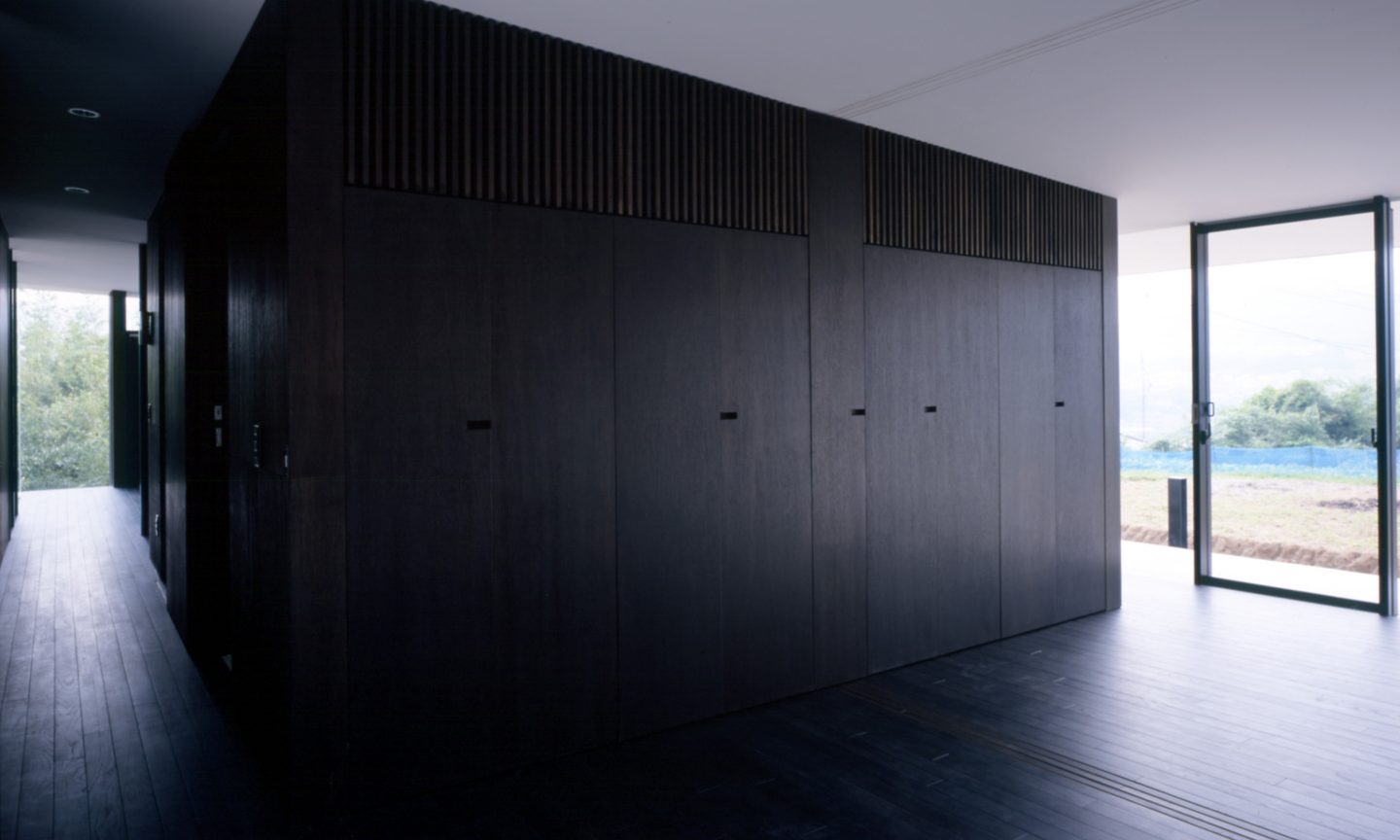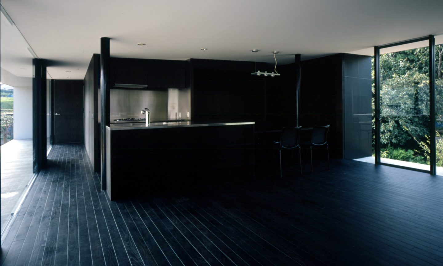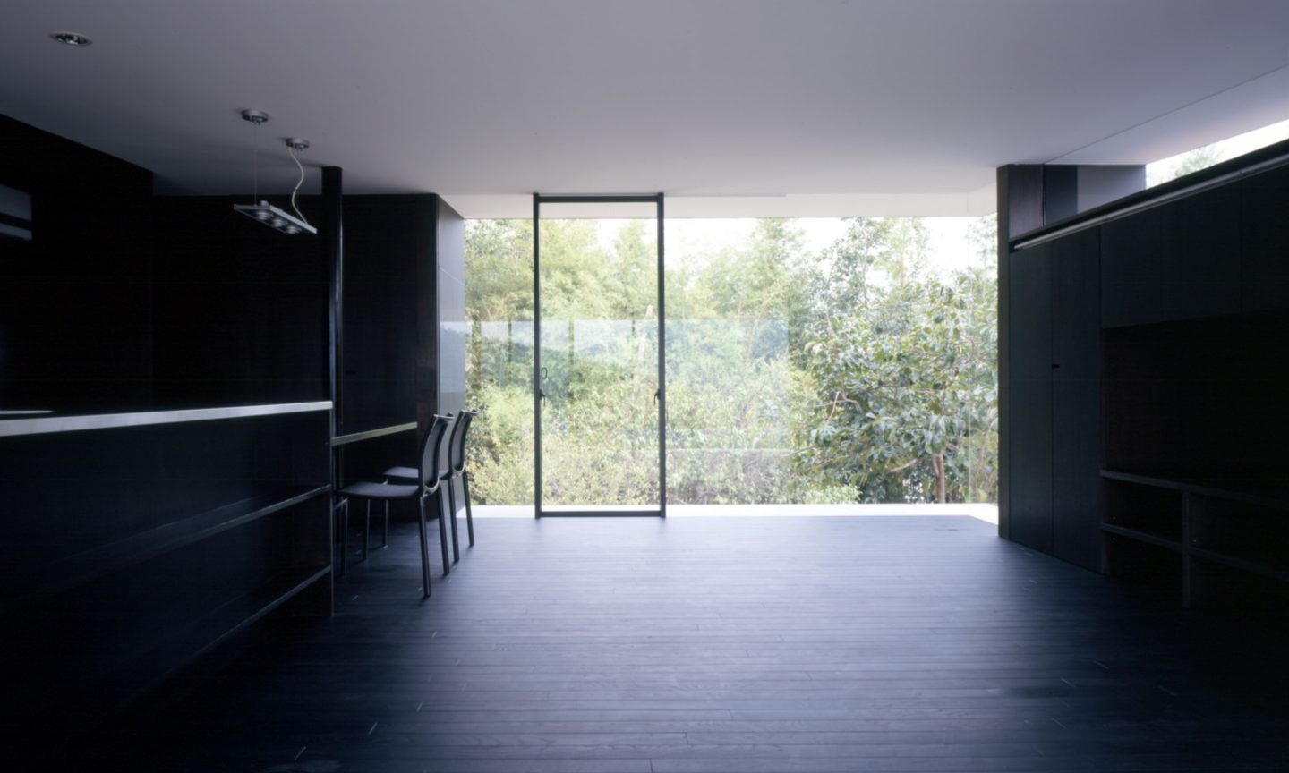 1Mほど上がったフロアレベルからの南側への眺望の環境は良好なものとなり、見下ろす地盤面の意識を遠ざけることで、周囲の木々や眺望を内部に引き寄せる事を意図している。このような外部との関係性の模索の中で生まれた浮き床の建築によって外の風景を意識的に結びつけることの出来る住宅を目指した。