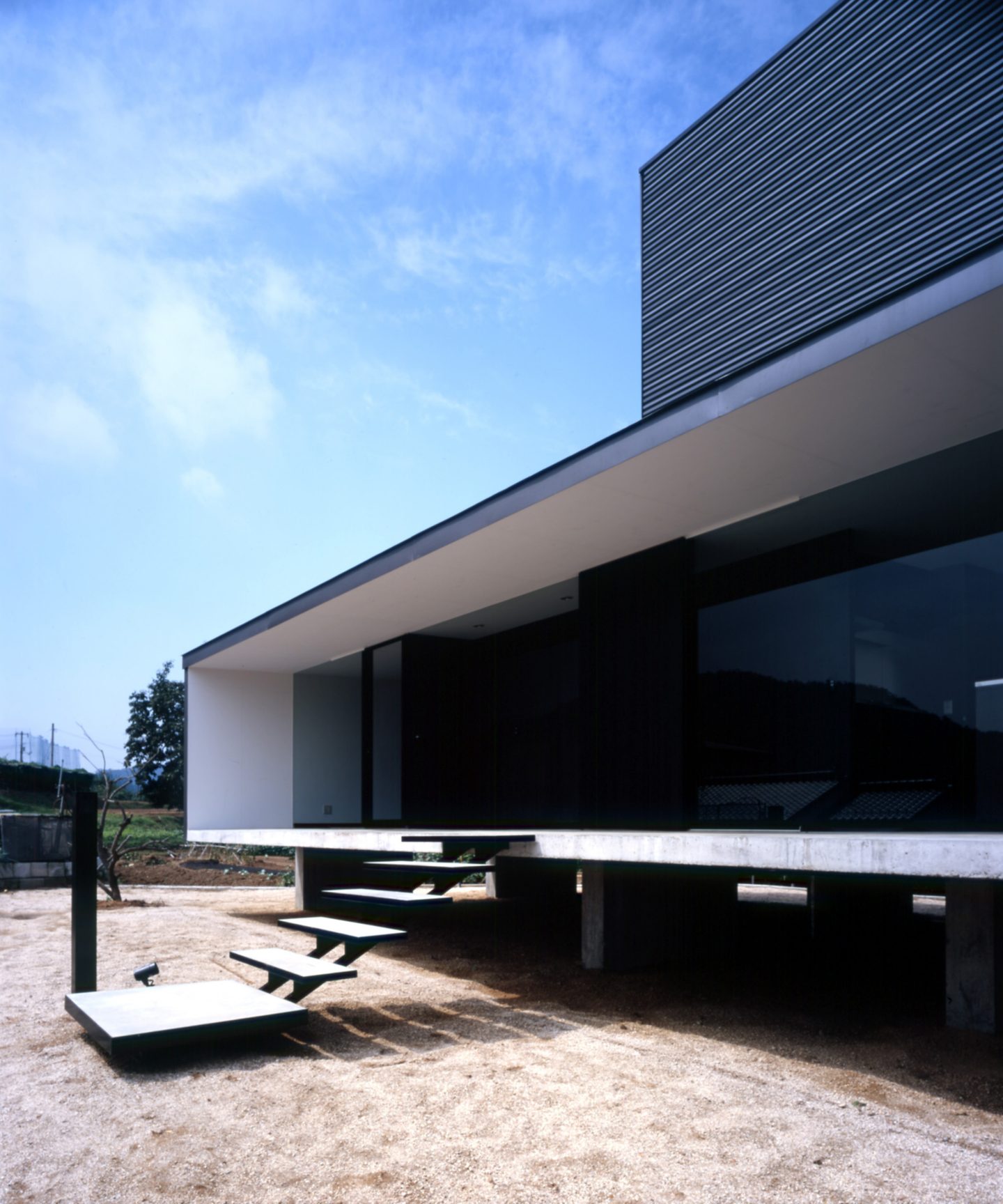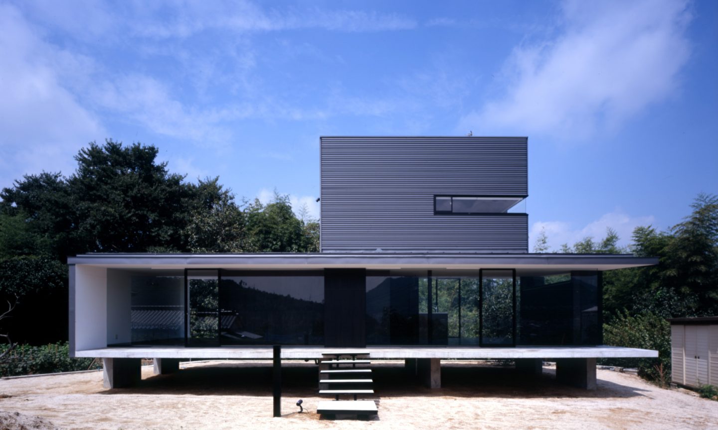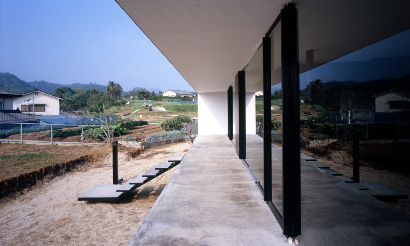 この建物は、広島市中心部より車で40分ほどの距離に位置する呉市焼山の小高い丘の上の畑の中に立っている。車一台がやっとの細い小道を上がればそこはまるで別荘地の様に自然に守られた、のどかな風景に囲まれた敷地である。北から南に向かって緩やかな勾配のある敷地は、北側は竹林の緑地帯、南側へは焼山市内を見下ろすことが出来る。