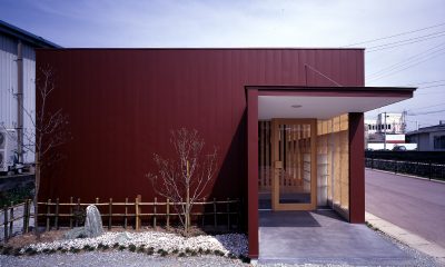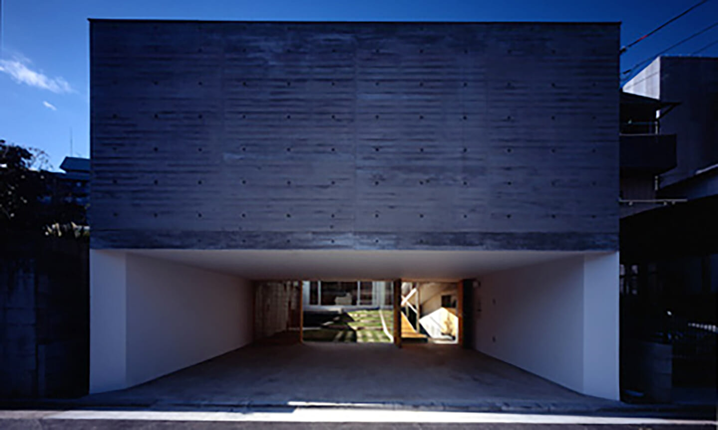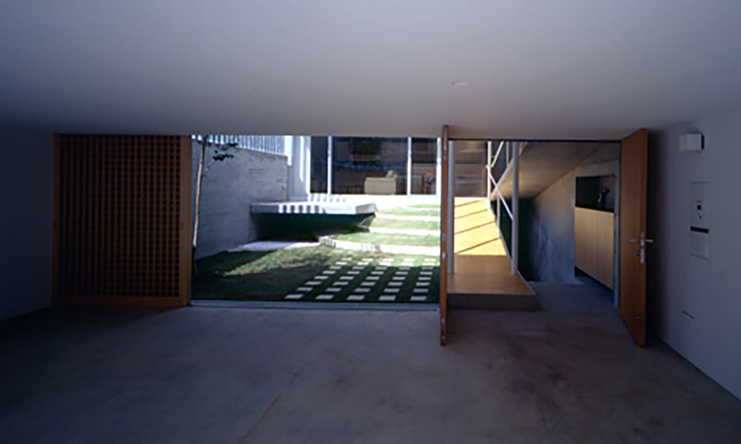 広島市にある家族3人のための住宅である。周辺は住宅が密集した市街地で、閉鎖的な様相をなしている。敷地の北-東-西の3方向には隣の建物が迫り、南側は幅員4mの道路に面している。また、その向かい側の土地にはポンプ施設が建っており、視覚的に敷地のそとに対して開くことが出来ない状況にあった。
