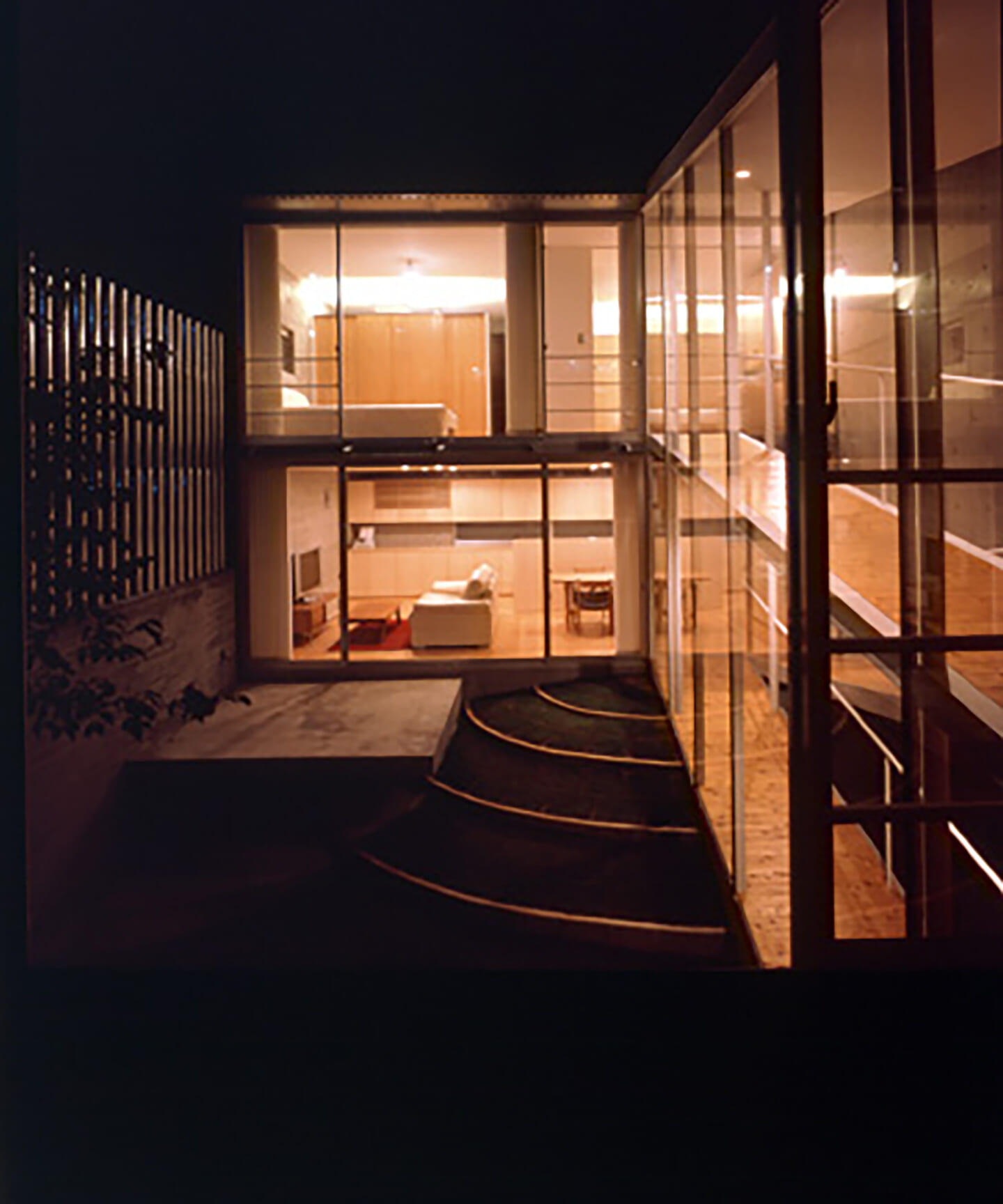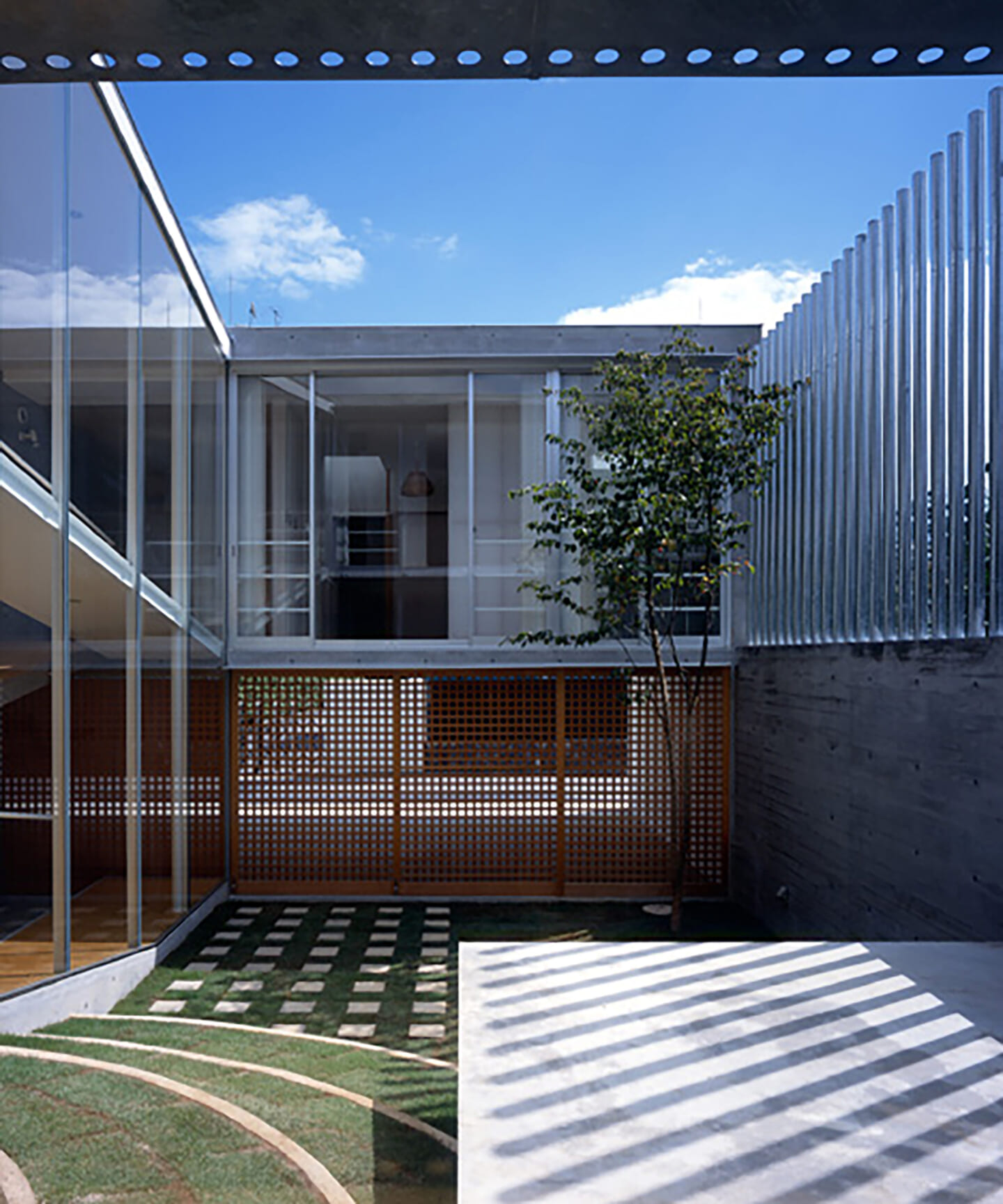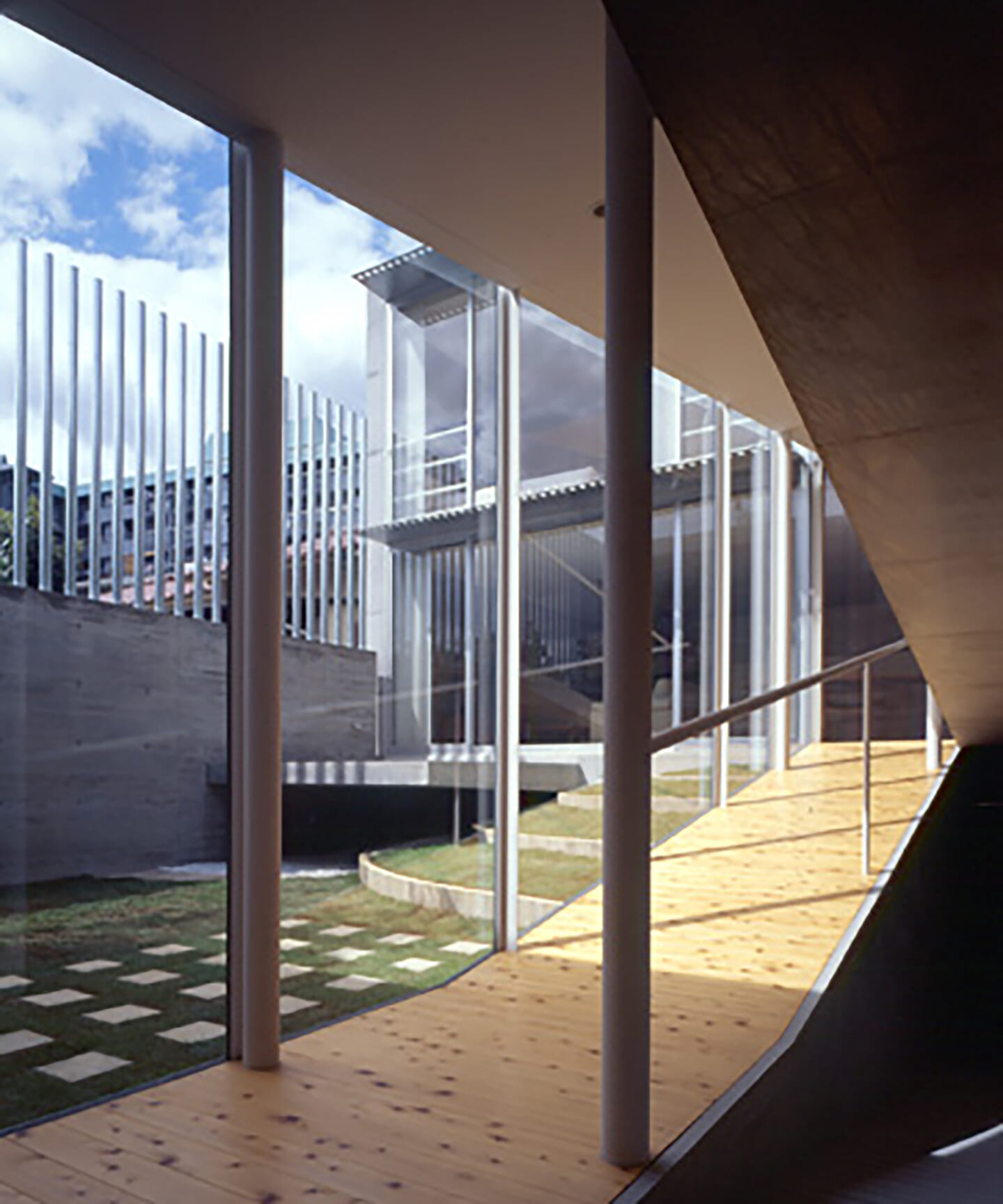このような、都市的な過酷な敷地の状況に対して、自然の恩恵をどのようにして生活に引き込むことができるかがテーマだった。そこで南北に2つの建物を配置し、外部空間をサンドウィッチさせ内側に開くコートハウス型式を採用することとした。内庭にある自然を生活の中により効果的に引き込む為、南北のヴォリュームにはリビング、水回り、寝室を別々のレベルで交互に計画し、それらをスロープによって立体的に連結させた。つまり、スロープはこれら別々の行為を連続させ、生活を成り立たせるバイパスとして存在している。