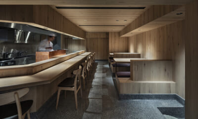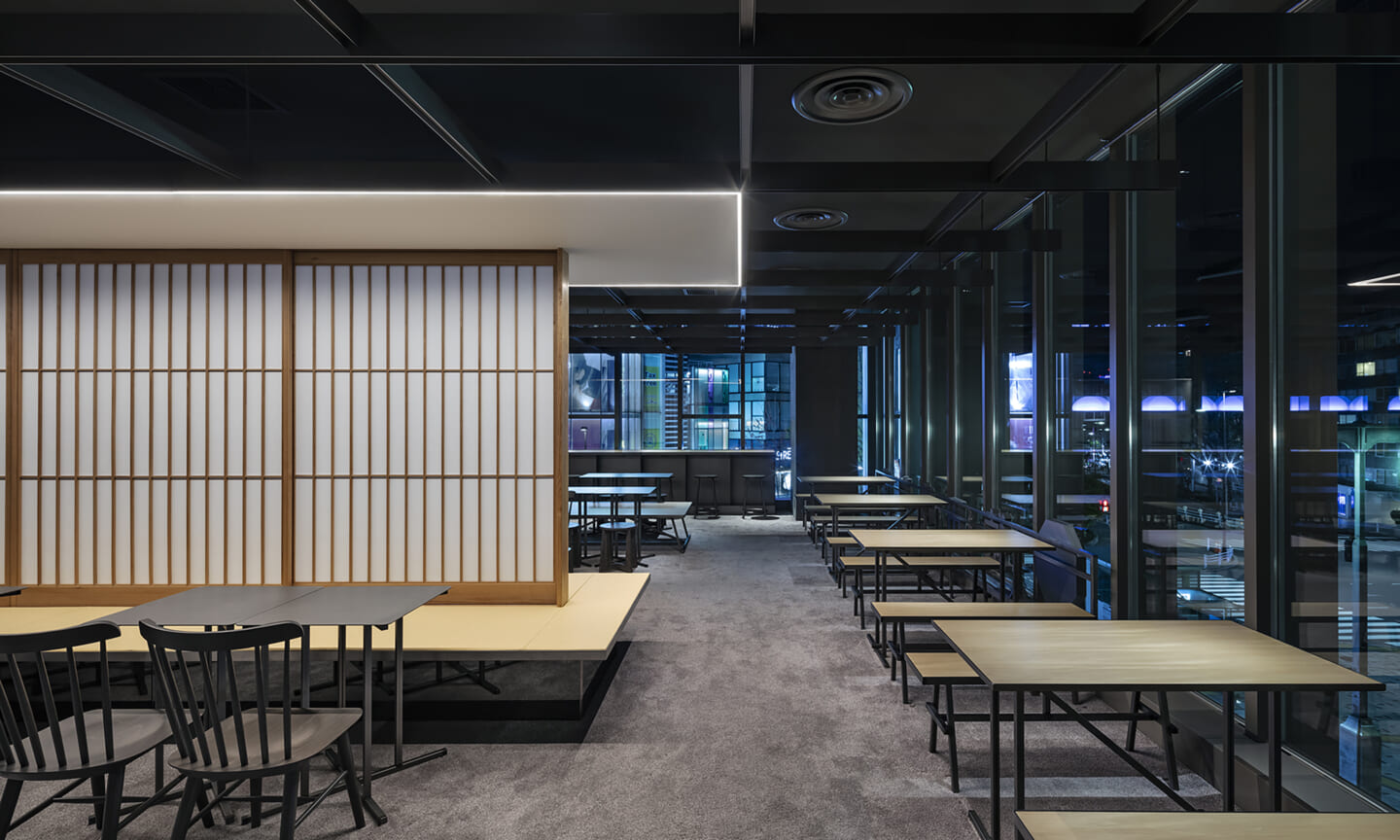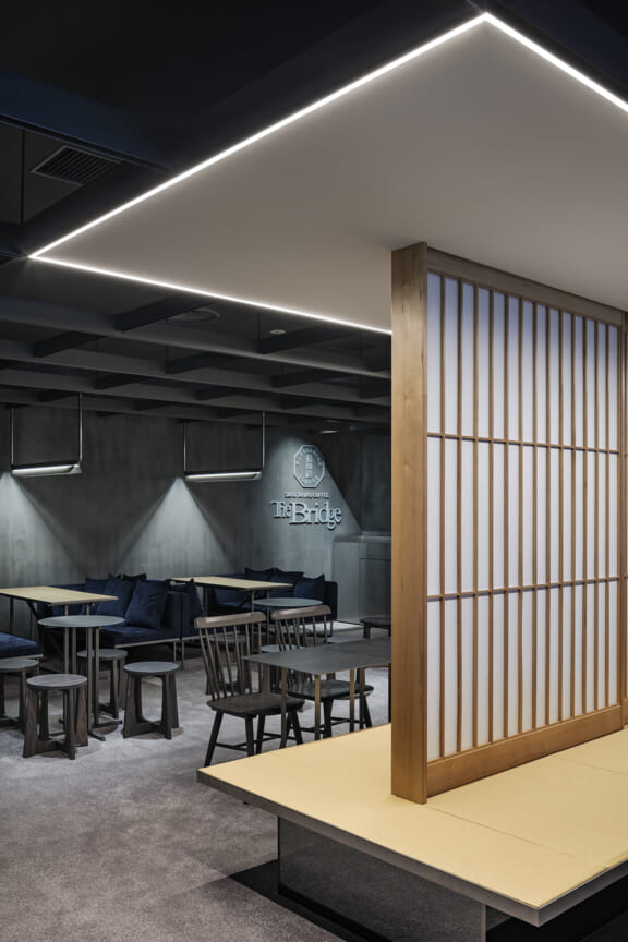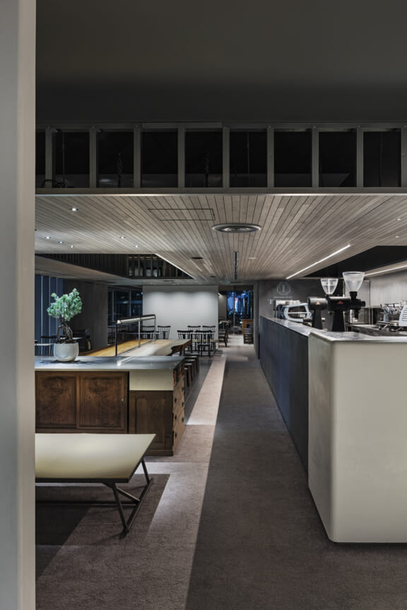 ある部分では軒をつくり天井を低くすることで落ち着きや奥行きを生み出し、路地空間を散歩するかのように回遊可能な平面計画とした。窓から見える街の電光掲示板や大型モニターの情報を現代の日本風景と捉え、あえて遮ることはせず受け入れ、現代の借景と捉えた。昔の空間には存在しなかった、鉄、カーペットなどの現代の材料が加わり、過去と現在が同居する、「現代の日本らしい珈琲屋」となった。