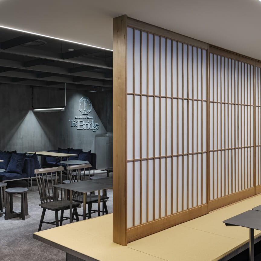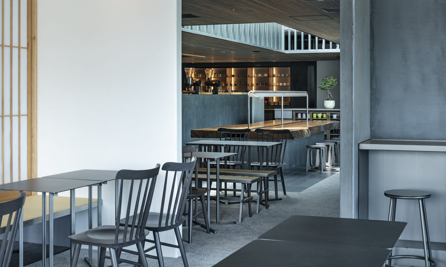 「小津安二郎の世界観」。オーナーの大塚さんが話した言葉の意味を探求することから猿田彦珈琲the bridge原宿駅店プロジェクトがはじまった。そのぼんやりとした言葉の中にある、要素を分解、採集を行い、我々はフレームインフレーム、和のグリッドという言葉を抽出した。小津映画の特徴たるシーンの背景にフレームが配置される構成によって、ふと気づくと日本の昔の風景を自然と連想させる原理がそこには潜んでいることに気づいた。