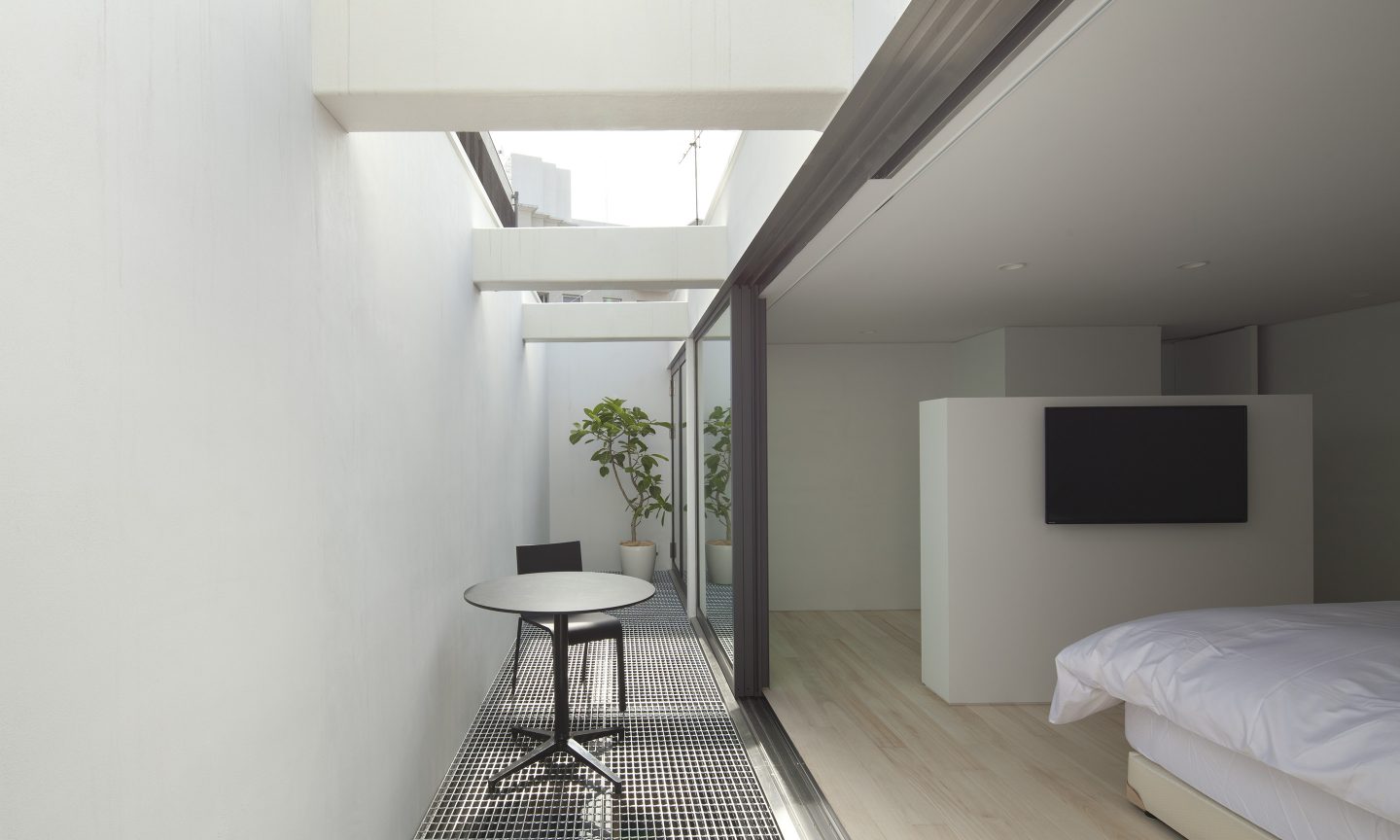 前面道路は狭く、周囲には住宅やマンションが立ち並び、北西側に向いたその敷地には、十分な採光も期待できません。そこで、この住宅では建物の中に、縦と横のvoidを差し込み、プライバシーの中に外部環境を差し込む操作を行いました。縦方向のvoidは、3階のグレーチングバルコニー越しに自然光を2階のリビングに届けます。ベランダに面した全面ガラス建具は、その向こうにある壁までを部屋として感じさせる効果に寄与します。2階と3階の間には構造材を化粧したグリッド状の梁があり、内部には照明器具が埋め込まれています。