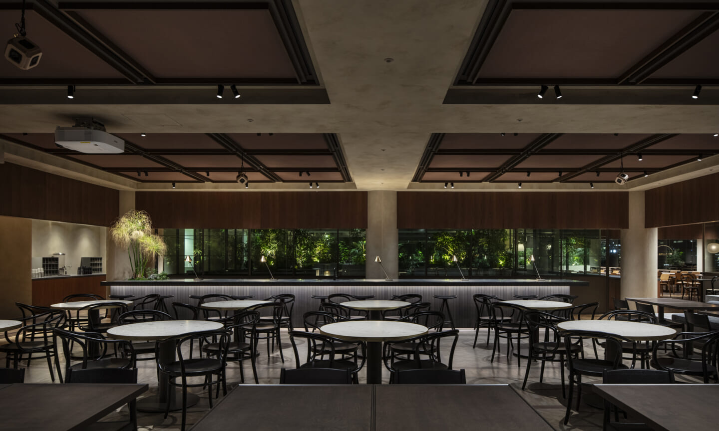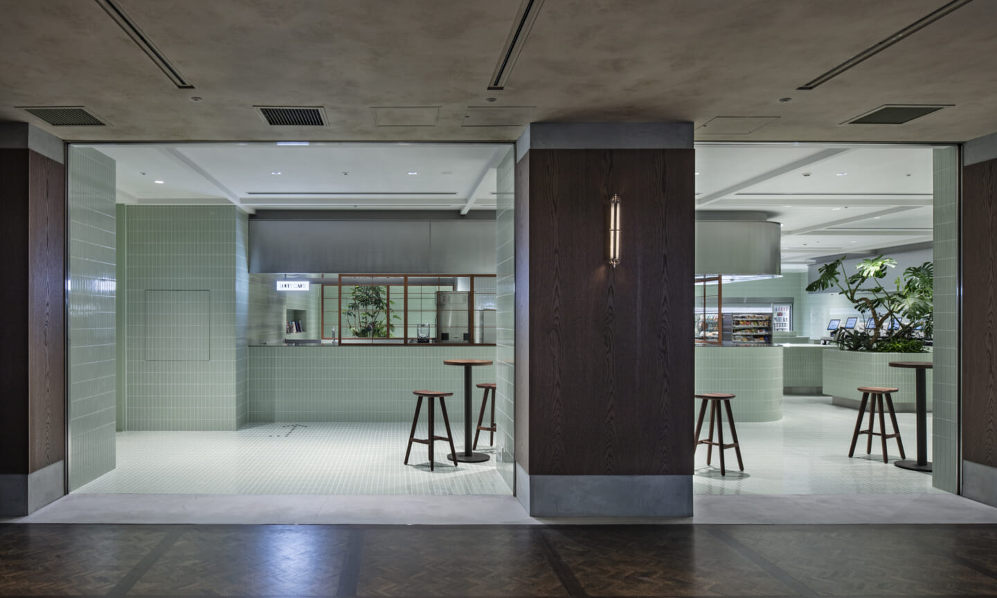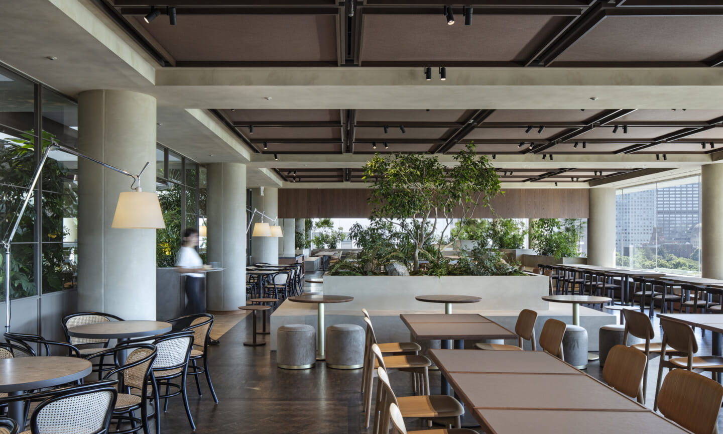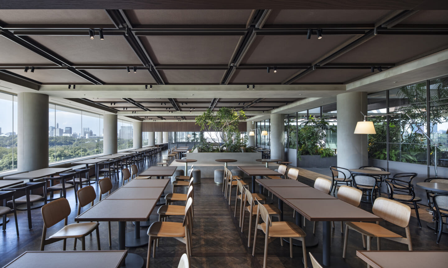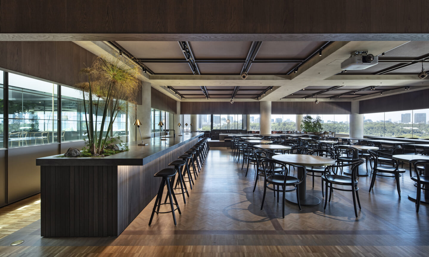 1938年に竣工した第一生命保険本館は、近代建築における金字塔的な建築で、その後の長い歴史の中で改修を重ねつつも今尚その風格が受け継がれている稀有なオフィスビルである。また建築だけでなく内部空間の仕上げやディテールからもデザインへのリテラシーの高さが窺える空間であった。吹き抜けの立体的な構成、吹出口の機能を兼ねた天井グリット、寄木細工の床、窓から望むお堀端の素晴らしい景色。現地を訪問した際に印象的だった“既存の価値”を受け継ぎ、最大限に活かす形で “働く場”と”休息の場”が同居する空間にしたいと考えた。食堂として使われていた単調なワンフロア空間を、食事をしたり、仕事をしたり、会話を楽しんだりと、思いおもいに過ごせる公園のような場にする為フロア全体をひとつの街と捉え計画を始めた。大きな構成として「コンビニ、キッチン、食堂」の3つのエリアに分け、EVホールから各エリアを繋ぐ主動線を、ライブラリーとして設計。共用部の意匠を踏襲したオーセンティックな木質空間と、ライブラリーの両サイドに配したキッチンやコンビニのライトグリーンのタイル仕上げで、既存の重厚感と新たな空間との明確なコントラストを作り視認性を高めた。また、ボタニカルガーデンと名付けた植物と自然光が心地よいアトリウム空間は、既存のトップライトと吹き抜けの部分をガラス+フレームで囲い温室のように設え “働く場”から”休息の場”へとマインドセットするための食堂全体のエントランスとして機能するように配置。食堂エリアは、パークオフィス、カフェテラス、バー、グラウンドテラスなどテーマと個性を与えてゾーニングし、敢えて明確な道は設けずに公園に面したオープンテラス席、公園のベンチ、といったように街にある様々なシュチュエーションが混ざり合う多様な空間性を地形のような床の起伏や家具や照明によって構成していった。320坪の大空間は、エリア毎に設けた垂れ壁の操作や既存床の塗り分けでリズミカルに文節しながらも緩やかな繋がりをつくり公園のようなおおらかさと様々な使われ方を許容する場となった。既存の価値を受け継ぎ新たなデザインに変換し“次にバトンを繋げること”が歴史ある建築の改修の手法として、また求められたウェルビーイング(持続的な幸福)な場の在り方としても相応しいと考えた。
