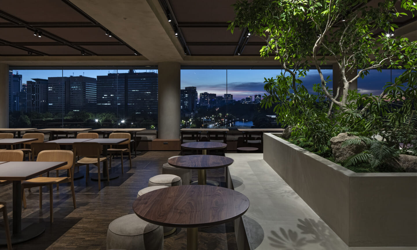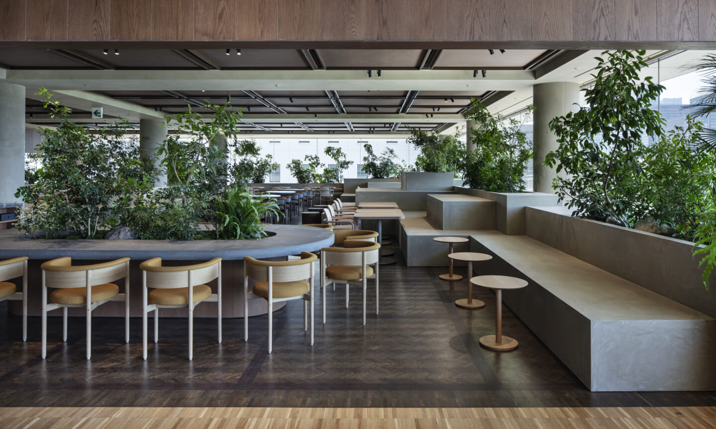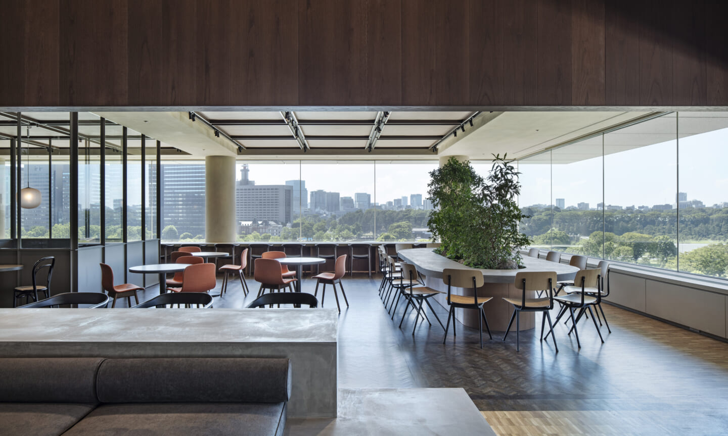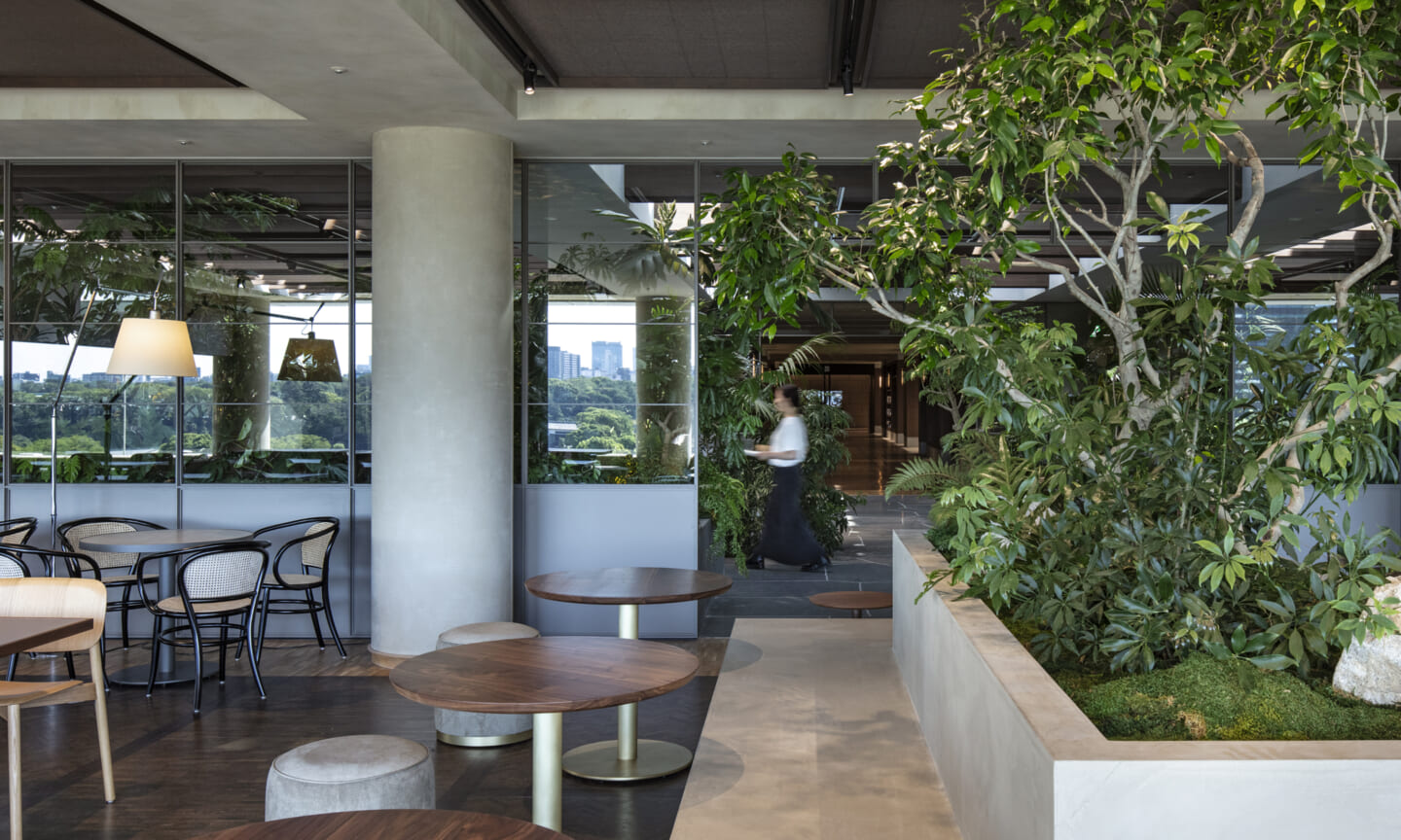 1938年に竣工した第一生命保険本館は、近代建築における金字塔的な建築で、その後の長い歴史の中で改修を重ねつつも今尚その風格が受け継がれている稀有なオフィスビルである。また建築だけでなく内部空間の仕上げやディテールからもデザインへのリテラシーの高さが窺える空間であった。吹き抜けの立体的な構成、吹出口の機能を兼ねた天井グリット、寄木細工の床、窓から望むお堀端の素晴らしい景色。現地を訪問した際に印象的だった“既存の価値”を受け継ぎ、最大限に活かす形で “働く場”と”休息の場”が同居する空間にしたいと考えた。食堂として使われていた単調なワンフロア空間を、食事をしたり、仕事をしたり、会話を楽しんだりと、思いおもいに過ごせる公園のような場にする為フロア全体をひとつの街と捉え計画を始めた。大きな構成として「コンビニ、キッチン、食堂」の3つのエリアに分け、EVホールから各エリアを繋ぐ主動線を、ライブラリーとして設計。共用部の意匠を踏襲したオーセンティックな木質空間と、ライブラリーの両サイドに配したキッチンやコンビニのライトグリーンのタイル仕上げで、既存の重厚感と新たな空間との明確なコントラストを作り視認性を高めた。また、ボタニカルガーデンと名付けた植物と自然光が心地よいアトリウム空間は、既存のトップライトと吹き抜けの部分をガラス+フレームで囲い温室のように設え “働く場”から”休息の場”へとマインドセットするための食堂全体のエントランスとして機能するように配置。食堂エリアは、パークオフィス、カフェテラス、バー、グラウンドテラスなどテーマと個性を与えてゾーニングし、敢えて明確な道は設けずに公園に面したオープンテラス席、公園のベンチ、といったように街にある様々なシュチュエーションが混ざり合う多様な空間性を地形のような床の起伏や家具や照明によって構成していった。320坪の大空間は、エリア毎に設けた垂れ壁の操作や既存床の塗り分けでリズミカルに文節しながらも緩やかな繋がりをつくり公園のようなおおらかさと様々な使われ方を許容する場となった。既存の価値を受け継ぎ新たなデザインに変換し“次にバトンを繋げること”が歴史ある建築の改修の手法として、また求められたウェルビーイング(持続的な幸福)な場の在り方としても相応しいと考えた。