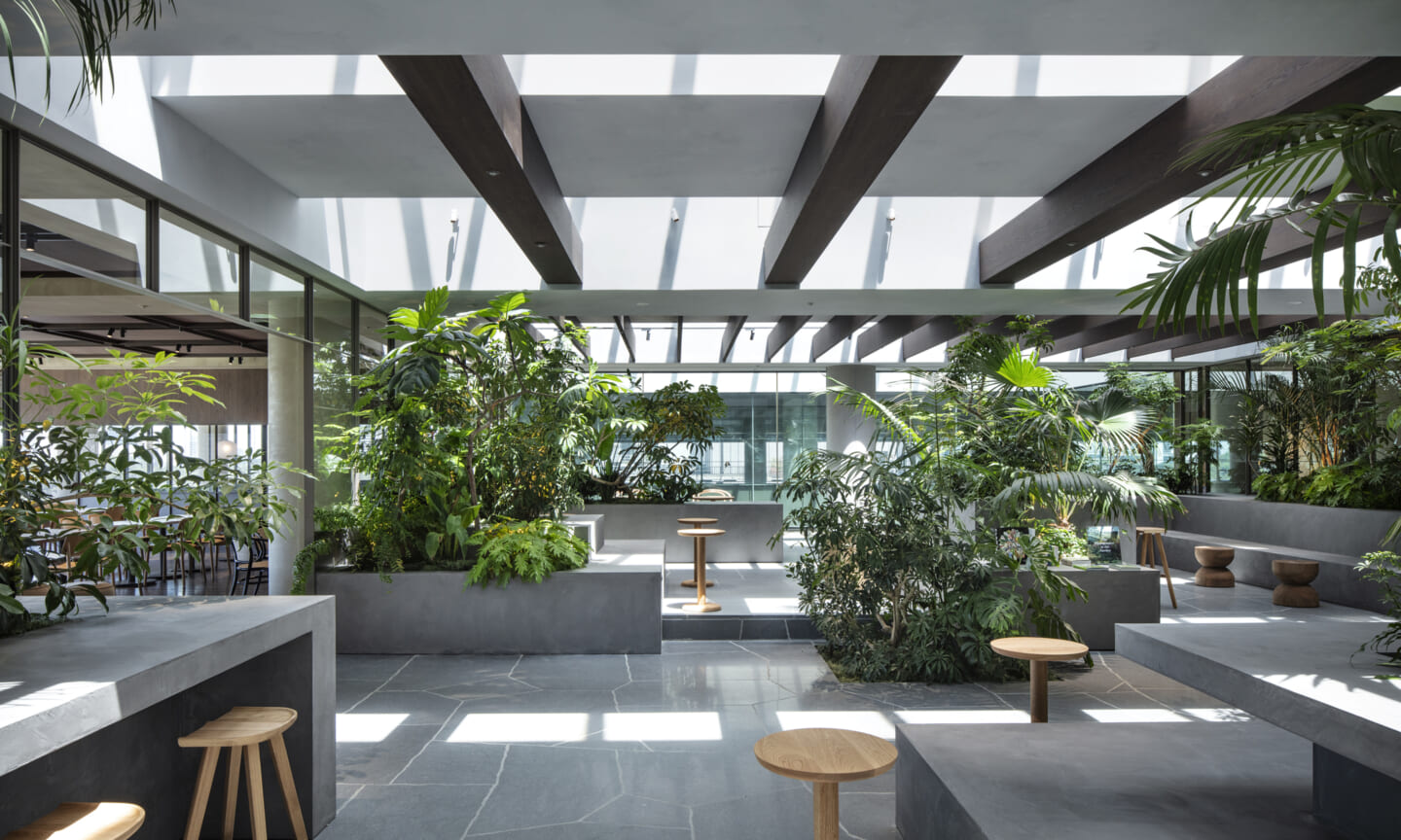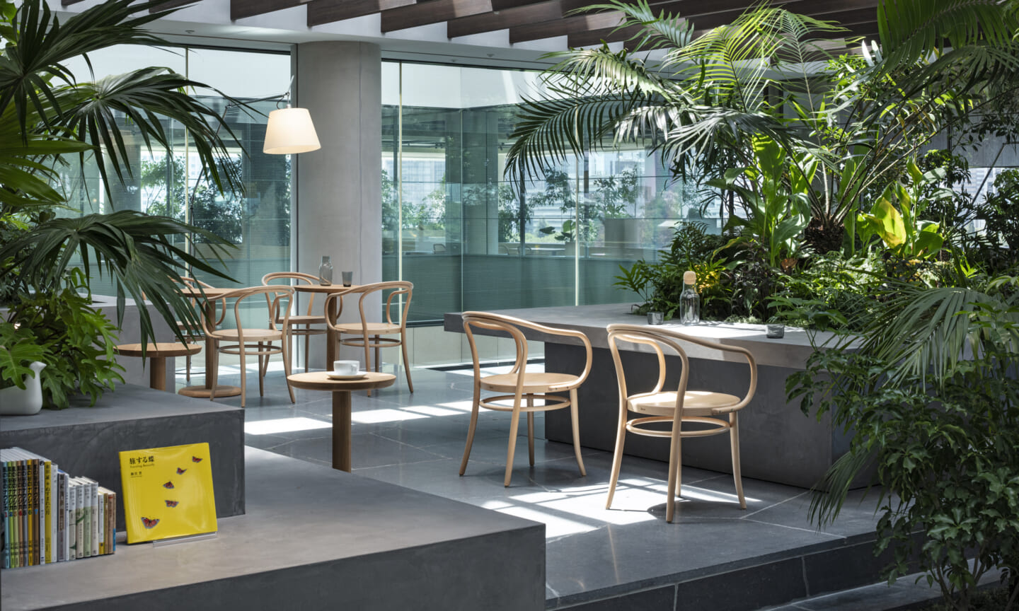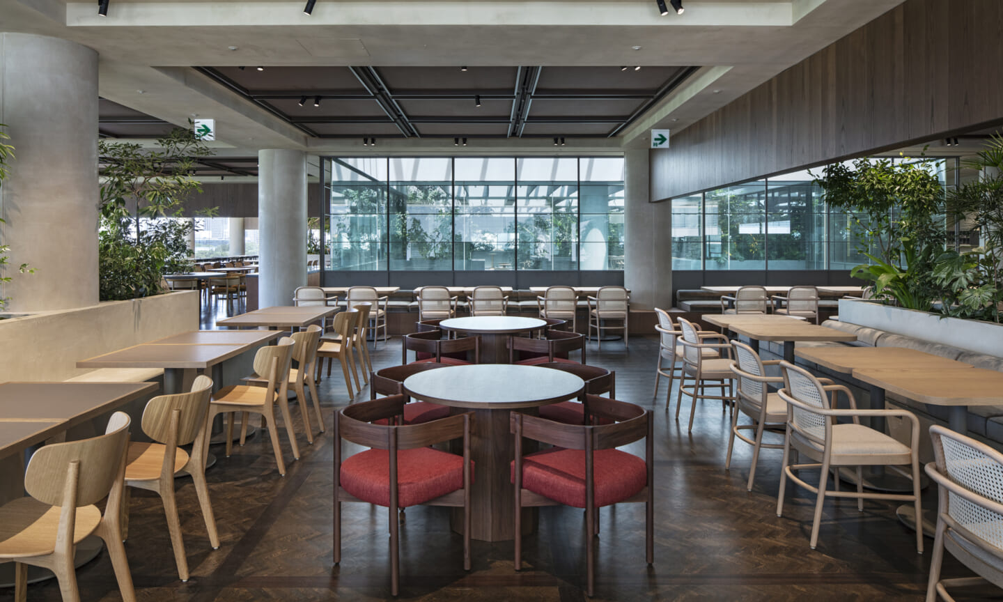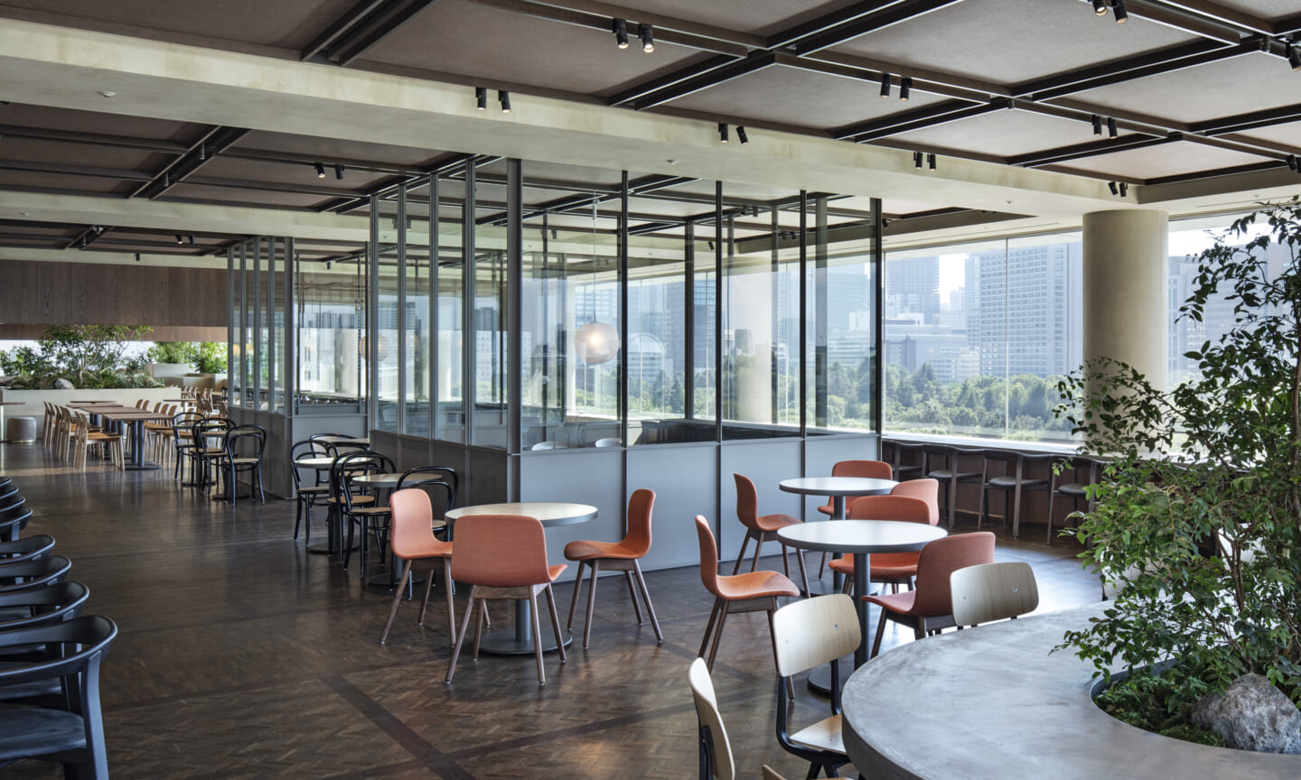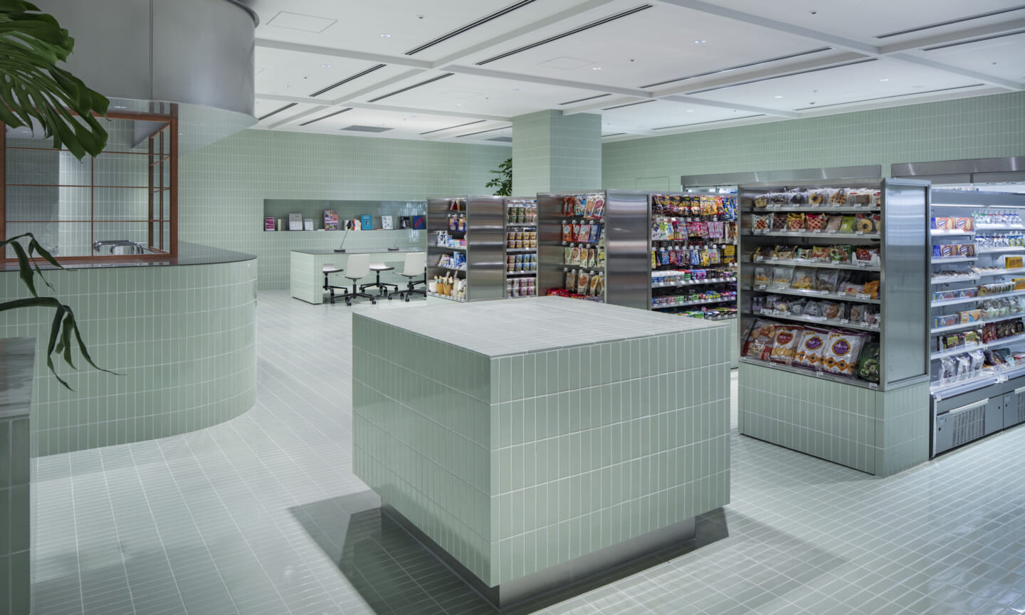 1938年に竣工した第一生命保険本館は、近代建築における金字塔的な建築で、その後の長い歴史の中で改修を重ねつつも今尚その風格が受け継がれている稀有なオフィスビルである。また建築だけでなく内部空間の仕上げやディテールからもデザインへのリテラシーの高さが窺える空間であった。吹き抜けの立体的な構成、吹出口の機能を兼ねた天井グリット、寄木細工の床、窓から望むお堀端の素晴らしい景色。現地を訪問した際に印象的だった“既存の価値”を受け継ぎ、最大限に活かす形で “働く場”と”休息の場”が同居する空間にしたいと考えた。食堂として使われていた単調なワンフロア空間を、食事をしたり、仕事をしたり、会話を楽しんだりと、思いおもいに過ごせる公園のような場にする為フロア全体をひとつの街と捉え計画を始めた。大きな構成として「コンビニ、キッチン、食堂」の3つのエリアに分け、EVホールから各エリアを繋ぐ主動線を、ライブラリーとして設計。共用部の意匠を踏襲したオーセンティックな木質空間と、ライブラリーの両サイドに配したキッチンやコンビニのライトグリーンのタイル仕上げで、既存の重厚感と新たな空間との明確なコントラストを作り視認性を高めた。また、ボタニカルガーデンと名付けた植物と自然光が心地よいアトリウム空間は、既存のトップライトと吹き抜けの部分をガラス+フレームで囲い温室のように設え “働く場”から”休息の場”へとマインドセットするための食堂全体のエントランスとして機能するように配置。食堂エリアは、パークオフィス、カフェテラス、バー、グラウンドテラスなどテーマと個性を与えてゾーニングし、敢えて明確な道は設けずに公園に面したオープンテラス席、公園のベンチ、といったように街にある様々なシュチュエーションが混ざり合う多様な空間性を地形のような床の起伏や家具や照明によって構成していった。320坪の大空間は、エリア毎に設けた垂れ壁の操作や既存床の塗り分けでリズミカルに文節しながらも緩やかな繋がりをつくり公園のようなおおらかさと様々な使われ方を許容する場となった。既存の価値を受け継ぎ新たなデザインに変換し“次にバトンを繋げること”が歴史ある建築の改修の手法として、また求められたウェルビーイング(持続的な幸福)な場の在り方としても相応しいと考えた。