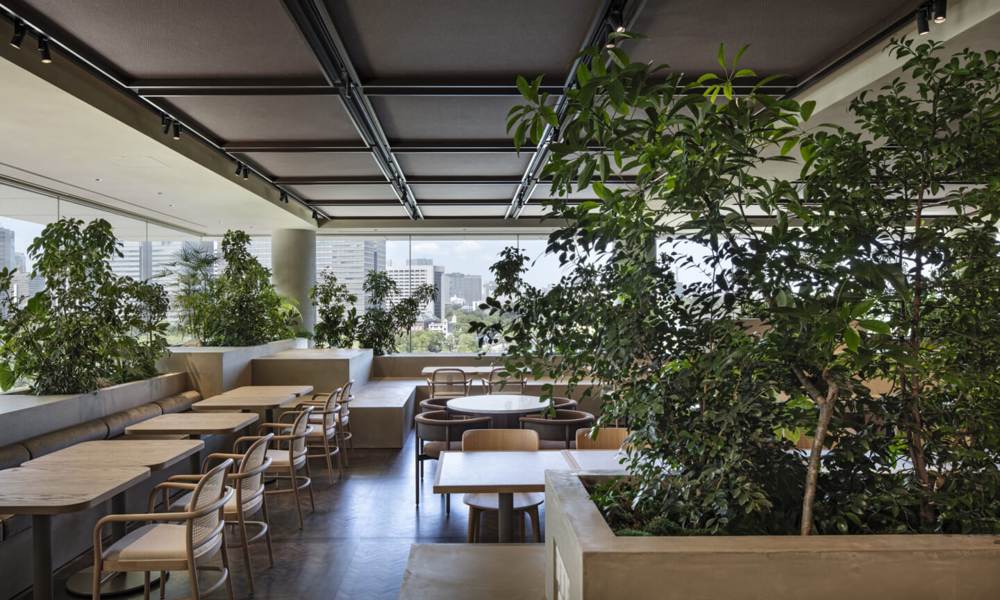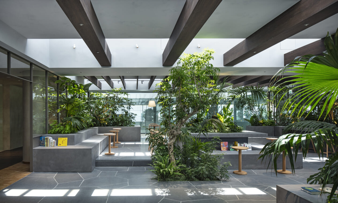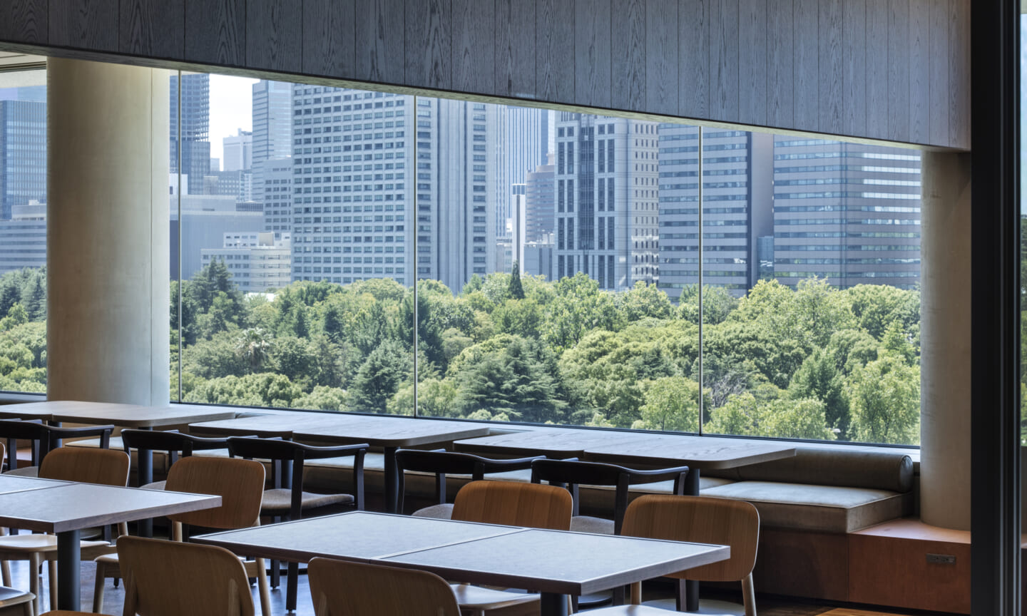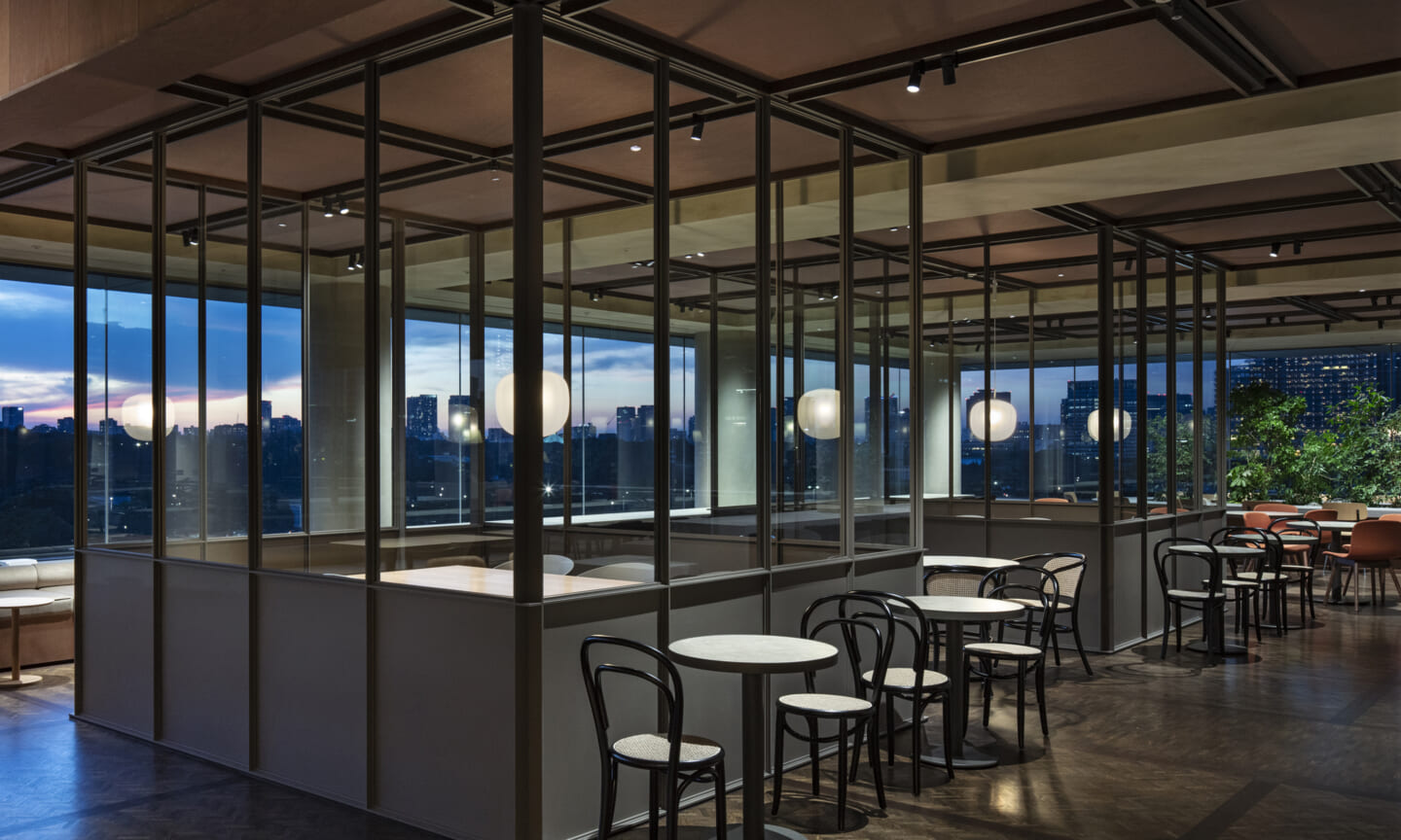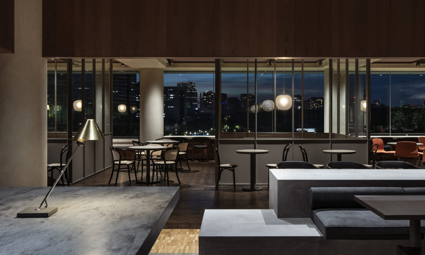 1938年に竣工した第一生命保険本館は、近代建築における金字塔的な建築で、その後の長い歴史の中で改修を重ねつつも今尚その風格が受け継がれている稀有なオフィスビルである。また建築だけでなく内部空間の仕上げやディテールからもデザインへのリテラシーの高さが窺える空間であった。吹き抜けの立体的な構成、吹出口の機能を兼ねた天井グリット、寄木細工の床、窓から望むお堀端の素晴らしい景色。現地を訪問した際に印象的だった“既存の価値”を受け継ぎ、最大限に活かす形で “働く場”と”休息の場”が同居する空間にしたいと考えた。食堂として使われていた単調なワンフロア空間を、食事をしたり、仕事をしたり、会話を楽しんだりと、思いおもいに過ごせる公園のような場にする為フロア全体をひとつの街と捉え計画を始めた。大きな構成として「コンビニ、キッチン、食堂」の3つのエリアに分け、EVホールから各エリアを繋ぐ主動線を、ライブラリーとして設計。共用部の意匠を踏襲したオーセンティックな木質空間と、ライブラリーの両サイドに配したキッチンやコンビニのライトグリーンのタイル仕上げで、既存の重厚感と新たな空間との明確なコントラストを作り視認性を高めた。また、ボタニカルガーデンと名付けた植物と自然光が心地よいアトリウム空間は、既存のトップライトと吹き抜けの部分をガラス+フレームで囲い温室のように設え “働く場”から”休息の場”へとマインドセットするための食堂全体のエントランスとして機能するように配置。食堂エリアは、パークオフィス、カフェテラス、バー、グラウンドテラスなどテーマと個性を与えてゾーニングし、敢えて明確な道は設けずに公園に面したオープンテラス席、公園のベンチ、といったように街にある様々なシュチュエーションが混ざり合う多様な空間性を地形のような床の起伏や家具や照明によって構成していった。320坪の大空間は、エリア毎に設けた垂れ壁の操作や既存床の塗り分けでリズミカルに文節しながらも緩やかな繋がりをつくり公園のようなおおらかさと様々な使われ方を許容する場となった。既存の価値を受け継ぎ新たなデザインに変換し“次にバトンを繋げること”が歴史ある建築の改修の手法として、また求められたウェルビーイング(持続的な幸福)な場の在り方としても相応しいと考えた。