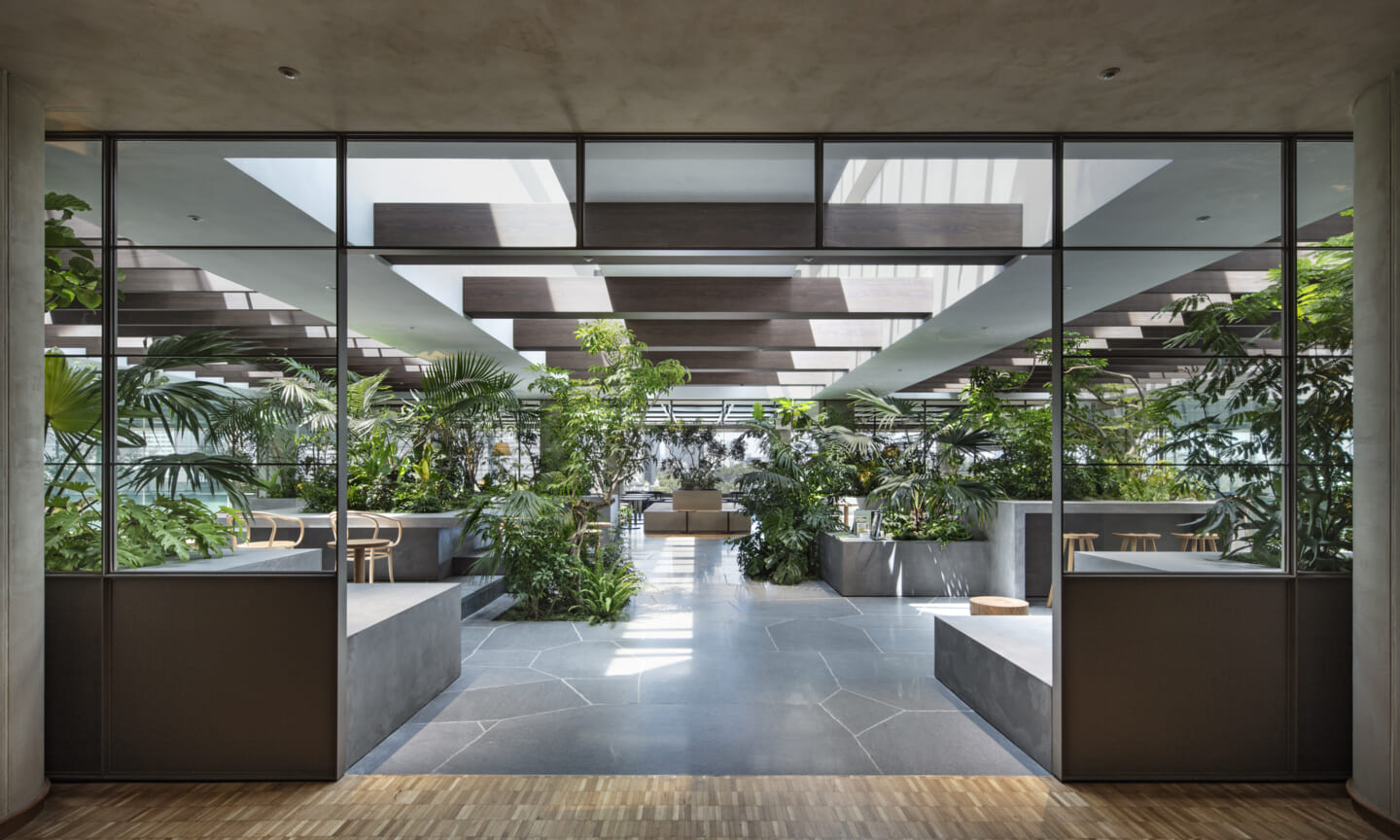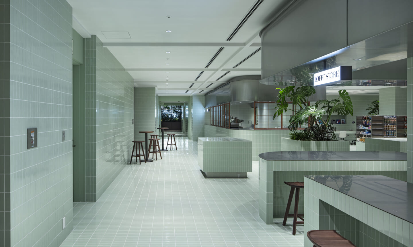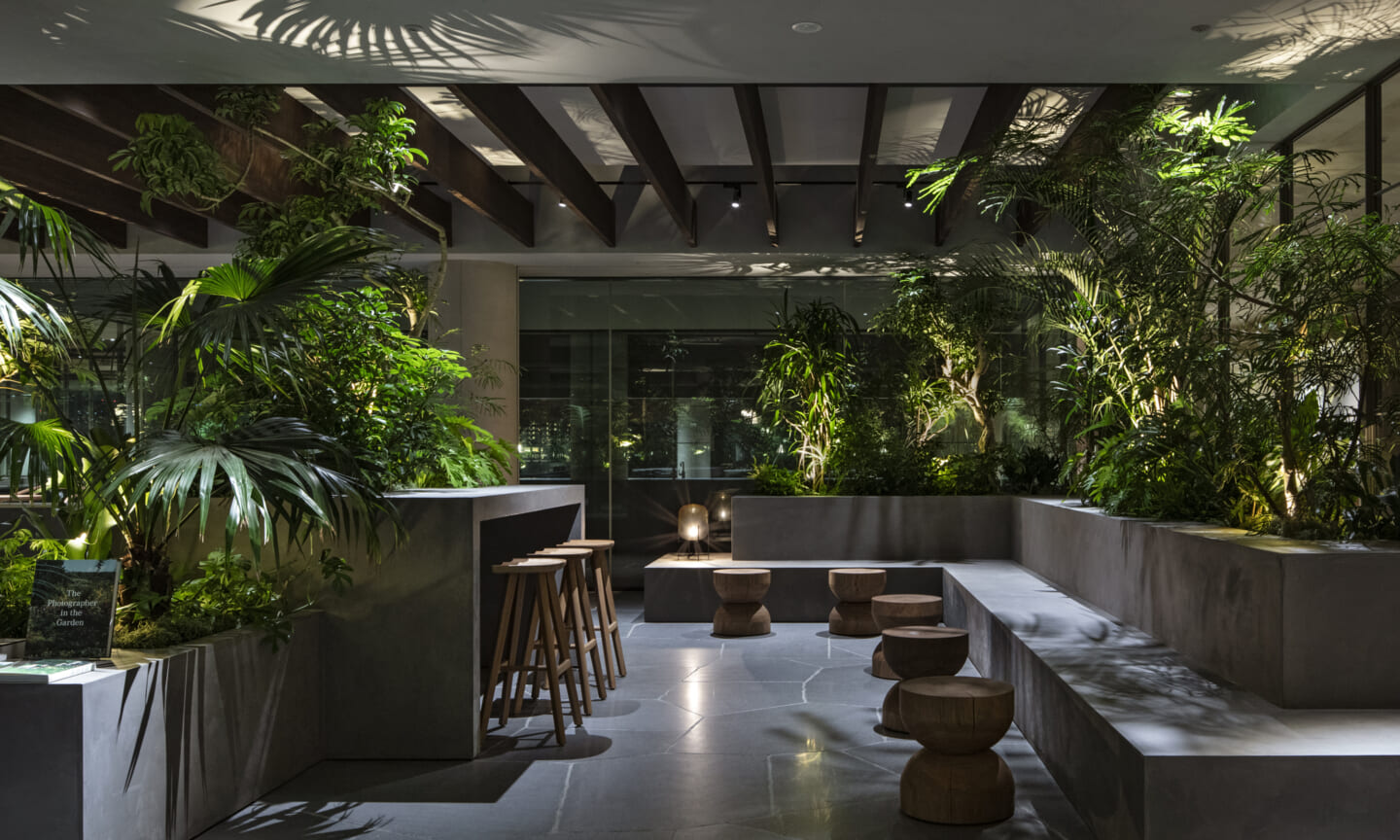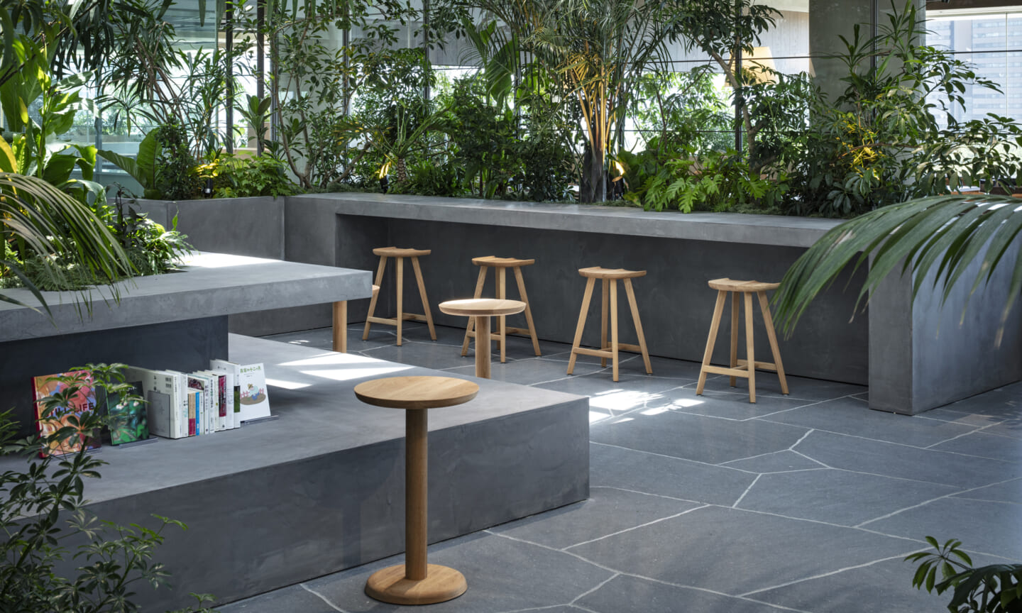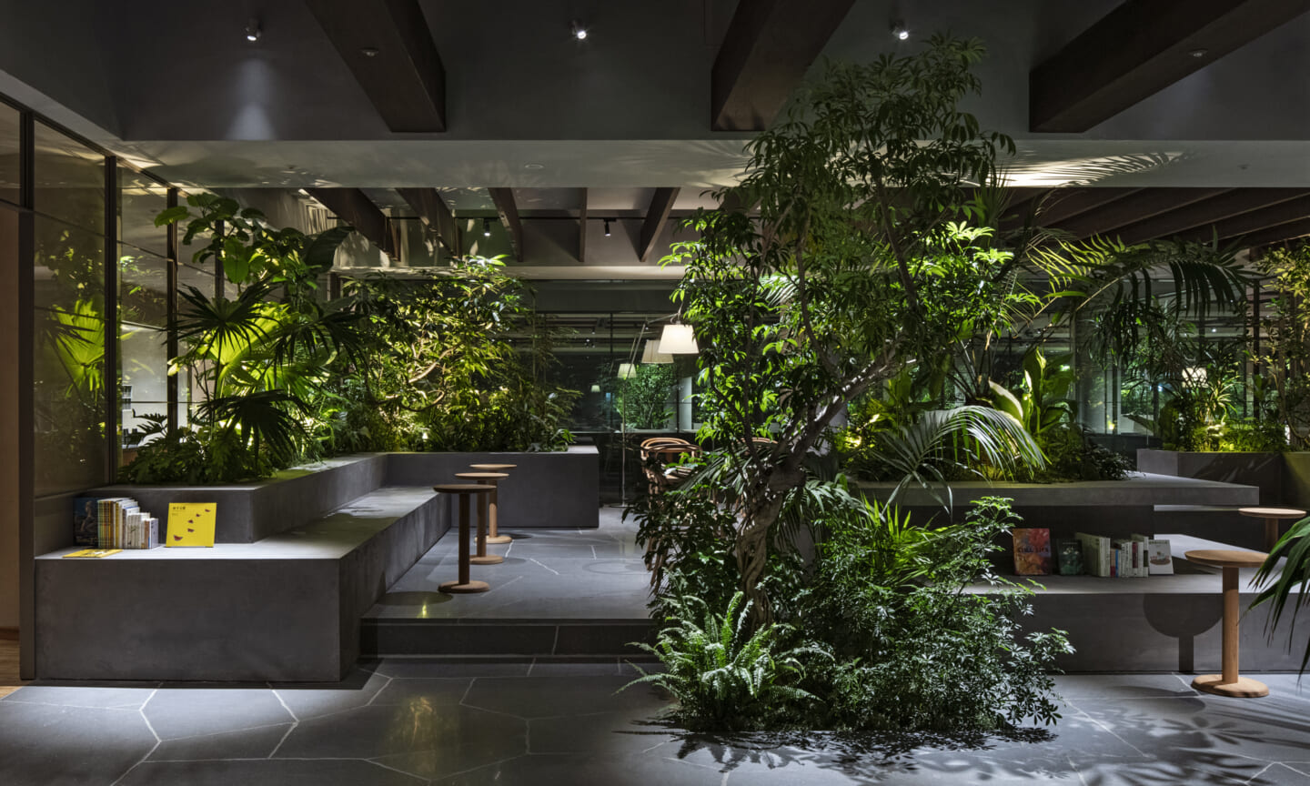 1938年に竣工した第一生命保険本館は、近代建築における金字塔的な建築で、その後の長い歴史の中で改修を重ねつつも今尚その風格が受け継がれている稀有なオフィスビルである。また建築だけでなく内部空間の仕上げやディテールからもデザインへのリテラシーの高さが窺える空間であった。吹き抜けの立体的な構成、吹出口の機能を兼ねた天井グリット、寄木細工の床、窓から望むお堀端の素晴らしい景色。現地を訪問した際に印象的だった“既存の価値”を受け継ぎ、最大限に活かす形で “働く場”と”休息の場”が同居する空間にしたいと考えた。食堂として使われていた単調なワンフロア空間を、食事をしたり、仕事をしたり、会話を楽しんだりと、思いおもいに過ごせる公園のような場にする為フロア全体をひとつの街と捉え計画を始めた。大きな構成として「コンビニ、キッチン、食堂」の3つのエリアに分け、EVホールから各エリアを繋ぐ主動線を、ライブラリーとして設計。共用部の意匠を踏襲したオーセンティックな木質空間と、ライブラリーの両サイドに配したキッチンやコンビニのライトグリーンのタイル仕上げで、既存の重厚感と新たな空間との明確なコントラストを作り視認性を高めた。また、ボタニカルガーデンと名付けた植物と自然光が心地よいアトリウム空間は、既存のトップライトと吹き抜けの部分をガラス+フレームで囲い温室のように設え “働く場”から”休息の場”へとマインドセットするための食堂全体のエントランスとして機能するように配置。食堂エリアは、パークオフィス、カフェテラス、バー、グラウンドテラスなどテーマと個性を与えてゾーニングし、敢えて明確な道は設けずに公園に面したオープンテラス席、公園のベンチ、といったように街にある様々なシュチュエーションが混ざり合う多様な空間性を地形のような床の起伏や家具や照明によって構成していった。320坪の大空間は、エリア毎に設けた垂れ壁の操作や既存床の塗り分けでリズミカルに文節しながらも緩やかな繋がりをつくり公園のようなおおらかさと様々な使われ方を許容する場となった。既存の価値を受け継ぎ新たなデザインに変換し“次にバトンを繋げること”が歴史ある建築の改修の手法として、また求められたウェルビーイング(持続的な幸福)な場の在り方としても相応しいと考えた。
