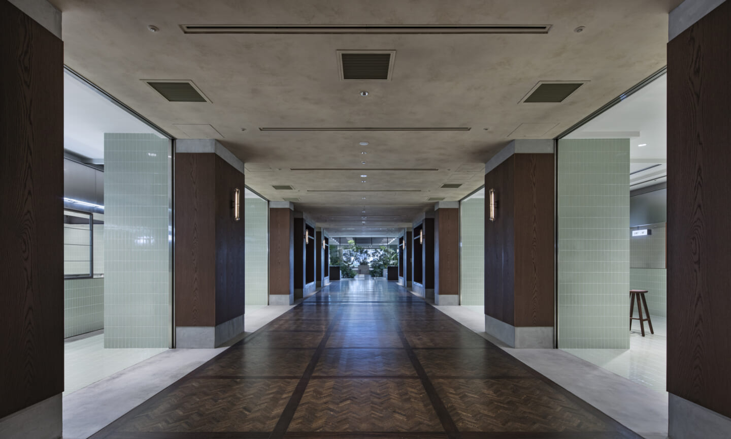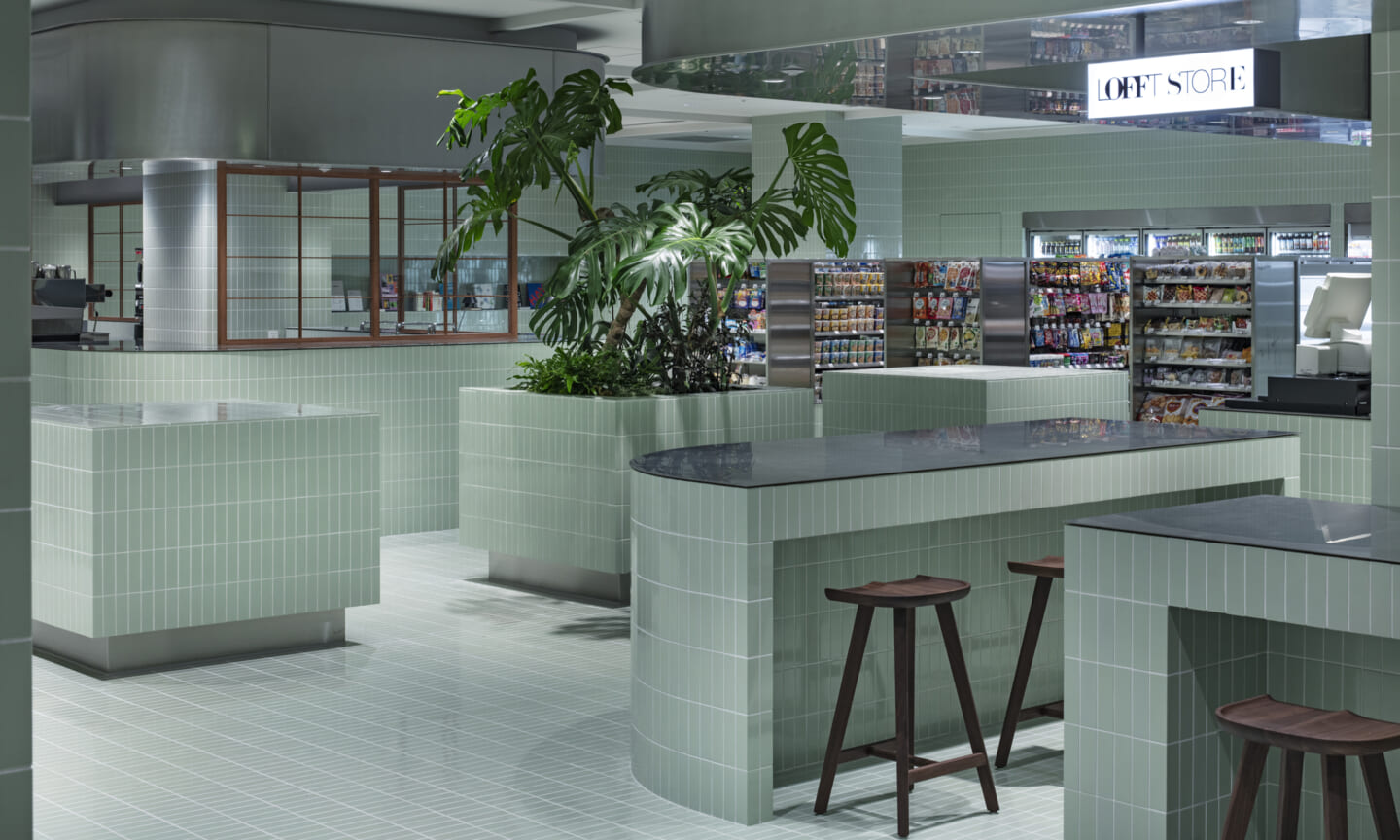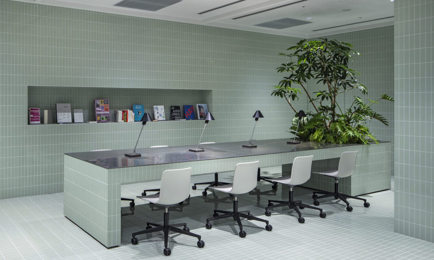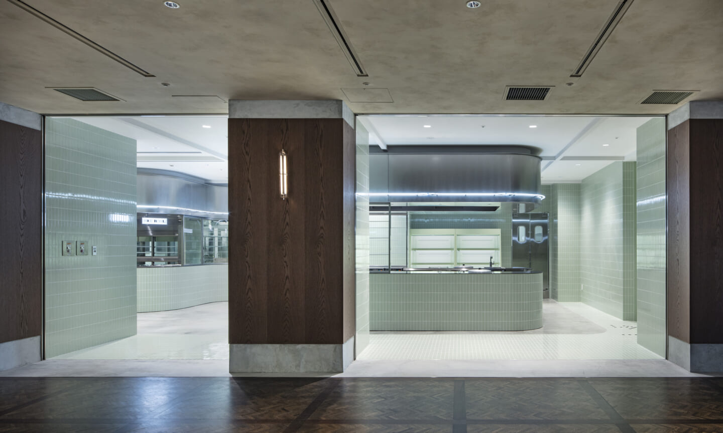 1938年に竣工した第一生命保険本館は、近代建築における金字塔的な建築で、その後の長い歴史の中で改修を重ねつつも今尚その風格が受け継がれている稀有なオフィスビルである。また建築だけでなく内部空間の仕上げやディテールからもデザインへのリテラシーの高さが窺える空間であった。吹き抜けの立体的な構成、吹出口の機能を兼ねた天井グリット、寄木細工の床、窓から望むお堀端の素晴らしい景色。現地を訪問した際に印象的だった“既存の価値”を受け継ぎ、最大限に活かす形で “働く場”と”休息の場”が同居する空間にしたいと考えた。食堂として使われていた単調なワンフロア空間を、食事をしたり、仕事をしたり、会話を楽しんだりと、思いおもいに過ごせる公園のような場にする為フロア全体をひとつの街と捉え計画を始めた。大きな構成として「コンビニ、キッチン、食堂」の3つのエリアに分け、EVホールから各エリアを繋ぐ主動線を、ライブラリーとして設計。共用部の意匠を踏襲したオーセンティックな木質空間と、ライブラリーの両サイドに配したキッチンやコンビニのライトグリーンのタイル仕上げで、既存の重厚感と新たな空間との明確なコントラストを作り視認性を高めた。また、ボタニカルガーデンと名付けた植物と自然光が心地よいアトリウム空間は、既存のトップライトと吹き抜けの部分をガラス+フレームで囲い温室のように設え “働く場”から”休息の場”へとマインドセットするための食堂全体のエントランスとして機能するように配置。食堂エリアは、パークオフィス、カフェテラス、バー、グラウンドテラスなどテーマと個性を与えてゾーニングし、敢えて明確な道は設けずに公園に面したオープンテラス席、公園のベンチ、といったように街にある様々なシュチュエーションが混ざり合う多様な空間性を地形のような床の起伏や家具や照明によって構成していった。320坪の大空間は、エリア毎に設けた垂れ壁の操作や既存床の塗り分けでリズミカルに文節しながらも緩やかな繋がりをつくり公園のようなおおらかさと様々な使われ方を許容する場となった。既存の価値を受け継ぎ新たなデザインに変換し“次にバトンを繋げること”が歴史ある建築の改修の手法として、また求められたウェルビーイング(持続的な幸福)な場の在り方としても相応しいと考えた。