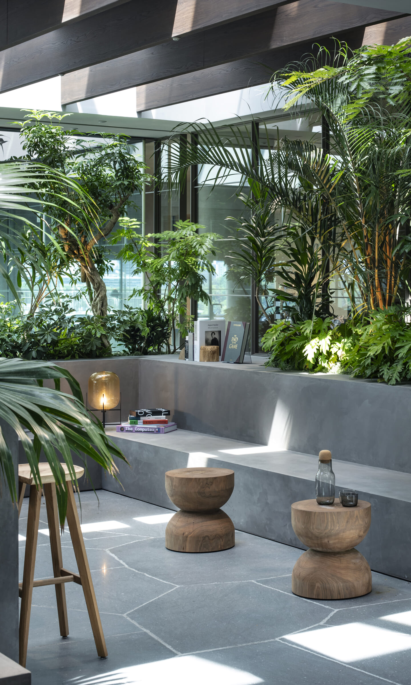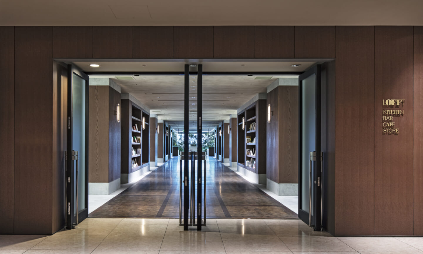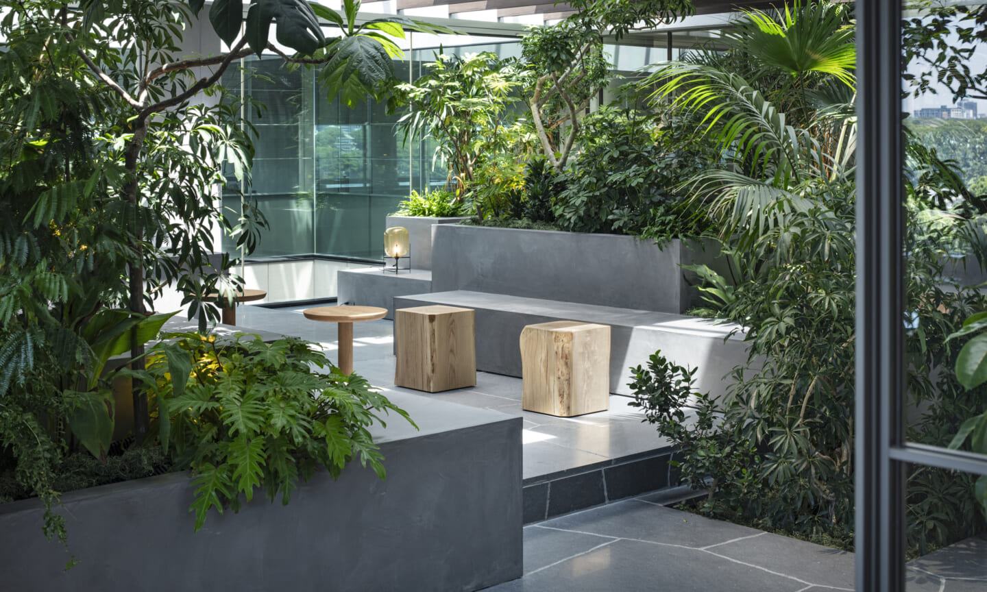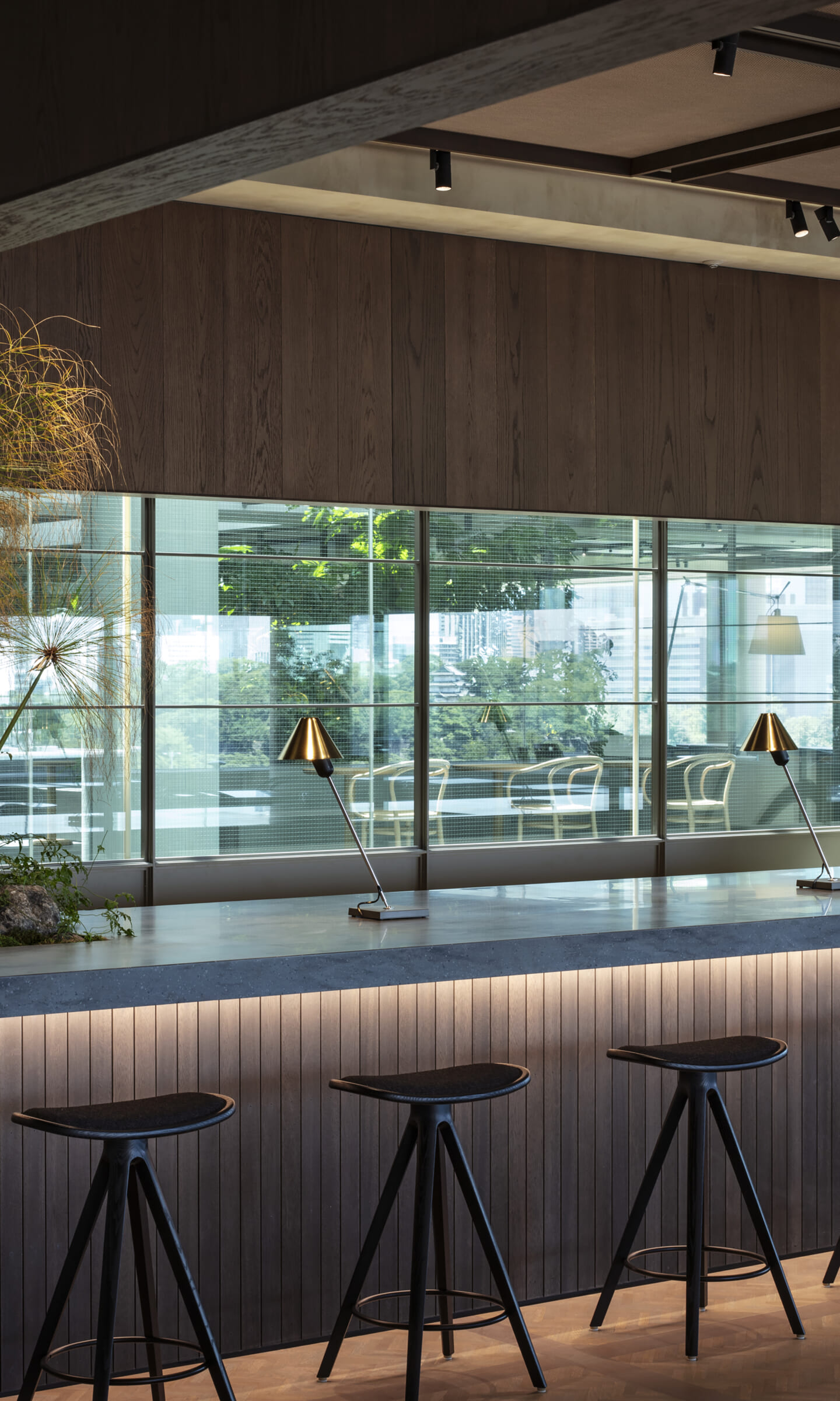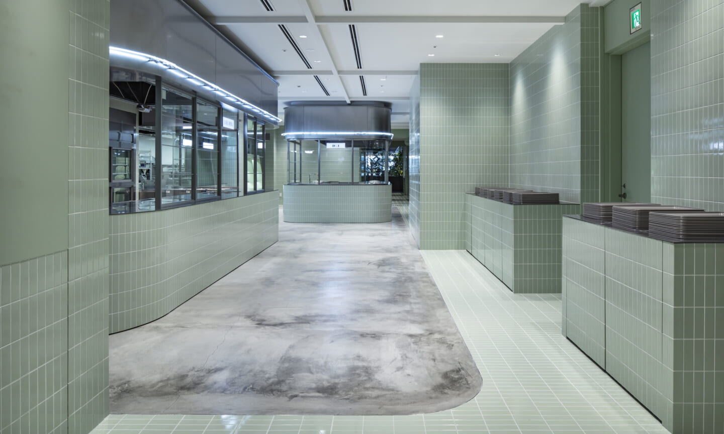 1938年に竣工した第一生命保険本館は、近代建築における金字塔的な建築で、その後の長い歴史の中で改修を重ねつつも今尚その風格が受け継がれている稀有なオフィスビルである。また建築だけでなく内部空間の仕上げやディテールからもデザインへのリテラシーの高さが窺える空間であった。吹き抜けの立体的な構成、吹出口の機能を兼ねた天井グリット、寄木細工の床、窓から望むお堀端の素晴らしい景色。現地を訪問した際に印象的だった“既存の価値”を受け継ぎ、最大限に活かす形で “働く場”と”休息の場”が同居する空間にしたいと考えた。食堂として使われていた単調なワンフロア空間を、食事をしたり、仕事をしたり、会話を楽しんだりと、思いおもいに過ごせる公園のような場にする為フロア全体をひとつの街と捉え計画を始めた。大きな構成として「コンビニ、キッチン、食堂」の3つのエリアに分け、EVホールから各エリアを繋ぐ主動線を、ライブラリーとして設計。共用部の意匠を踏襲したオーセンティックな木質空間と、ライブラリーの両サイドに配したキッチンやコンビニのライトグリーンのタイル仕上げで、既存の重厚感と新たな空間との明確なコントラストを作り視認性を高めた。また、ボタニカルガーデンと名付けた植物と自然光が心地よいアトリウム空間は、既存のトップライトと吹き抜けの部分をガラス+フレームで囲い温室のように設え “働く場”から”休息の場”へとマインドセットするための食堂全体のエントランスとして機能するように配置。食堂エリアは、パークオフィス、カフェテラス、バー、グラウンドテラスなどテーマと個性を与えてゾーニングし、敢えて明確な道は設けずに公園に面したオープンテラス席、公園のベンチ、といったように街にある様々なシュチュエーションが混ざり合う多様な空間性を地形のような床の起伏や家具や照明によって構成していった。320坪の大空間は、エリア毎に設けた垂れ壁の操作や既存床の塗り分けでリズミカルに文節しながらも緩やかな繋がりをつくり公園のようなおおらかさと様々な使われ方を許容する場となった。既存の価値を受け継ぎ新たなデザインに変換し“次にバトンを繋げること”が歴史ある建築の改修の手法として、また求められたウェルビーイング(持続的な幸福)な場の在り方としても相応しいと考えた。