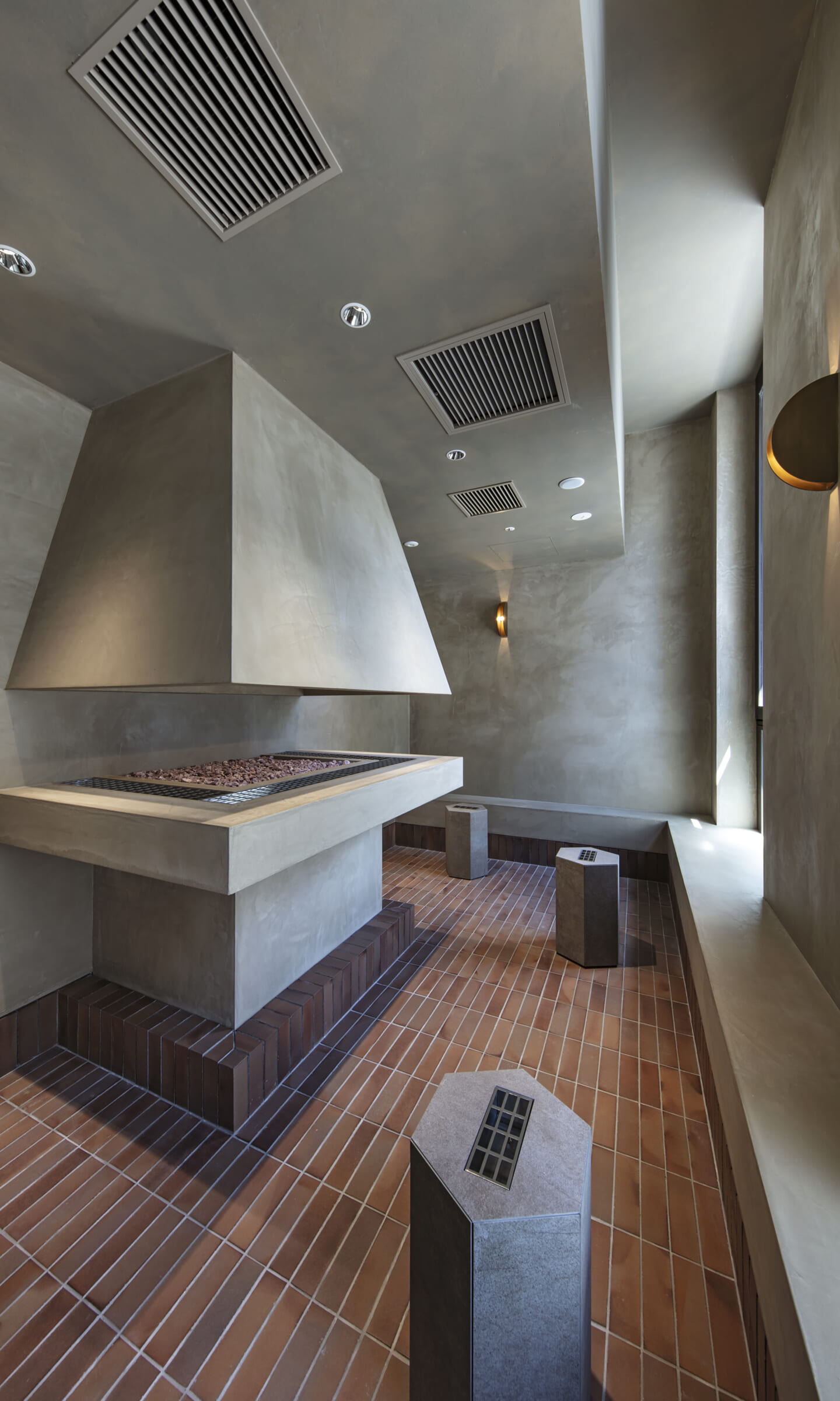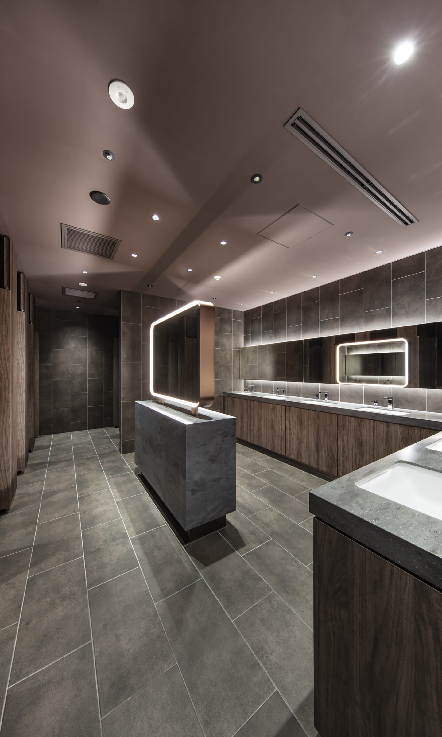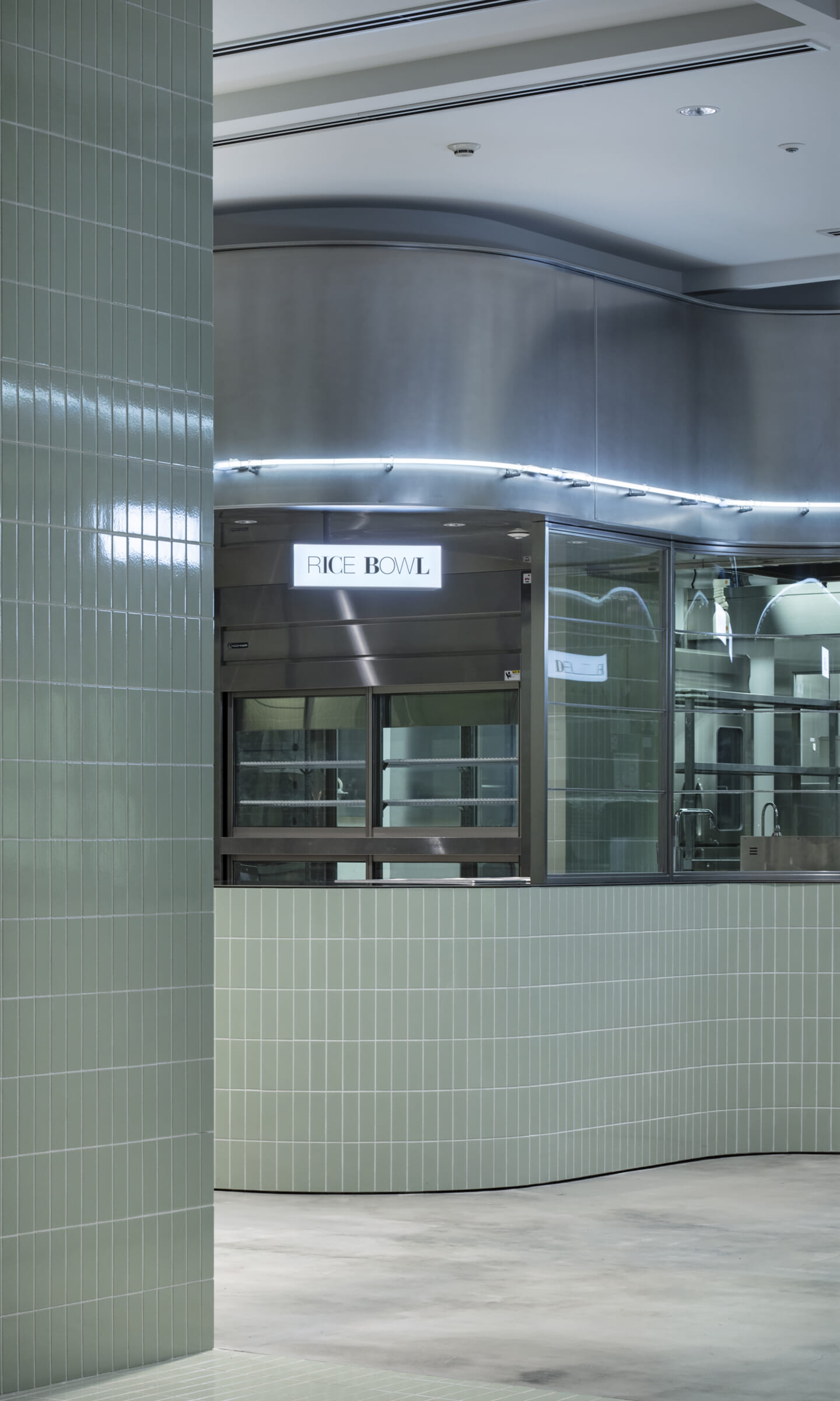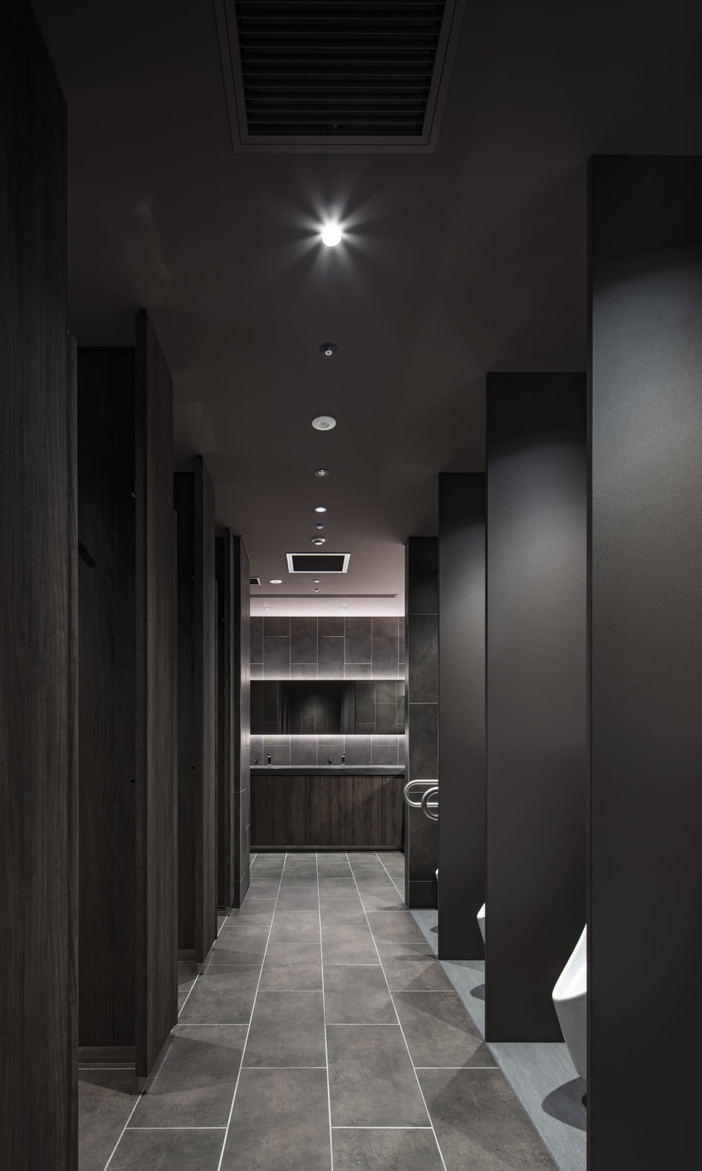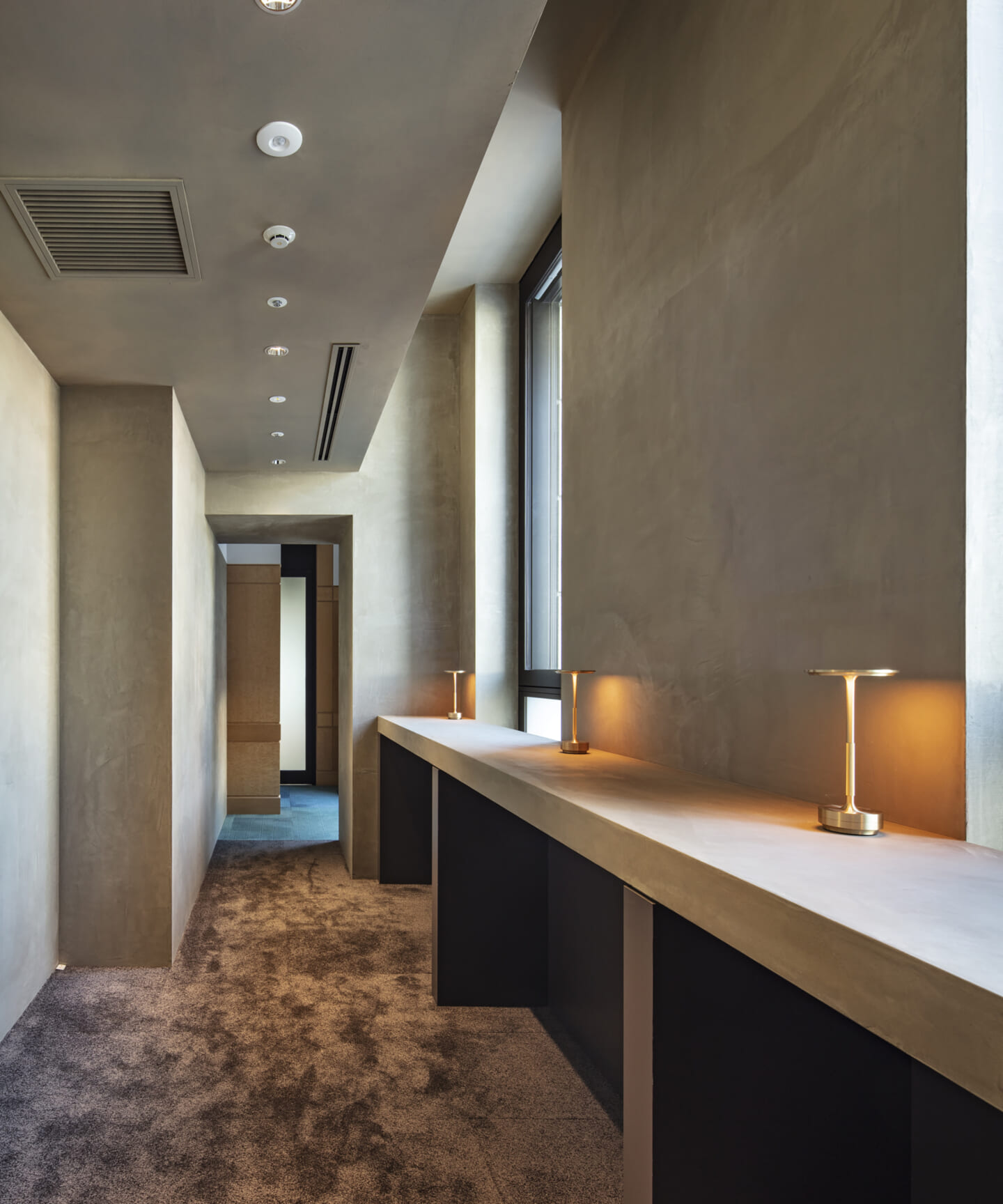 1938年に竣工した第一生命保険本館は、近代建築における金字塔的な建築で、その後の長い歴史の中で改修を重ねつつも今尚その風格が受け継がれている稀有なオフィスビルである。また建築だけでなく内部空間の仕上げやディテールからもデザインへのリテラシーの高さが窺える空間であった。吹き抜けの立体的な構成、吹出口の機能を兼ねた天井グリット、寄木細工の床、窓から望むお堀端の素晴らしい景色。現地を訪問した際に印象的だった“既存の価値”を受け継ぎ、最大限に活かす形で “働く場”と”休息の場”が同居する空間にしたいと考えた。食堂として使われていた単調なワンフロア空間を、食事をしたり、仕事をしたり、会話を楽しんだりと、思いおもいに過ごせる公園のような場にする為フロア全体をひとつの街と捉え計画を始めた。大きな構成として「コンビニ、キッチン、食堂」の3つのエリアに分け、EVホールから各エリアを繋ぐ主動線を、ライブラリーとして設計。共用部の意匠を踏襲したオーセンティックな木質空間と、ライブラリーの両サイドに配したキッチンやコンビニのライトグリーンのタイル仕上げで、既存の重厚感と新たな空間との明確なコントラストを作り視認性を高めた。また、ボタニカルガーデンと名付けた植物と自然光が心地よいアトリウム空間は、既存のトップライトと吹き抜けの部分をガラス+フレームで囲い温室のように設え “働く場”から”休息の場”へとマインドセットするための食堂全体のエントランスとして機能するように配置。食堂エリアは、パークオフィス、カフェテラス、バー、グラウンドテラスなどテーマと個性を与えてゾーニングし、敢えて明確な道は設けずに公園に面したオープンテラス席、公園のベンチ、といったように街にある様々なシュチュエーションが混ざり合う多様な空間性を地形のような床の起伏や家具や照明によって構成していった。320坪の大空間は、エリア毎に設けた垂れ壁の操作や既存床の塗り分けでリズミカルに文節しながらも緩やかな繋がりをつくり公園のようなおおらかさと様々な使われ方を許容する場となった。既存の価値を受け継ぎ新たなデザインに変換し“次にバトンを繋げること”が歴史ある建築の改修の手法として、また求められたウェルビーイング(持続的な幸福)な場の在り方としても相応しいと考えた。