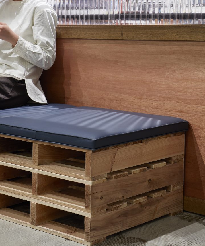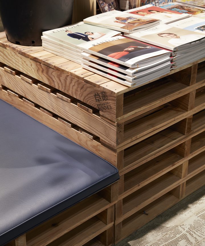 徹底的にローコストのインテリアとした。床は剥がしたまま、家具も合板を使い、本の物流の場所、倉庫がそのままお店になっているかのような動きのある空間をつくった。