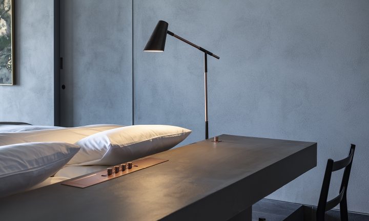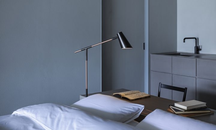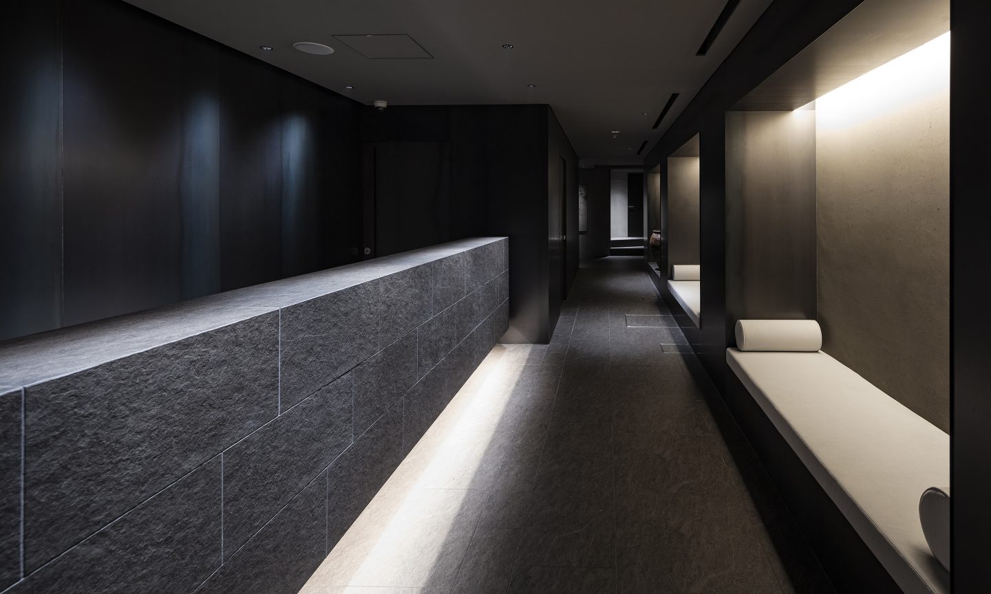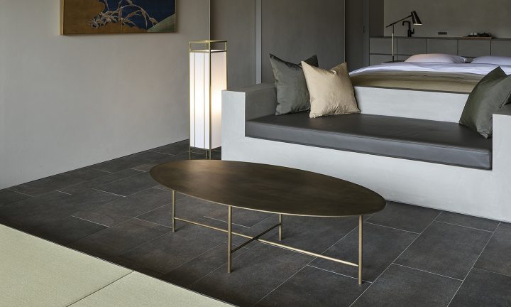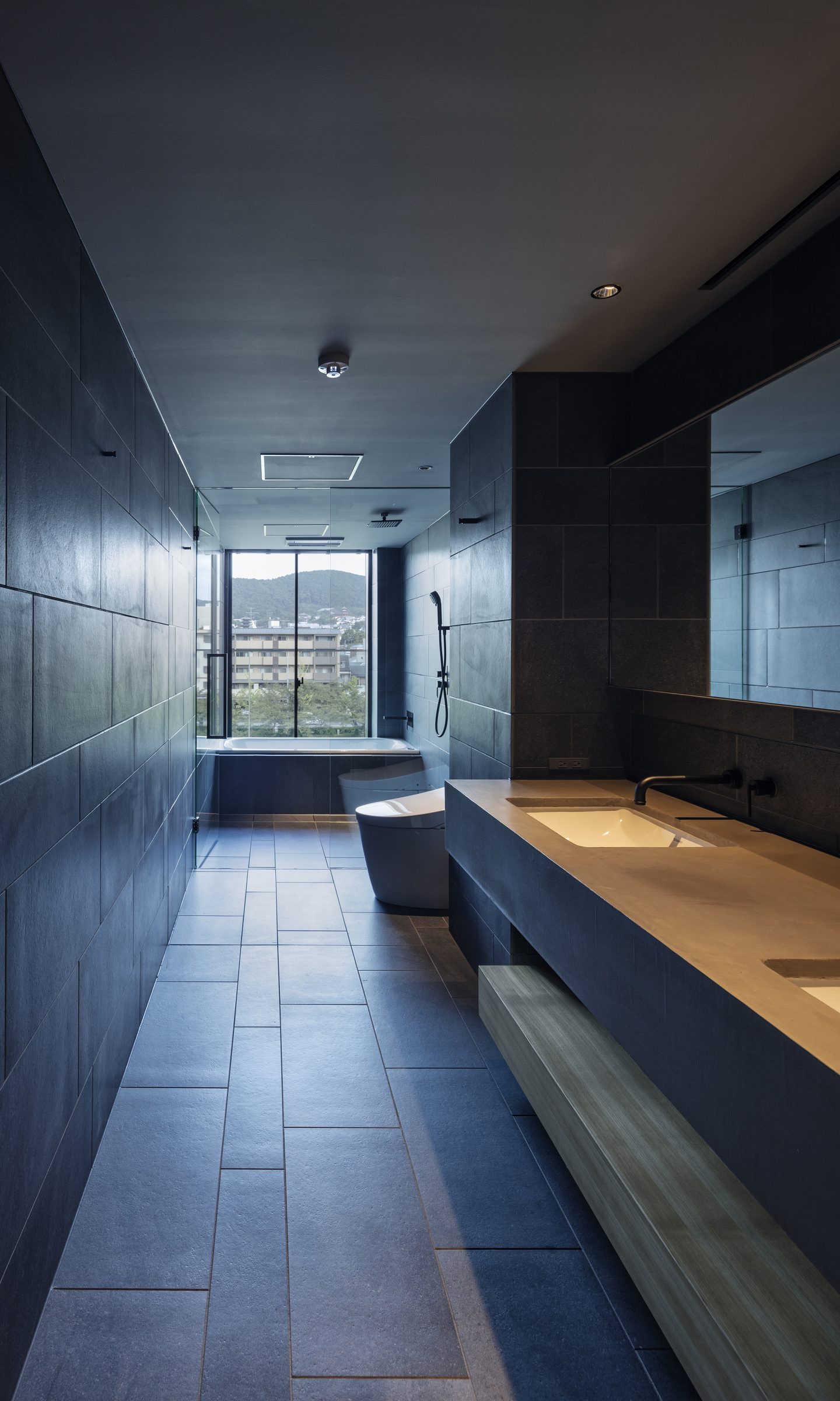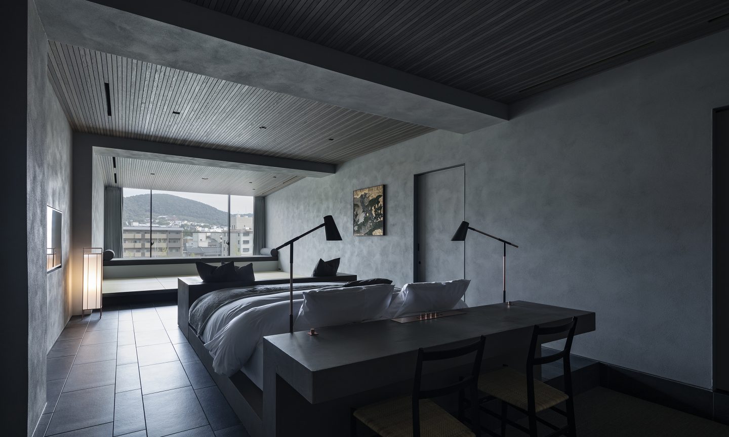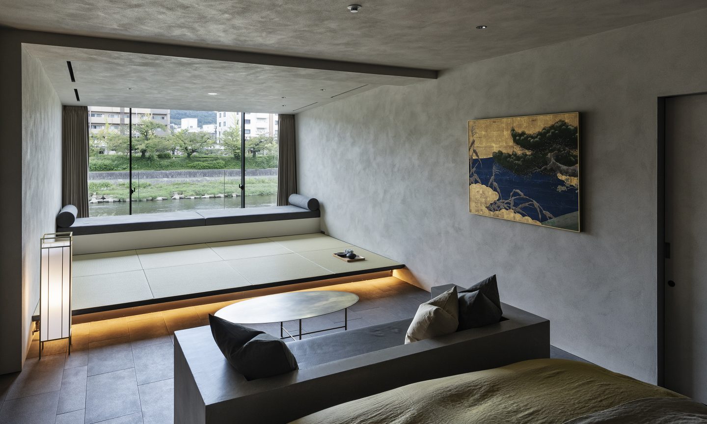 京都の木屋町通り東は鴨川に西は通りに面した素晴らしい立地であるが、建物は築47年と古く耐震改修しつつ元集合住宅をホテルとして改修することが求められた。フロアの西と東に2室の客室を設け、それぞれ外部へ向かうにつれて床を上げ、反対に天井は下げ、場所により鴨川と京都の町並みへの向き合い方が変化する計画とした。床を上げる事でサッシ際に川を眺めるもうひとつの居場所がうまれ、天井を傾ける事で、設備や構造、カーテンボックスなどを隠し、風景を切り取り、内土間と縁側や深い軒といった和の空間構成を現代的に解釈して用いた。仕上げとなる天井の板張り、骨材で質感を出したペイント、またファサードの綱製の格子、それらは日本古来の和の要素を踏襲しつつ、細さや、素材感、彩度の低い色見、材の選択など、様々な「置き換え」を意識的に行った。