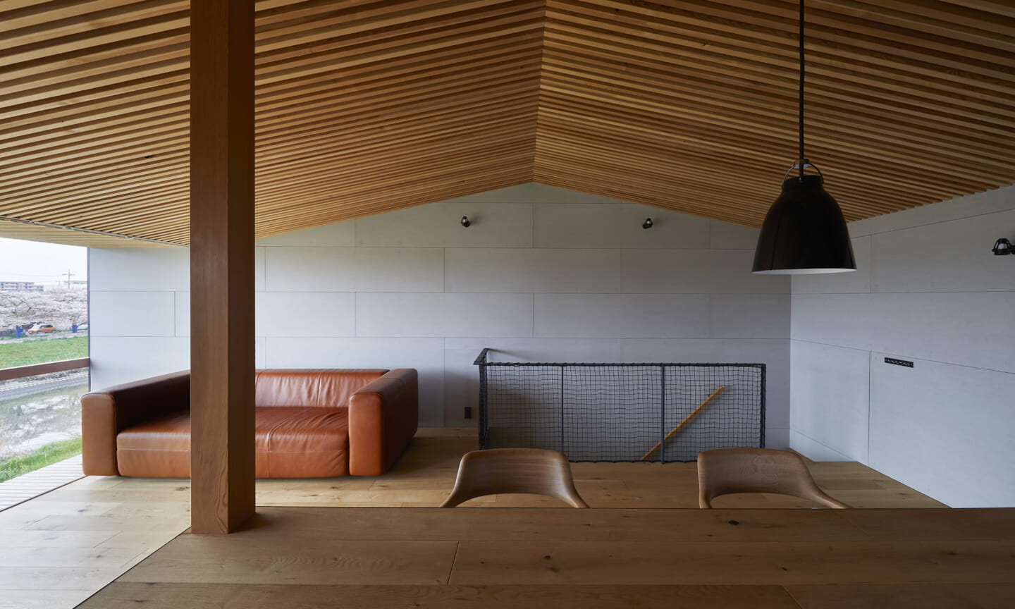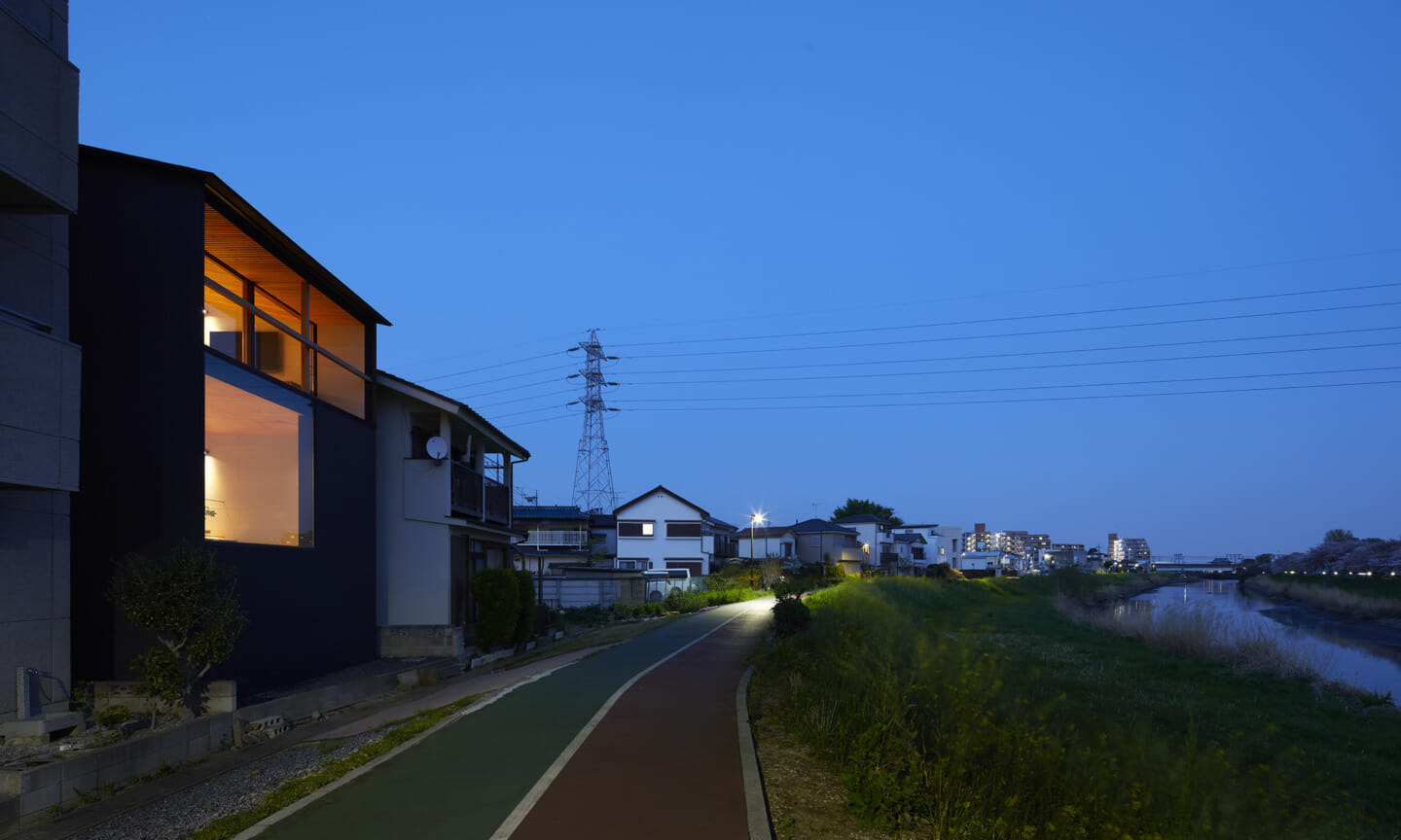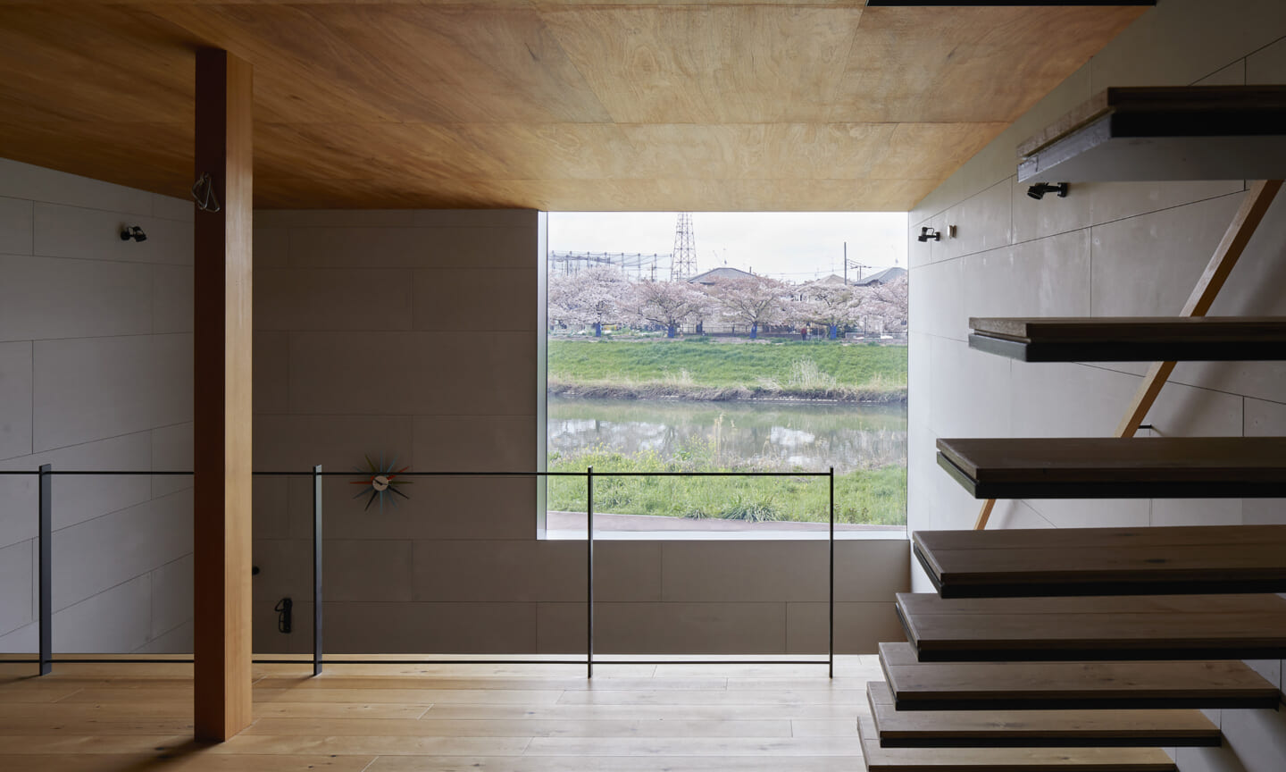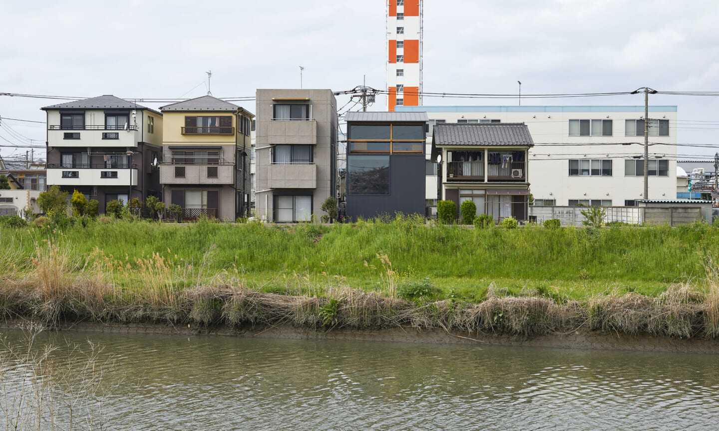 1階を2層の高さを持つ静穏な空間とし、その上に、屋根から風景を眺めているような場をつくった。都市と川沿いの風景を持つ空間は、四季折々の多様な変化をもたらし、伸びやかな生活を演出する。寝室は、家の中に屋根をかけた小さな東屋として設え、その外側は、天高く空が切り取られた静かな路地となっている。屋根の上は斜面となり、座ると川の風景が見え、土手に居るような気持ちになれる。