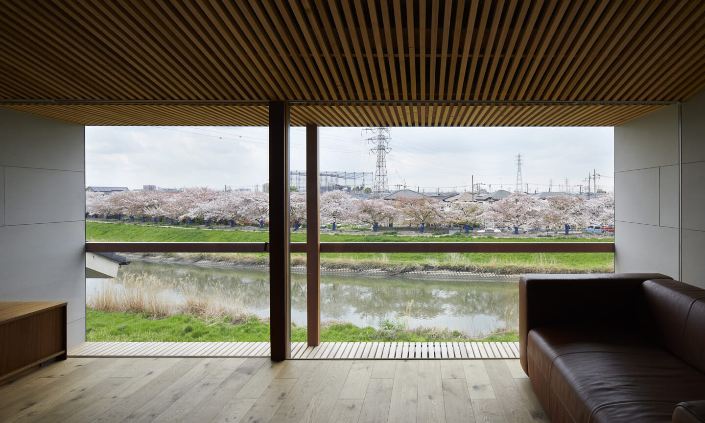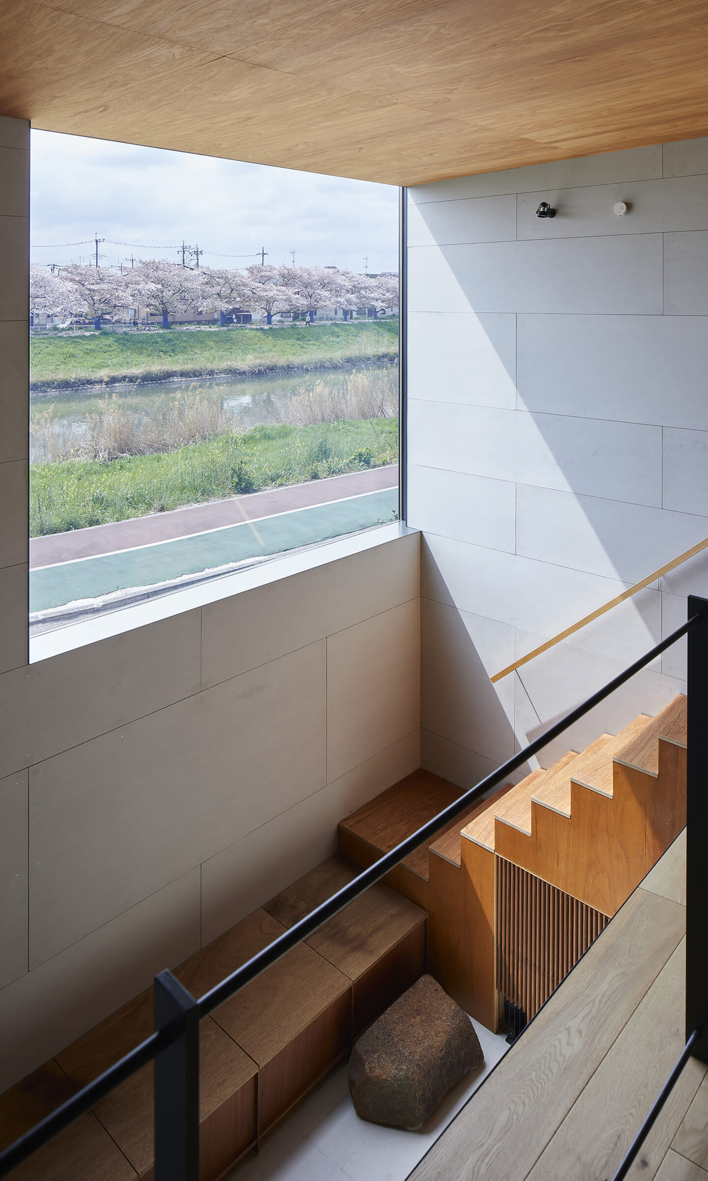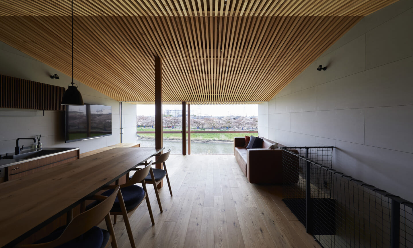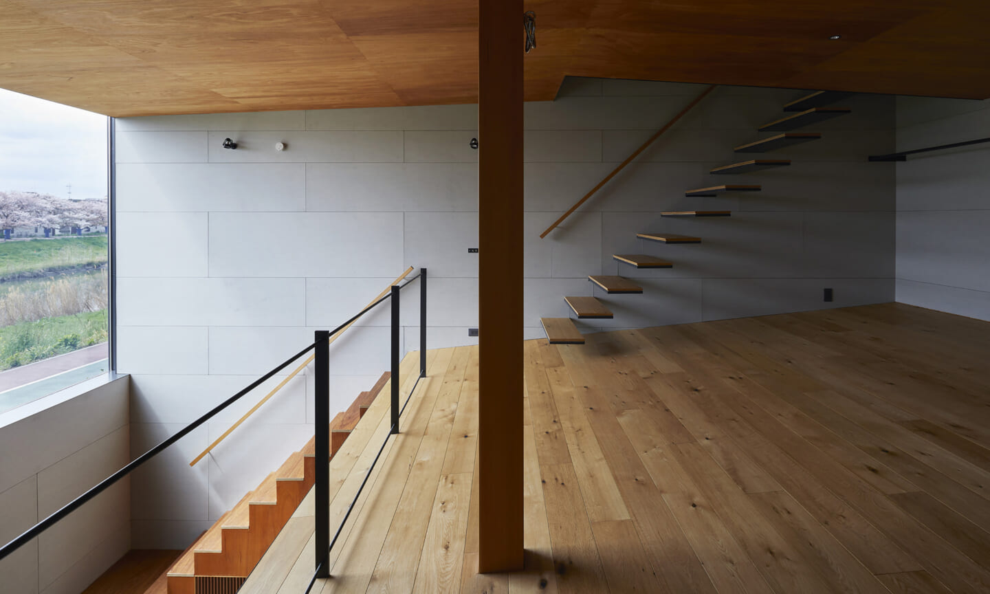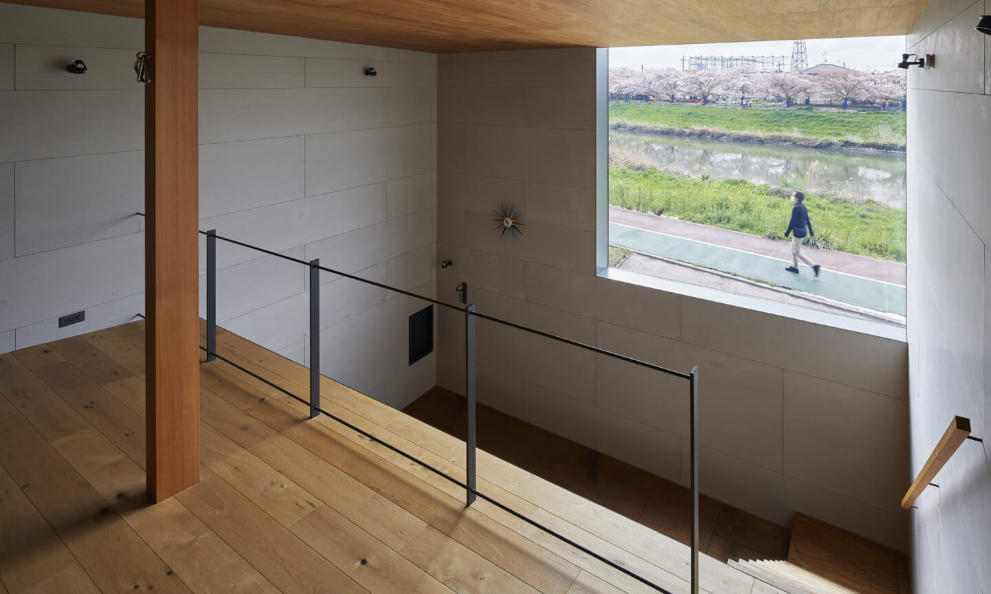 1階を2層の高さを持つ静穏な空間とし、その上に、屋根から風景を眺めているような場をつくった。都市と川沿いの風景を持つ空間は、四季折々の多様な変化をもたらし、伸びやかな生活を演出する。寝室は、家の中に屋根をかけた小さな東屋として設え、その外側は、天高く空が切り取られた静かな路地となっている。屋根の上は斜面となり、座ると川の風景が見え、土手に居るような気持ちになれる。