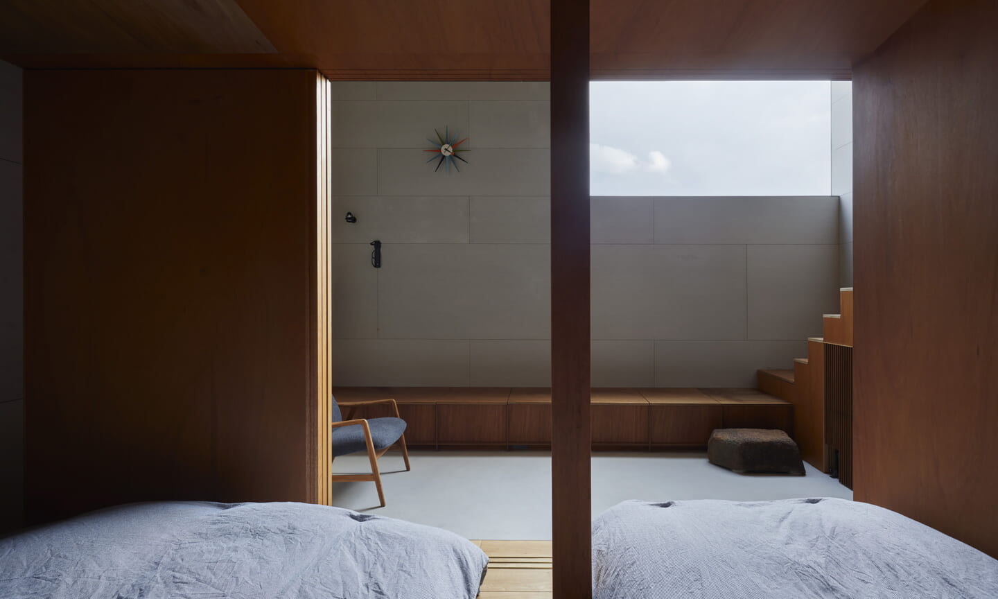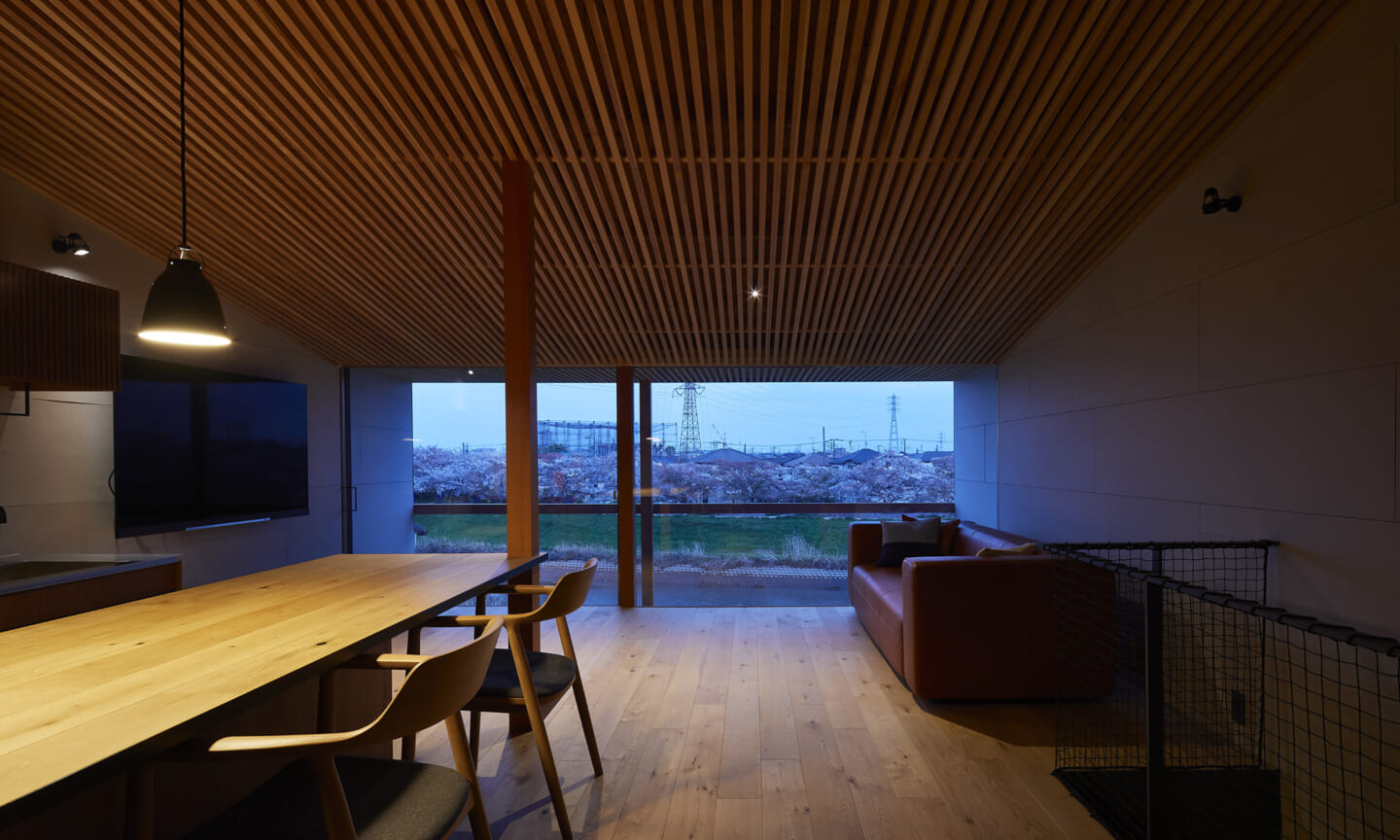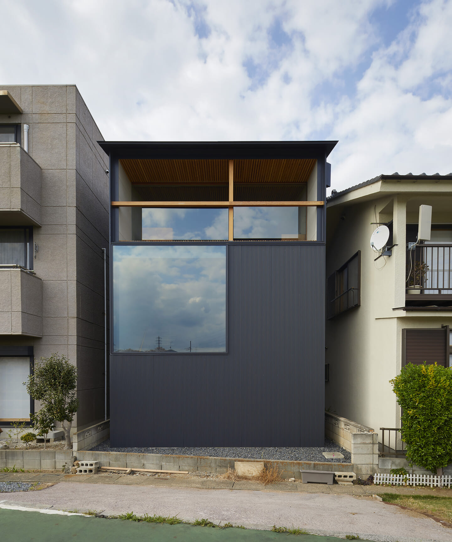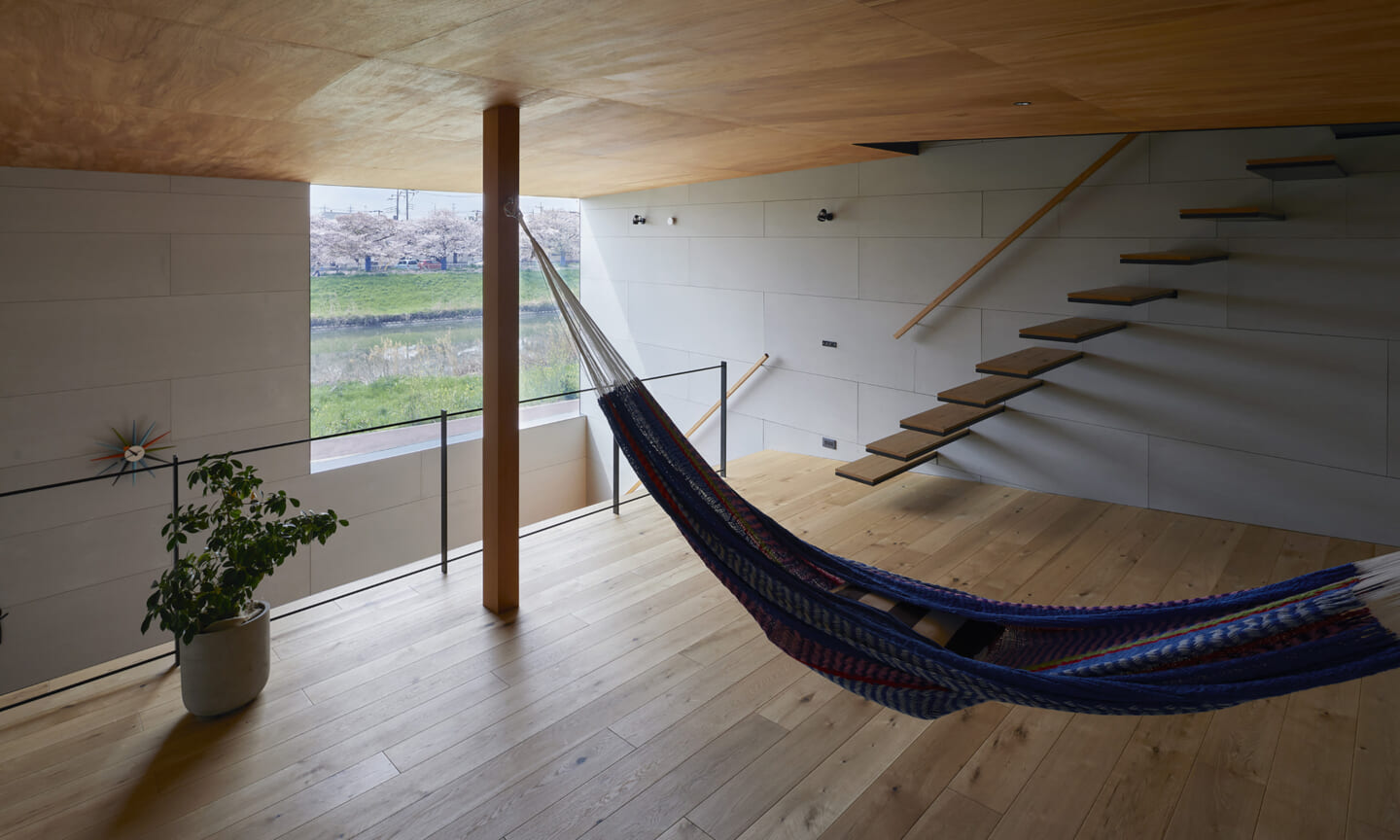 1階を2層の高さを持つ静穏な空間とし、その上に、屋根から風景を眺めているような場をつくった。都市と川沿いの風景を持つ空間は、四季折々の多様な変化をもたらし、伸びやかな生活を演出する。寝室は、家の中に屋根をかけた小さな東屋として設え、その外側は、天高く空が切り取られた静かな路地となっている。屋根の上は斜面となり、座ると川の風景が見え、土手に居るような気持ちになれる。