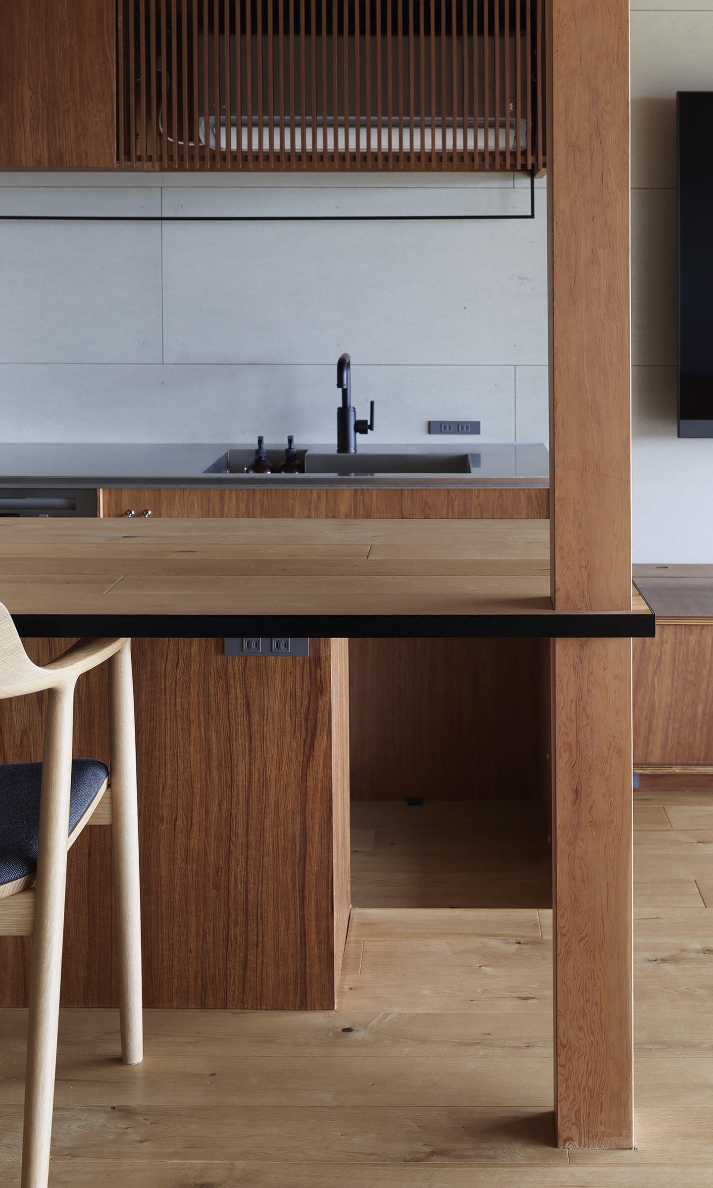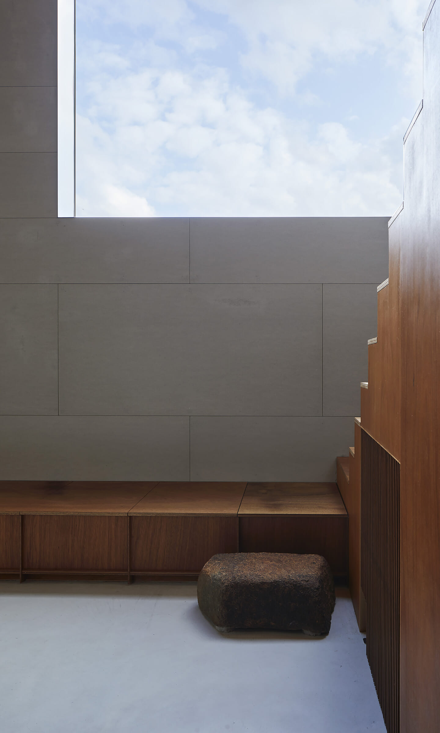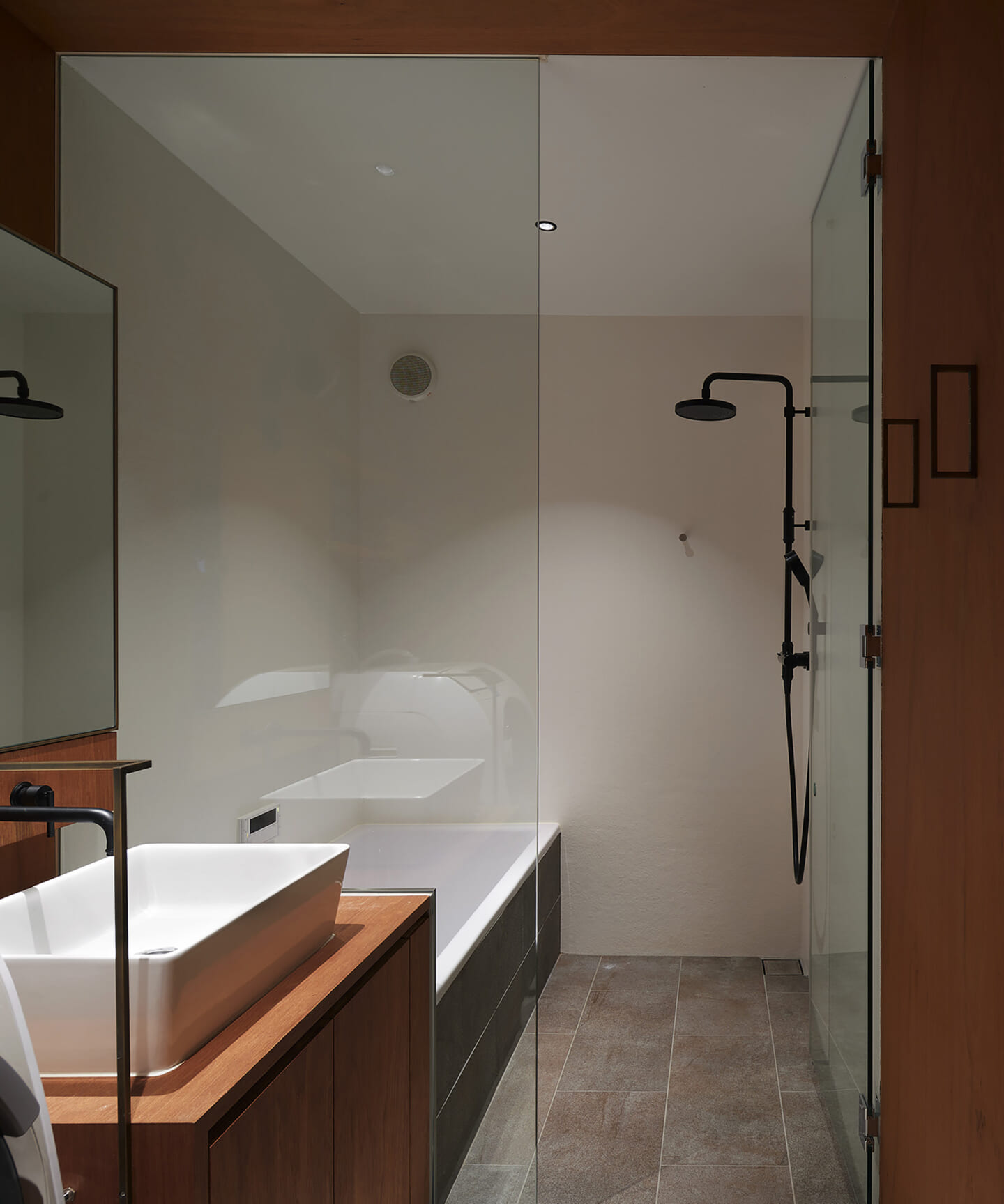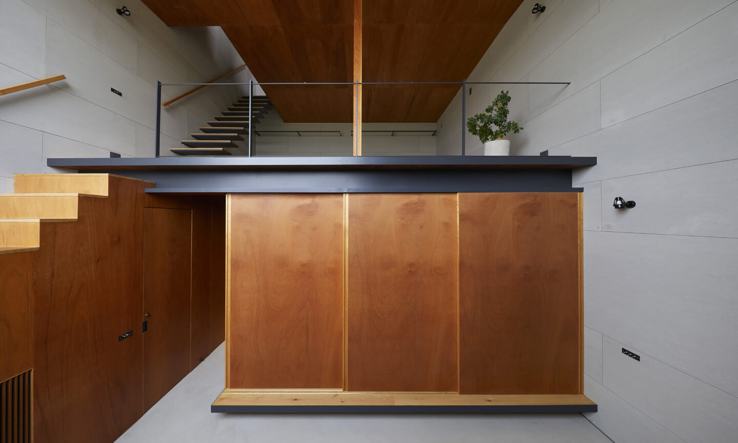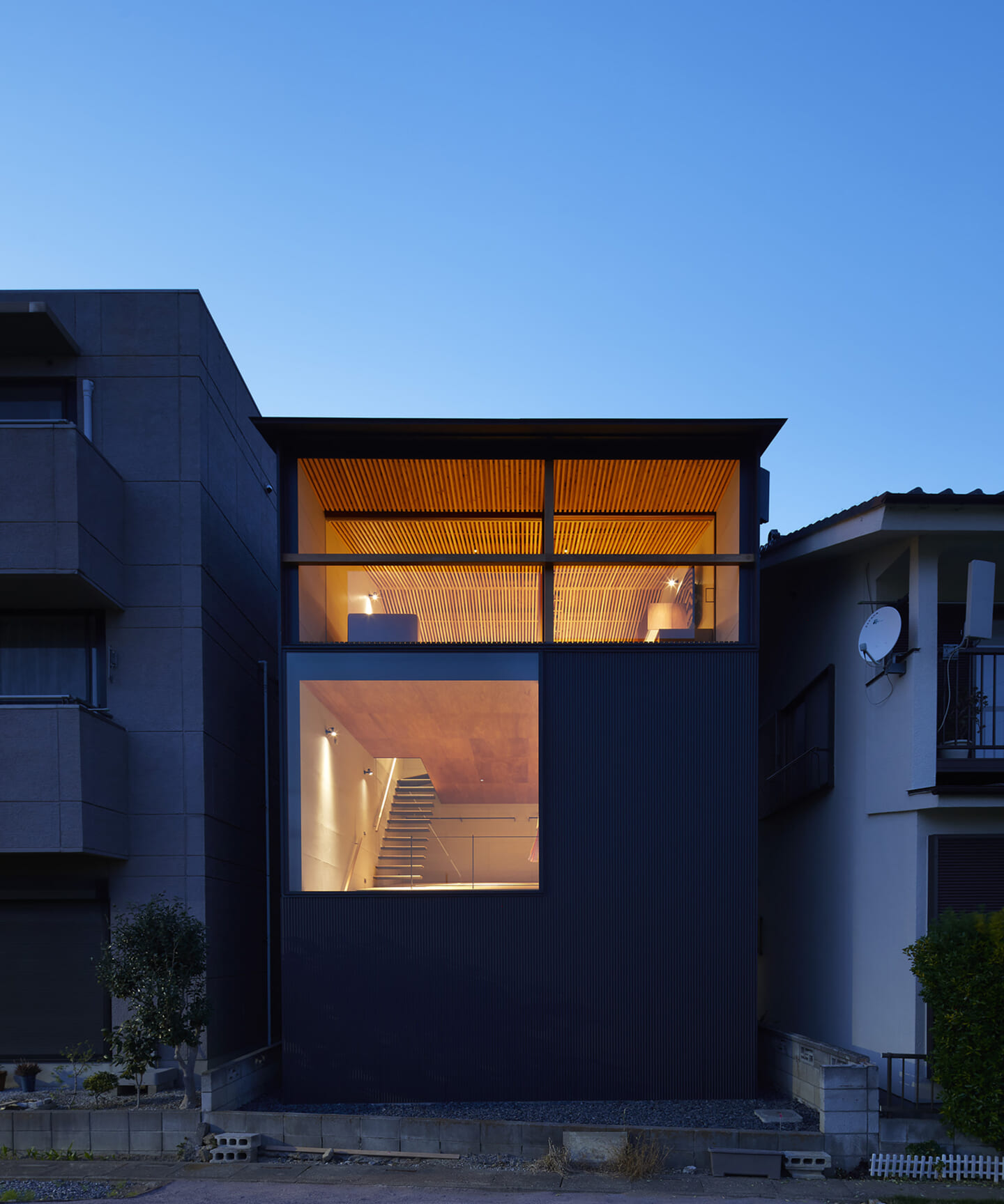 1階を2層の高さを持つ静穏な空間とし、その上に、屋根から風景を眺めているような場をつくった。都市と川沿いの風景を持つ空間は、四季折々の多様な変化をもたらし、伸びやかな生活を演出する。寝室は、家の中に屋根をかけた小さな東屋として設え、その外側は、天高く空が切り取られた静かな路地となっている。屋根の上は斜面となり、座ると川の風景が見え、土手に居るような気持ちになれる。