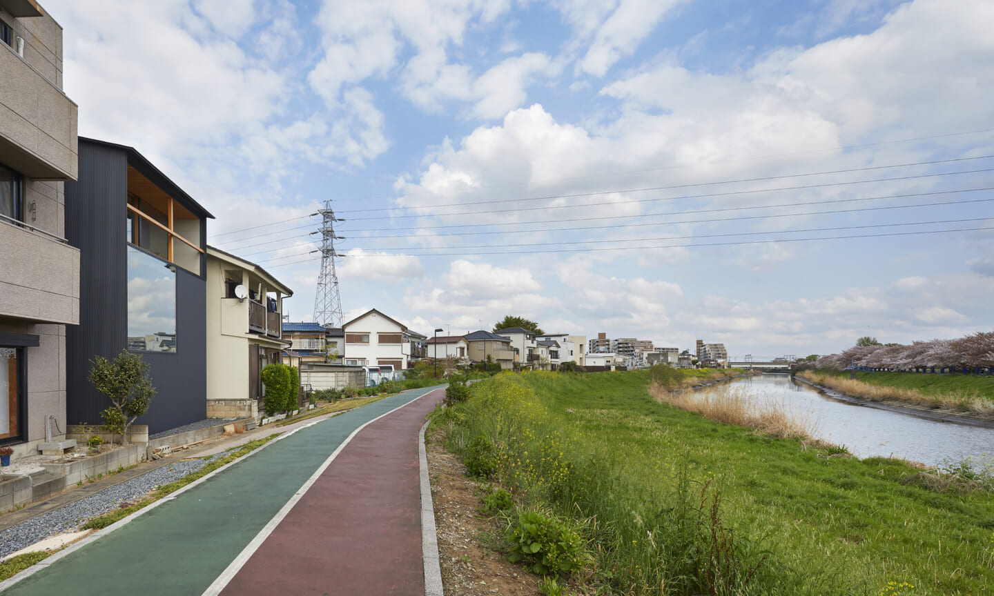 川沿いの住宅が連なる敷地で、向かいには桜並木が見え、さらに向こう側には低層の住宅地が広がっている。左右を住宅に挟まれた土地で、目の前の土手にはランニングコースが整備されている。遠くに見える橋の上では時折電車が通り過ぎるのが見える。
