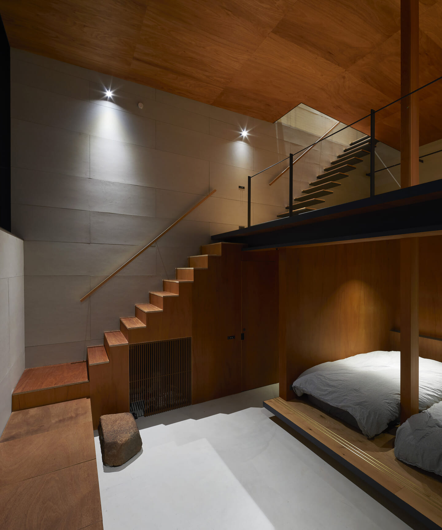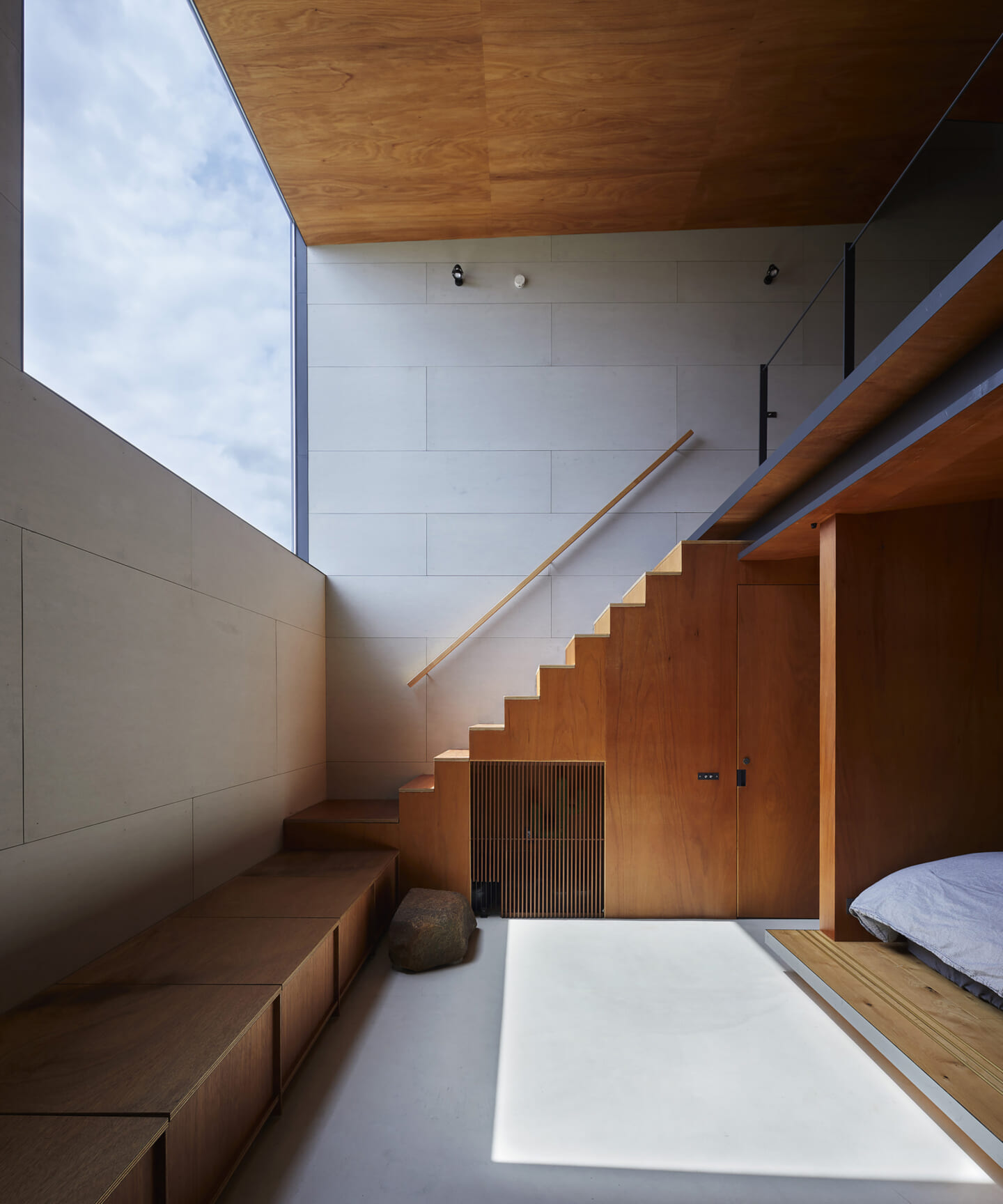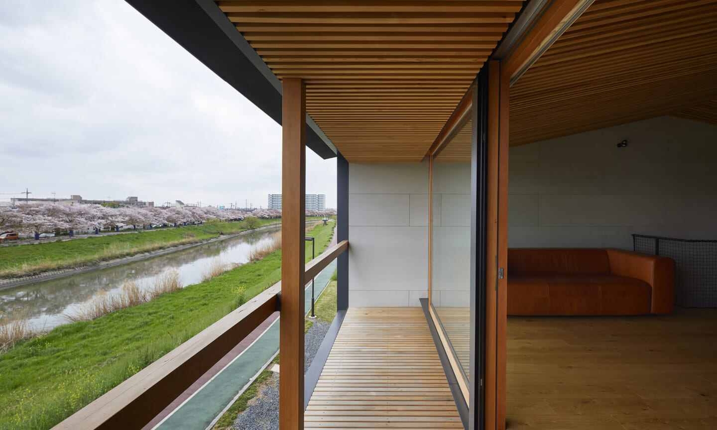 1階を2層の高さを持つ静穏な空間とし、その上に、屋根から風景を眺めているような場をつくった。都市と川沿いの風景を持つ空間は、四季折々の多様な変化をもたらし、伸びやかな生活を演出する。寝室は、家の中に屋根をかけた小さな東屋として設え、その外側は、天高く空が切り取られた静かな路地となっている。屋根の上は斜面となり、座ると川の風景が見え、土手に居るような気持ちになれる。