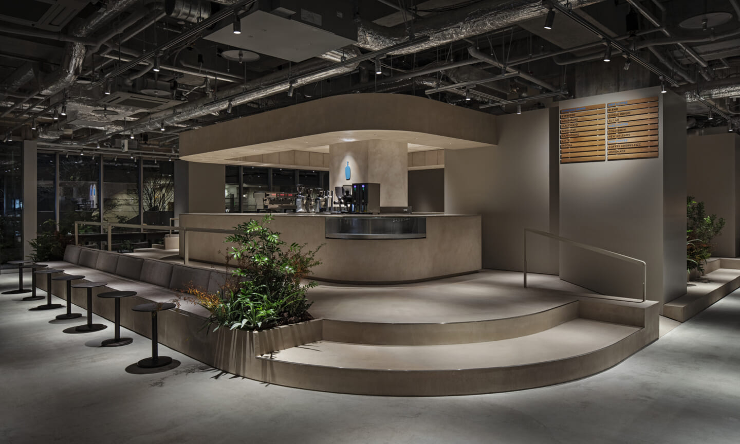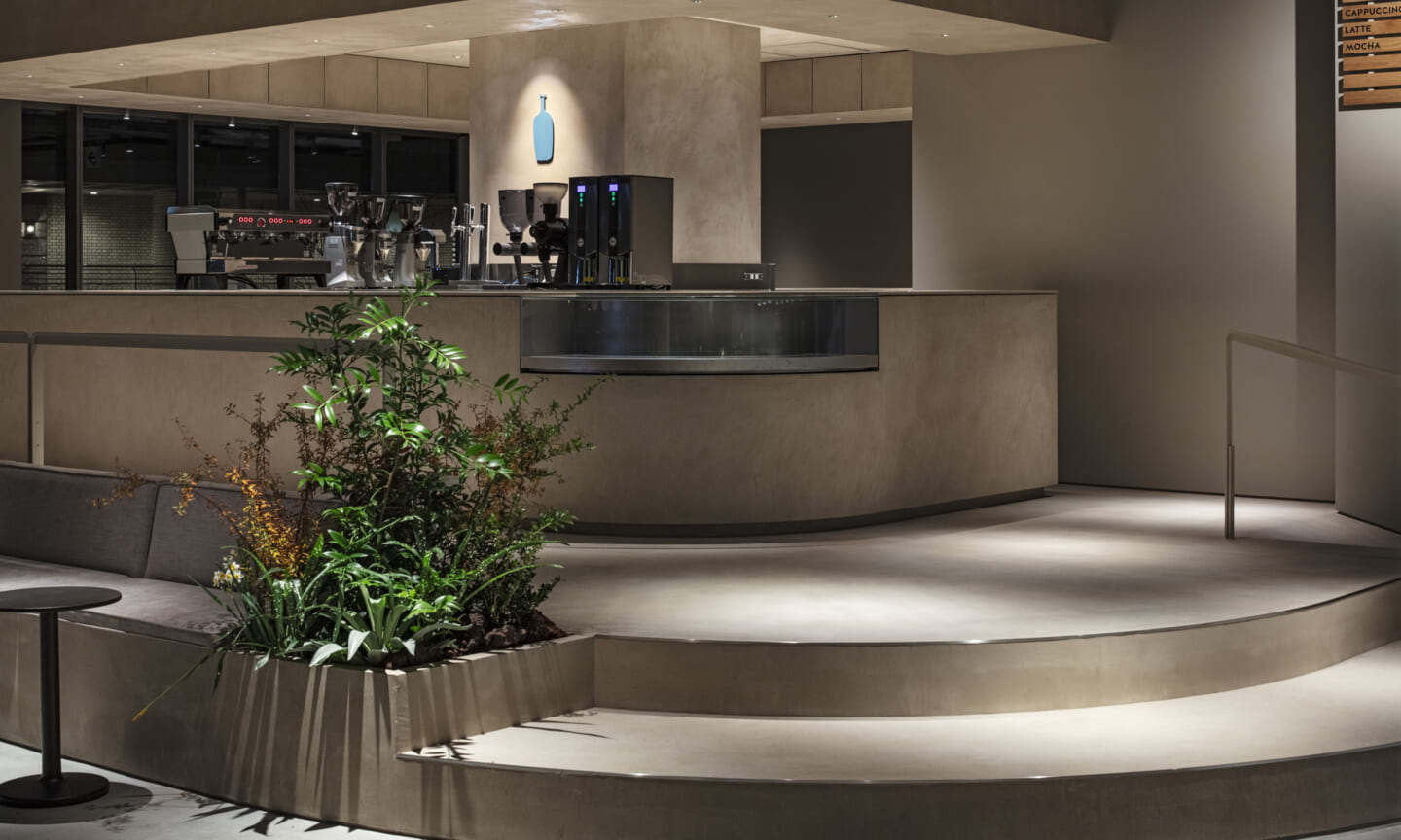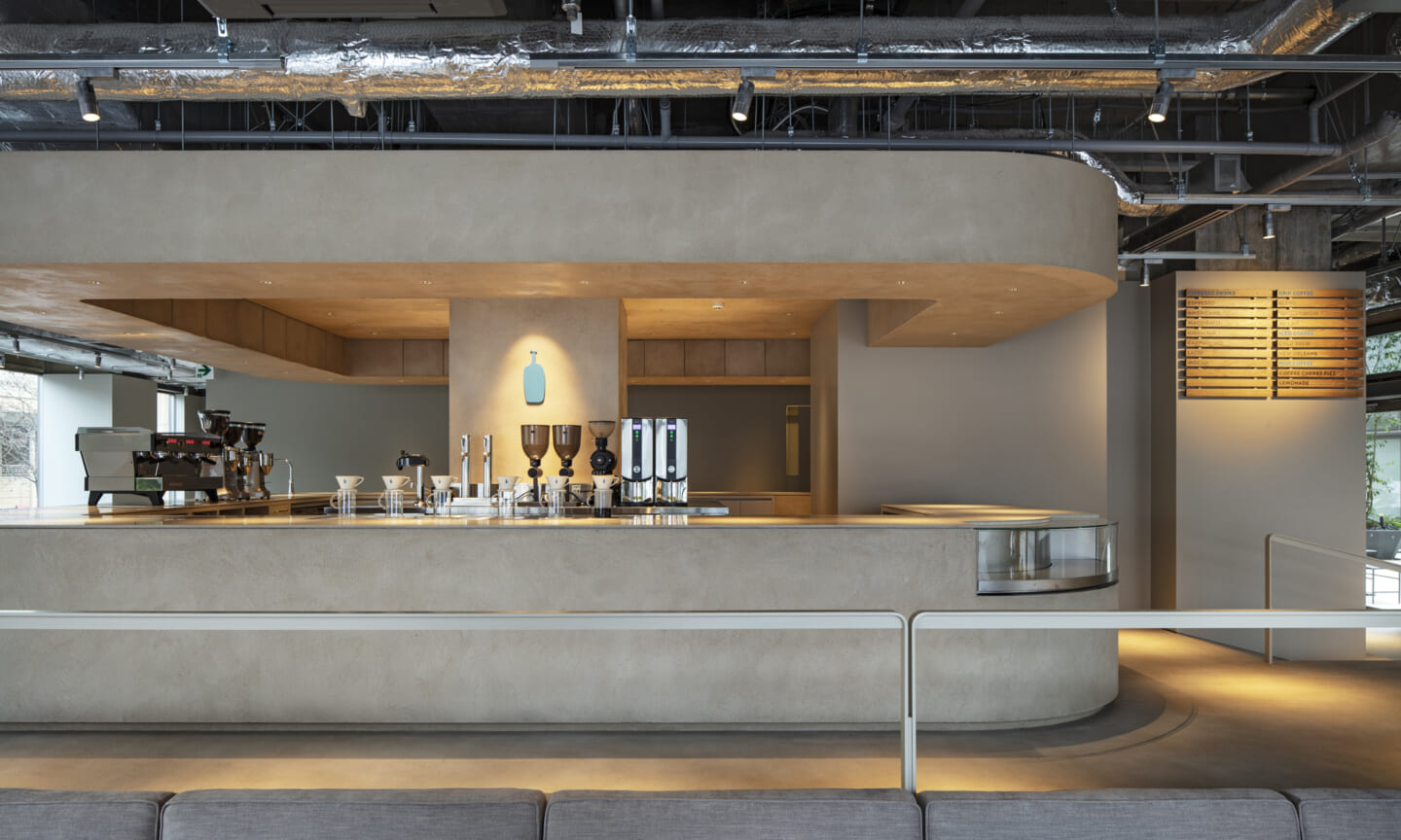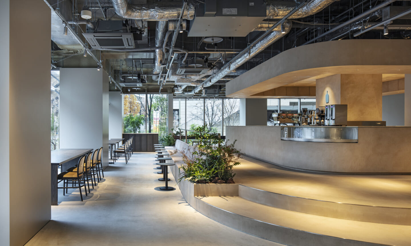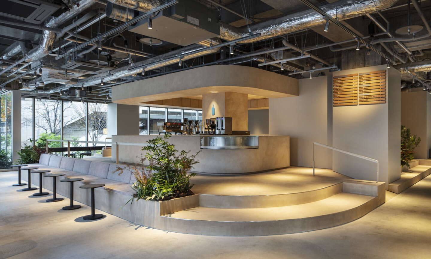 この代官山のカフェでは、地域、文化、地形といったこの街ならではのコンテクストを取り入れたライフスタイル(時間の過ごし方)の体現、ソファー席でゆったり過ごす日本の昔ながらの喫茶店のような居心地をブルーボトルコーヒーらしい解釈で変換する。この2点をデザインのテーマとしました。レジデンス、オフィス、店舗が融合する建築のオープンエアな施設共用部から店内に道を引き込み回遊性を持たせたプランでは、バリスタがコーヒーを煎れる所作が主役になるよう中央にドリンクカウンターを配置。また高低差や坂の多い代官山の地形の特性をなぞるように、段丘状の地形と緑豊かな自然環境を取り込んだレベル差による空間体験をつくり公園のような大らかな場、自宅のソファーで寛ぐようなプライベートな場という異なる居場所が緩やかに繋がり共存するように空間を構成していきました。マテリアルには日々大量に出るコーヒー粉を顔料とした左官仕上げや自然素材を用い、コーヒーを飲むという日常の中にサスティナブルな循環を介在させることでウェルネスで魅力的な暮らしに内包される様々なシーンが融合する“洗練された都市のなかのリビング”として機能する場を目指しました。