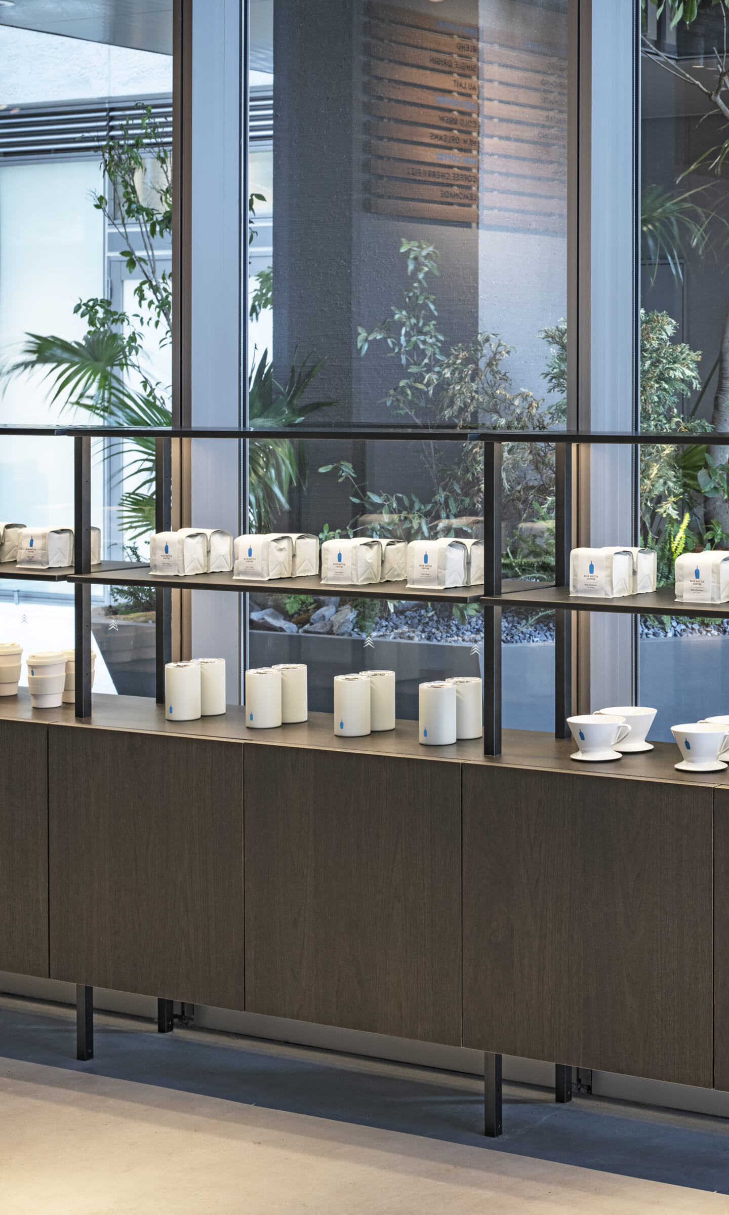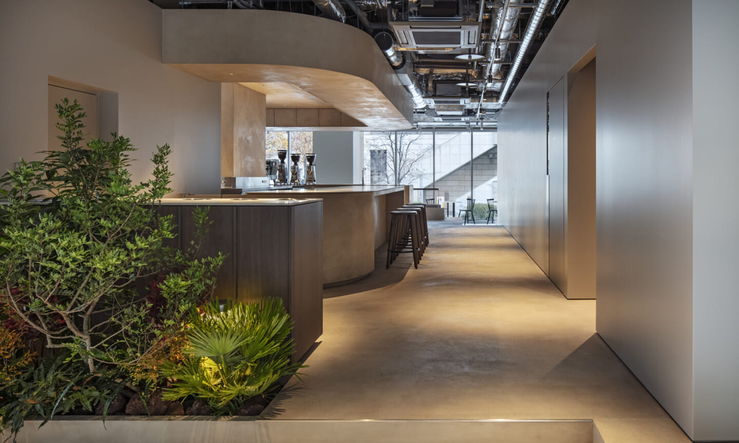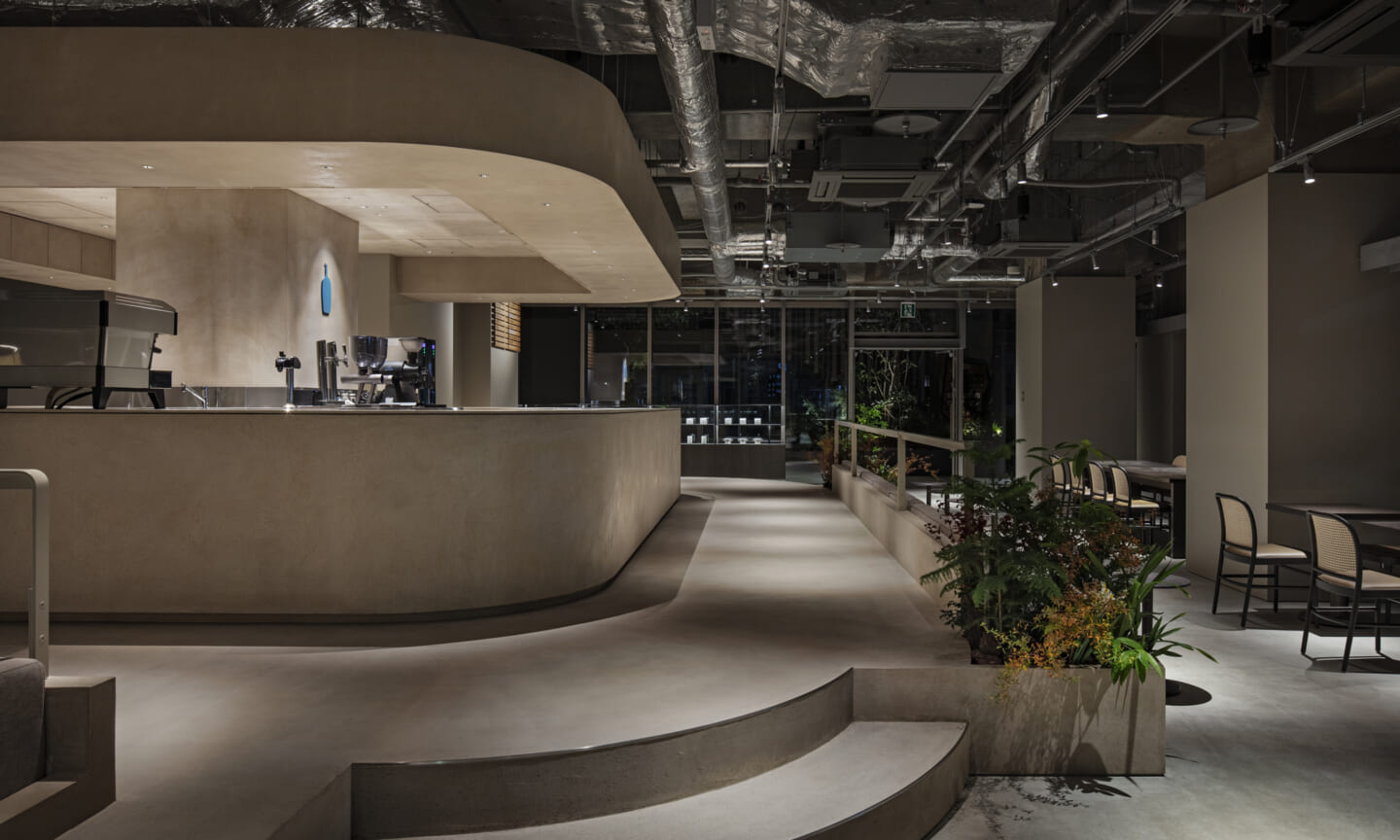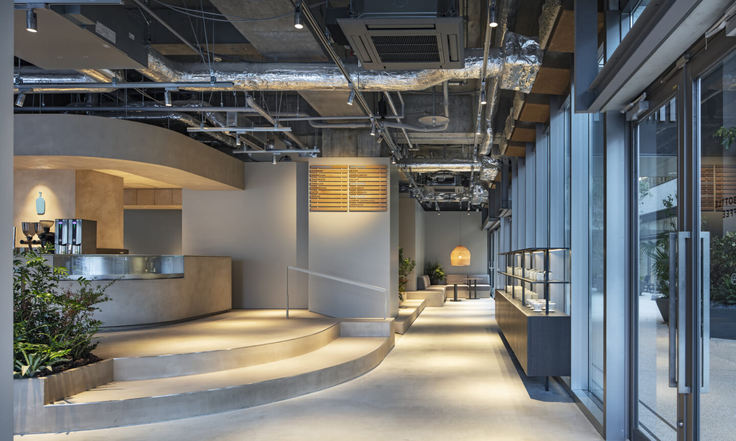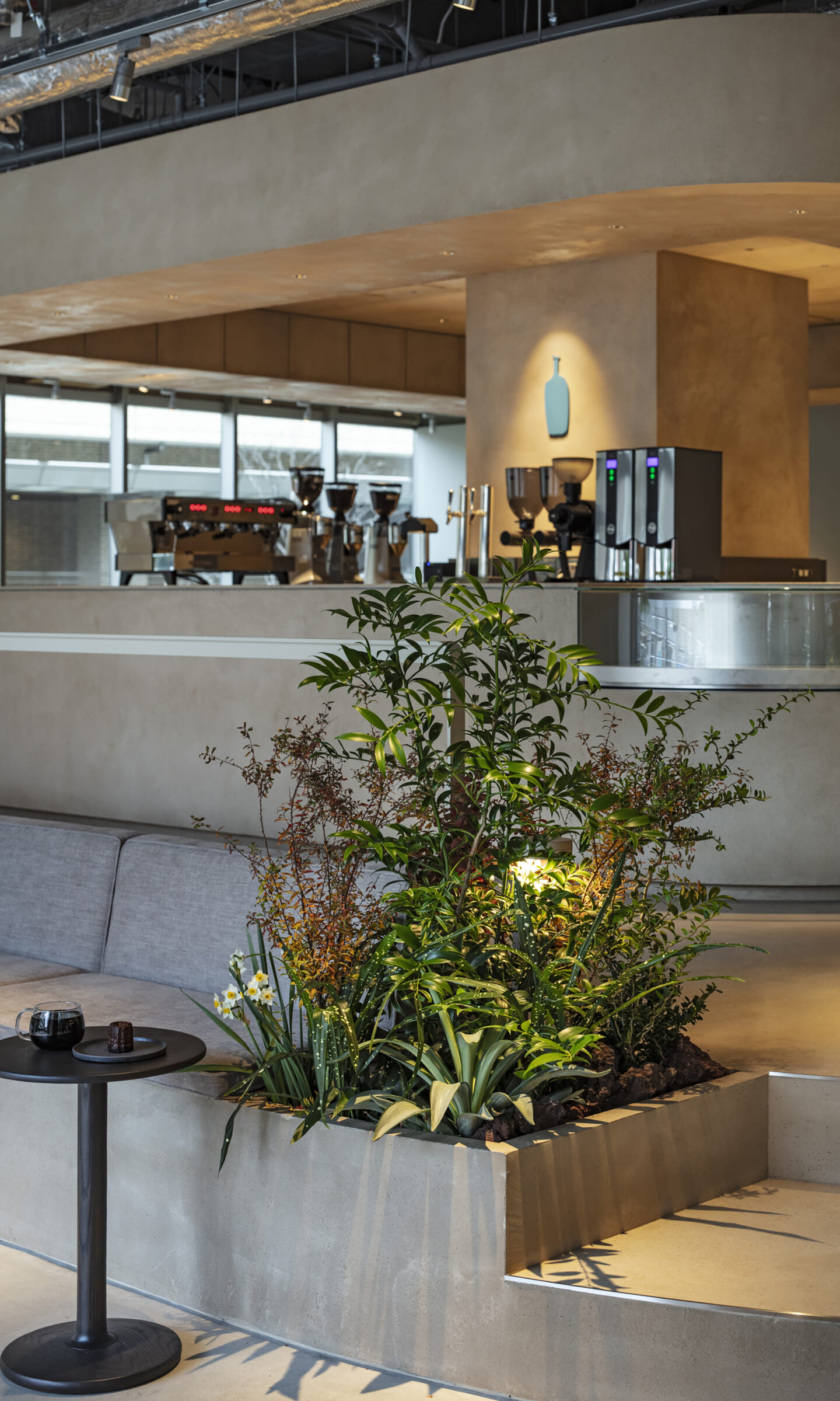 この代官山のカフェでは、地域、文化、地形といったこの街ならではのコンテクストを取り入れたライフスタイル(時間の過ごし方)の体現、ソファー席でゆったり過ごす日本の昔ながらの喫茶店のような居心地をブルーボトルコーヒーらしい解釈で変換する。この2点をデザインのテーマとしました。レジデンス、オフィス、店舗が融合する建築のオープンエアな施設共用部から店内に道を引き込み回遊性を持たせたプランでは、バリスタがコーヒーを煎れる所作が主役になるよう中央にドリンクカウンターを配置。また高低差や坂の多い代官山の地形の特性をなぞるように、段丘状の地形と緑豊かな自然環境を取り込んだレベル差による空間体験をつくり公園のような大らかな場、自宅のソファーで寛ぐようなプライベートな場という異なる居場所が緩やかに繋がり共存するように空間を構成していきました。マテリアルには日々大量に出るコーヒー粉を顔料とした左官仕上げや自然素材を用い、コーヒーを飲むという日常の中にサスティナブルな循環を介在させることでウェルネスで魅力的な暮らしに内包される様々なシーンが融合する“洗練された都市のなかのリビング”として機能する場を目指しました。