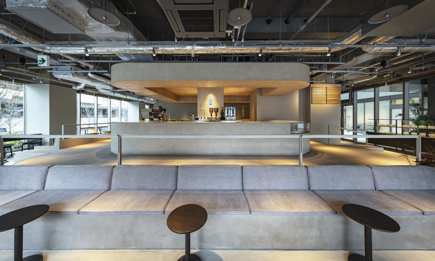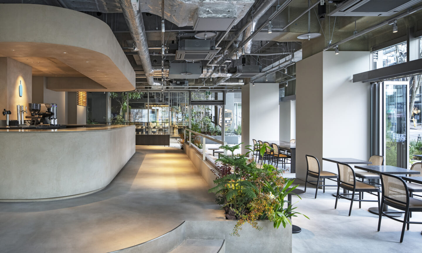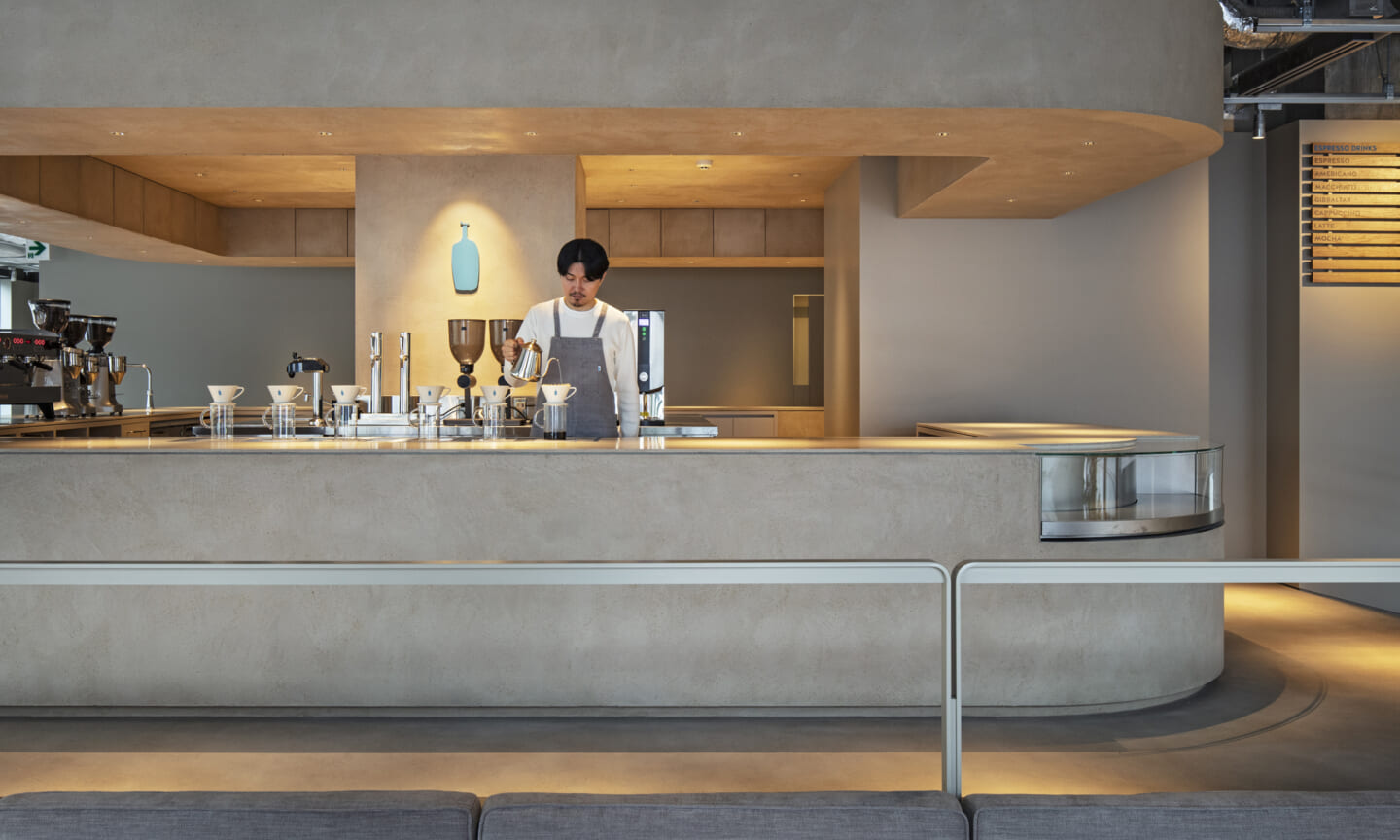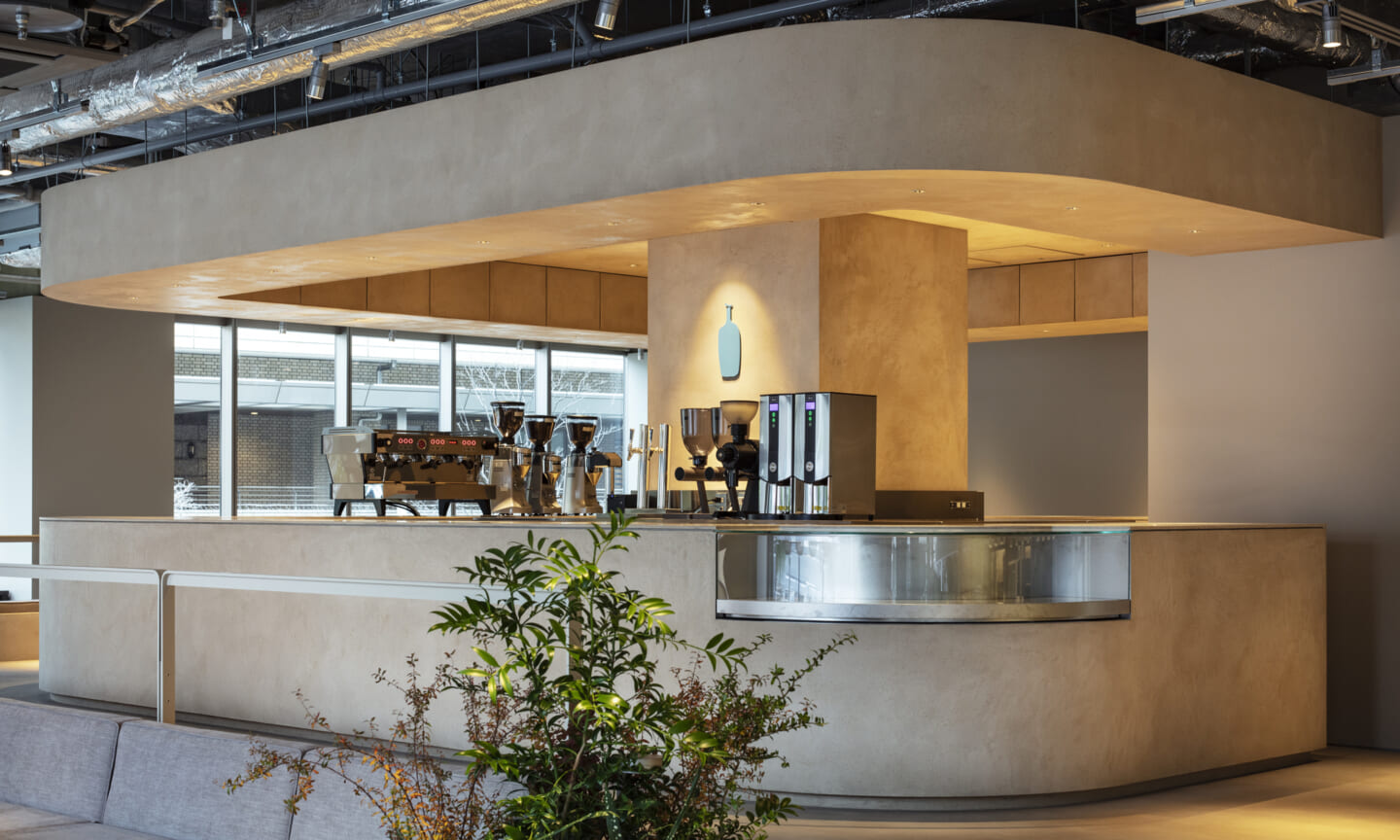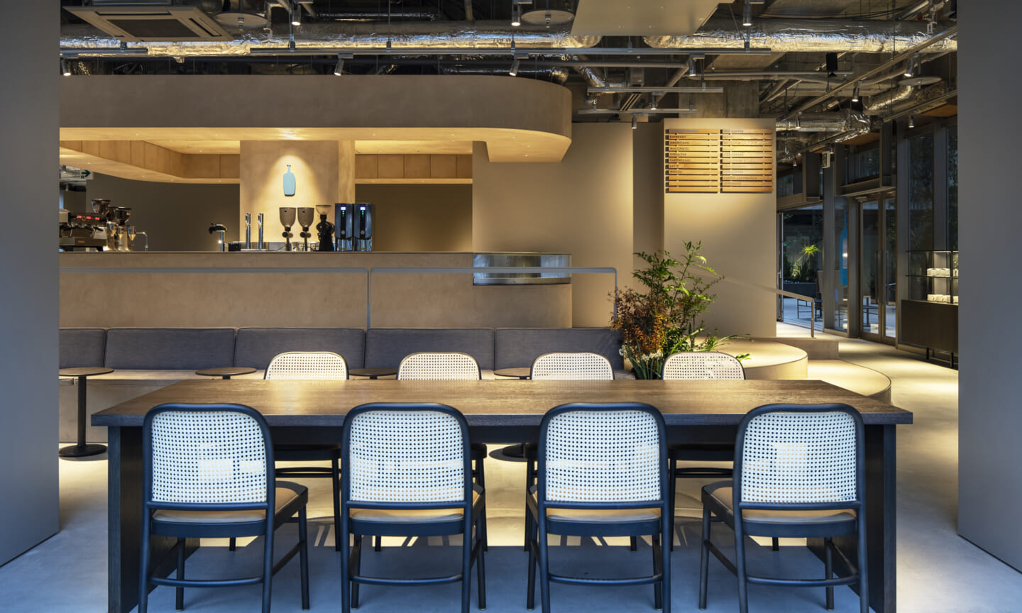 この代官山のカフェでは、地域、文化、地形といったこの街ならではのコンテクストを取り入れたライフスタイル(時間の過ごし方)の体現、ソファー席でゆったり過ごす日本の昔ながらの喫茶店のような居心地をブルーボトルコーヒーらしい解釈で変換する。この2点をデザインのテーマとしました。レジデンス、オフィス、店舗が融合する建築のオープンエアな施設共用部から店内に道を引き込み回遊性を持たせたプランでは、バリスタがコーヒーを煎れる所作が主役になるよう中央にドリンクカウンターを配置。また高低差や坂の多い代官山の地形の特性をなぞるように、段丘状の地形と緑豊かな自然環境を取り込んだレベル差による空間体験をつくり公園のような大らかな場、自宅のソファーで寛ぐようなプライベートな場という異なる居場所が緩やかに繋がり共存するように空間を構成していきました。マテリアルには日々大量に出るコーヒー粉を顔料とした左官仕上げや自然素材を用い、コーヒーを飲むという日常の中にサスティナブルな循環を介在させることでウェルネスで魅力的な暮らしに内包される様々なシーンが融合する“洗練された都市のなかのリビング”として機能する場を目指しました。