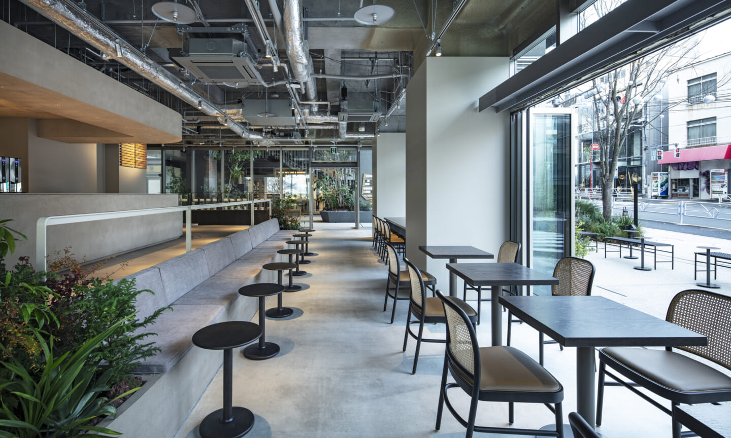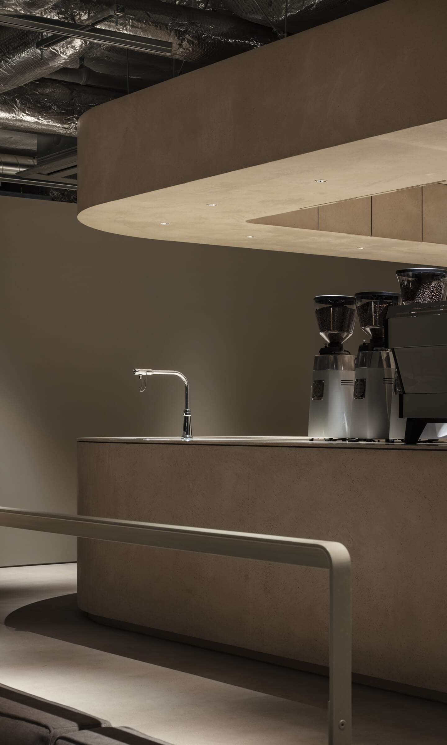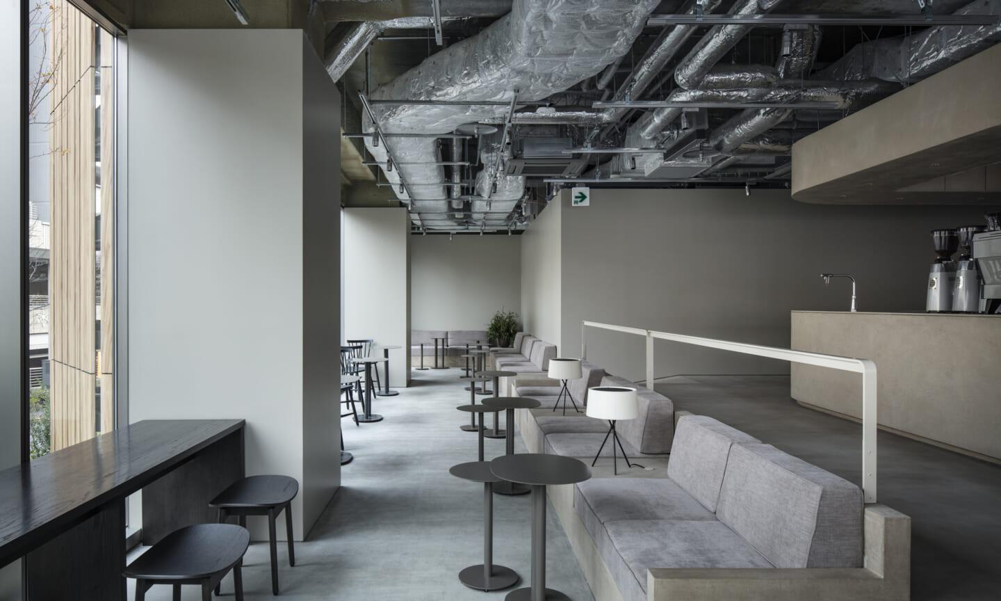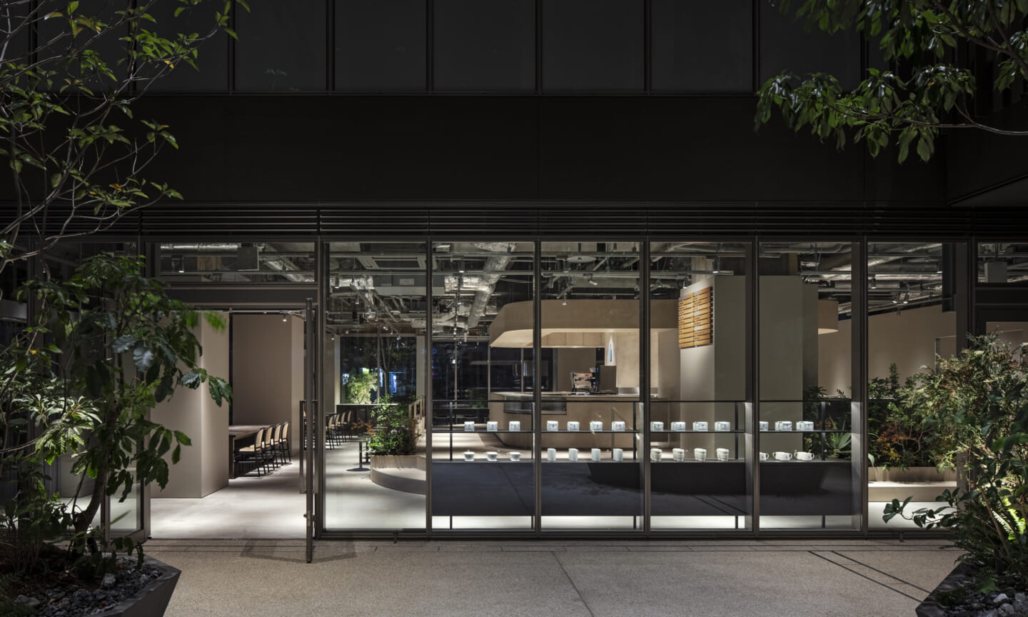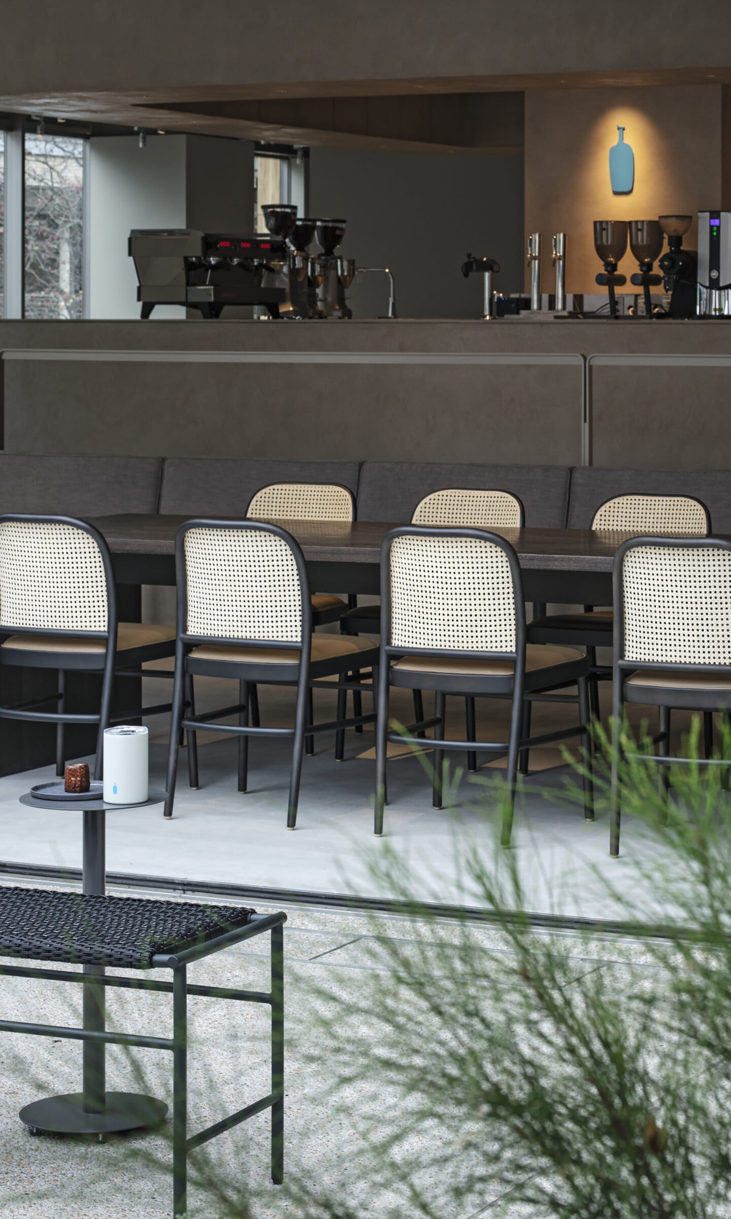 この代官山のカフェでは、地域、文化、地形といったこの街ならではのコンテクストを取り入れたライフスタイル(時間の過ごし方)の体現、ソファー席でゆったり過ごす日本の昔ながらの喫茶店のような居心地をブルーボトルコーヒーらしい解釈で変換する。この2点をデザインのテーマとしました。レジデンス、オフィス、店舗が融合する建築のオープンエアな施設共用部から店内に道を引き込み回遊性を持たせたプランでは、バリスタがコーヒーを煎れる所作が主役になるよう中央にドリンクカウンターを配置。また高低差や坂の多い代官山の地形の特性をなぞるように、段丘状の地形と緑豊かな自然環境を取り込んだレベル差による空間体験をつくり公園のような大らかな場、自宅のソファーで寛ぐようなプライベートな場という異なる居場所が緩やかに繋がり共存するように空間を構成していきました。マテリアルには日々大量に出るコーヒー粉を顔料とした左官仕上げや自然素材を用い、コーヒーを飲むという日常の中にサスティナブルな循環を介在させることでウェルネスで魅力的な暮らしに内包される様々なシーンが融合する“洗練された都市のなかのリビング”として機能する場を目指しました。
