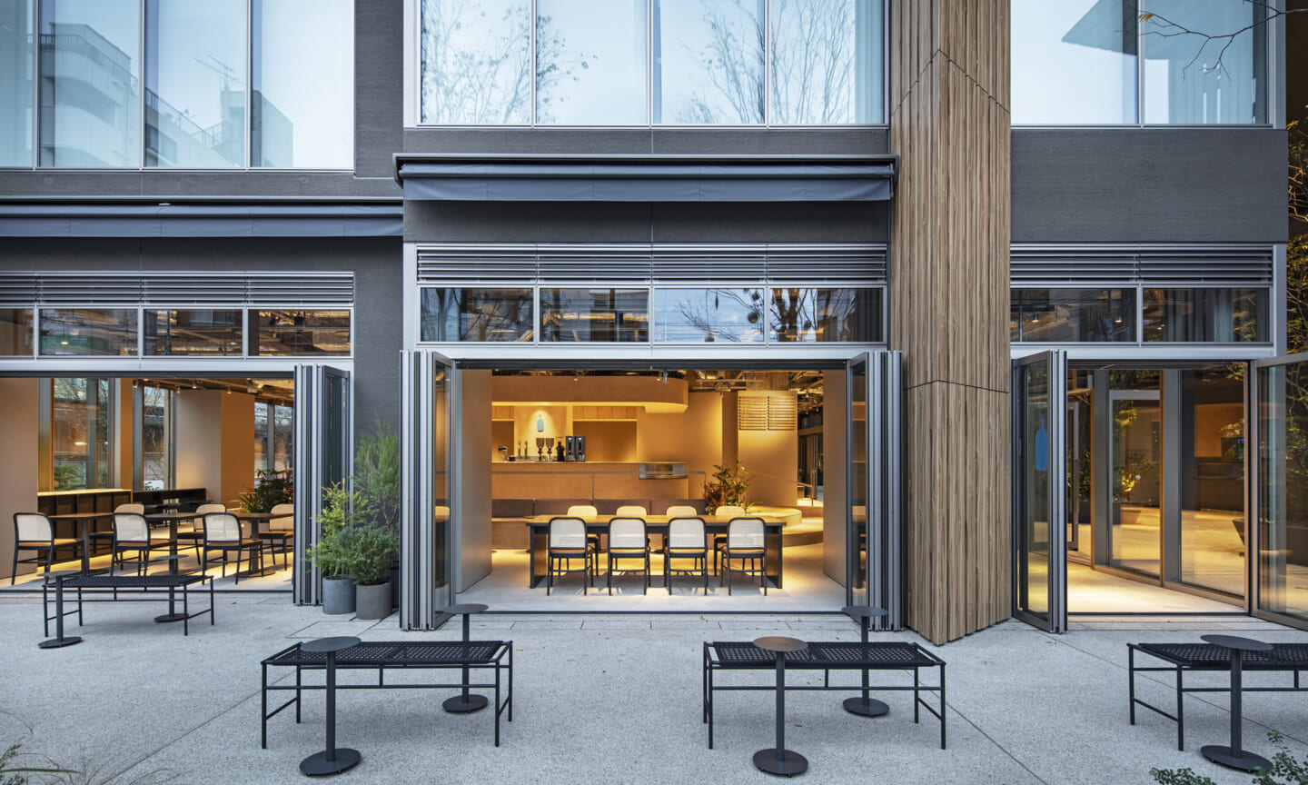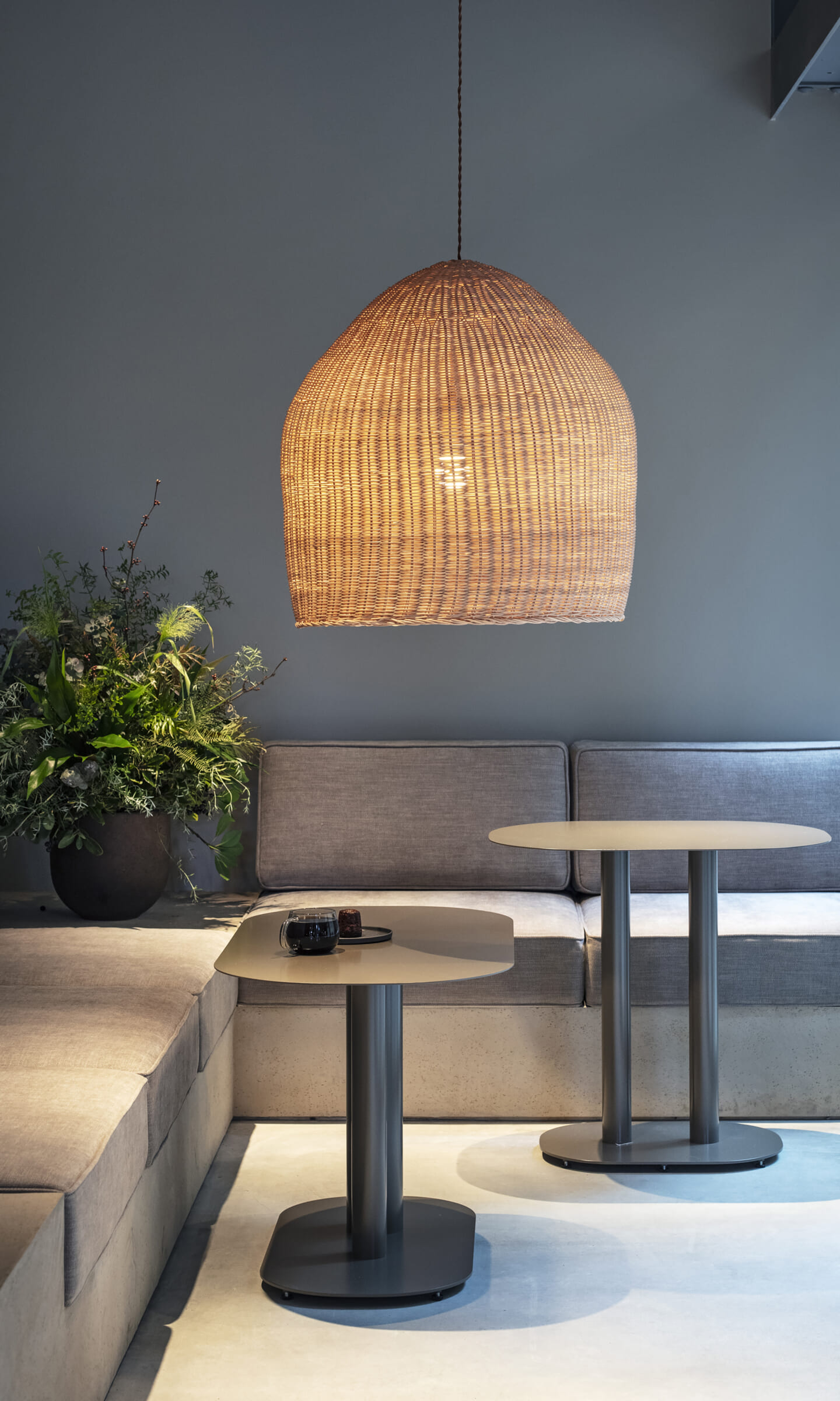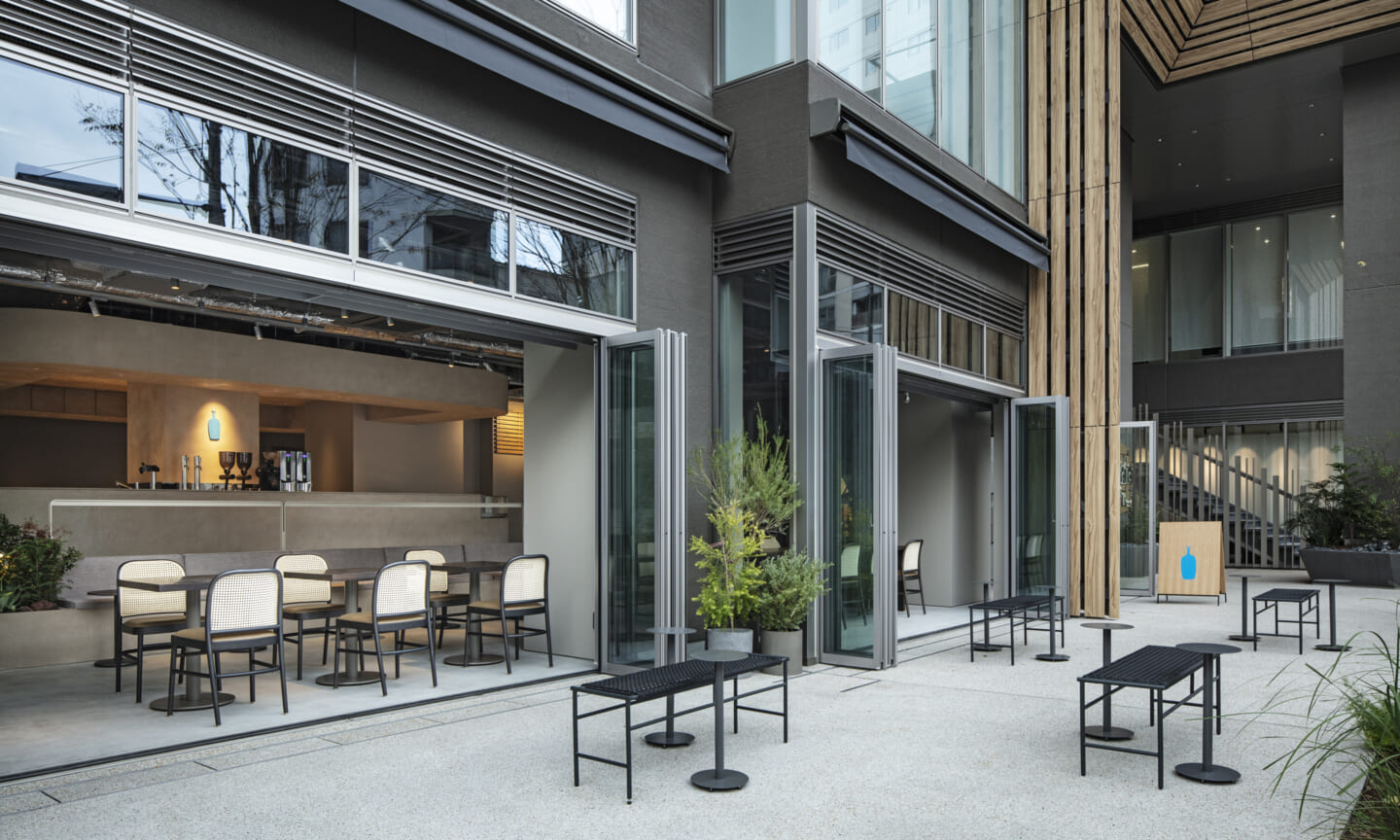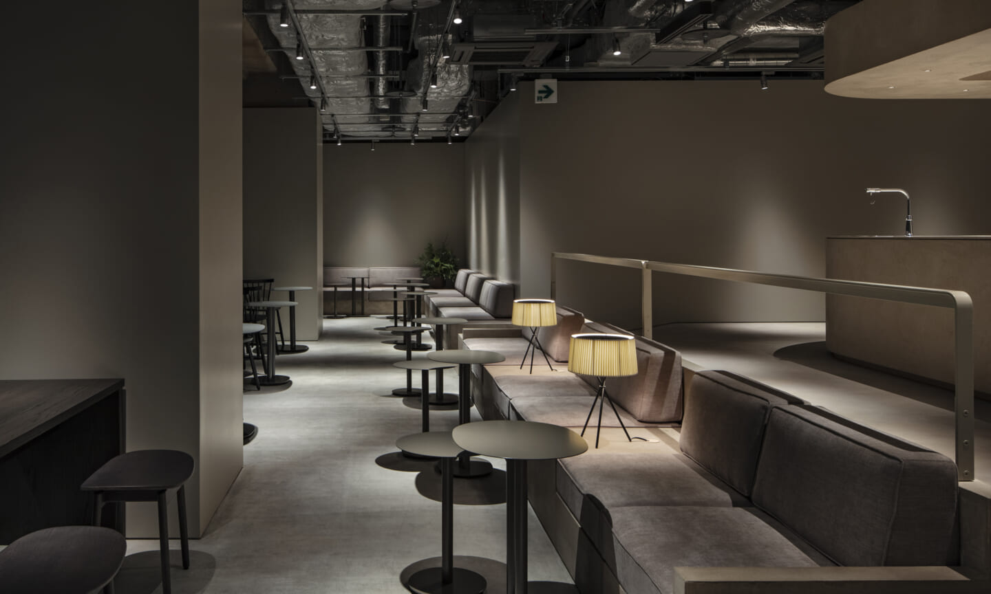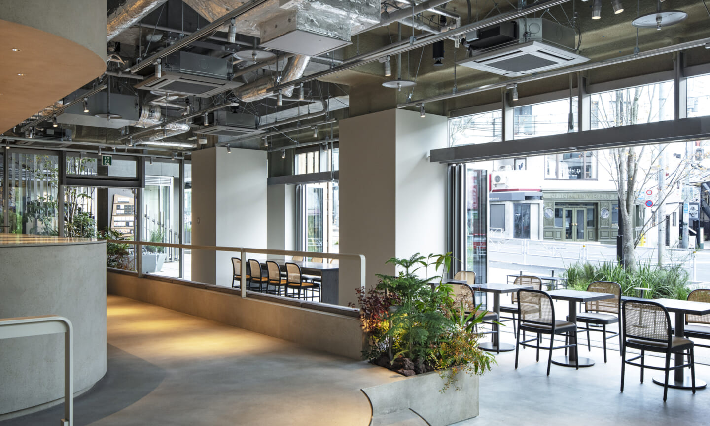 この代官山のカフェでは、地域、文化、地形といったこの街ならではのコンテクストを取り入れたライフスタイル(時間の過ごし方)の体現、ソファー席でゆったり過ごす日本の昔ながらの喫茶店のような居心地をブルーボトルコーヒーらしい解釈で変換する。この2点をデザインのテーマとしました。レジデンス、オフィス、店舗が融合する建築のオープンエアな施設共用部から店内に道を引き込み回遊性を持たせたプランでは、バリスタがコーヒーを煎れる所作が主役になるよう中央にドリンクカウンターを配置。また高低差や坂の多い代官山の地形の特性をなぞるように、段丘状の地形と緑豊かな自然環境を取り込んだレベル差による空間体験をつくり公園のような大らかな場、自宅のソファーで寛ぐようなプライベートな場という異なる居場所が緩やかに繋がり共存するように空間を構成していきました。マテリアルには日々大量に出るコーヒー粉を顔料とした左官仕上げや自然素材を用い、コーヒーを飲むという日常の中にサスティナブルな循環を介在させることでウェルネスで魅力的な暮らしに内包される様々なシーンが融合する“洗練された都市のなかのリビング”として機能する場を目指しました。