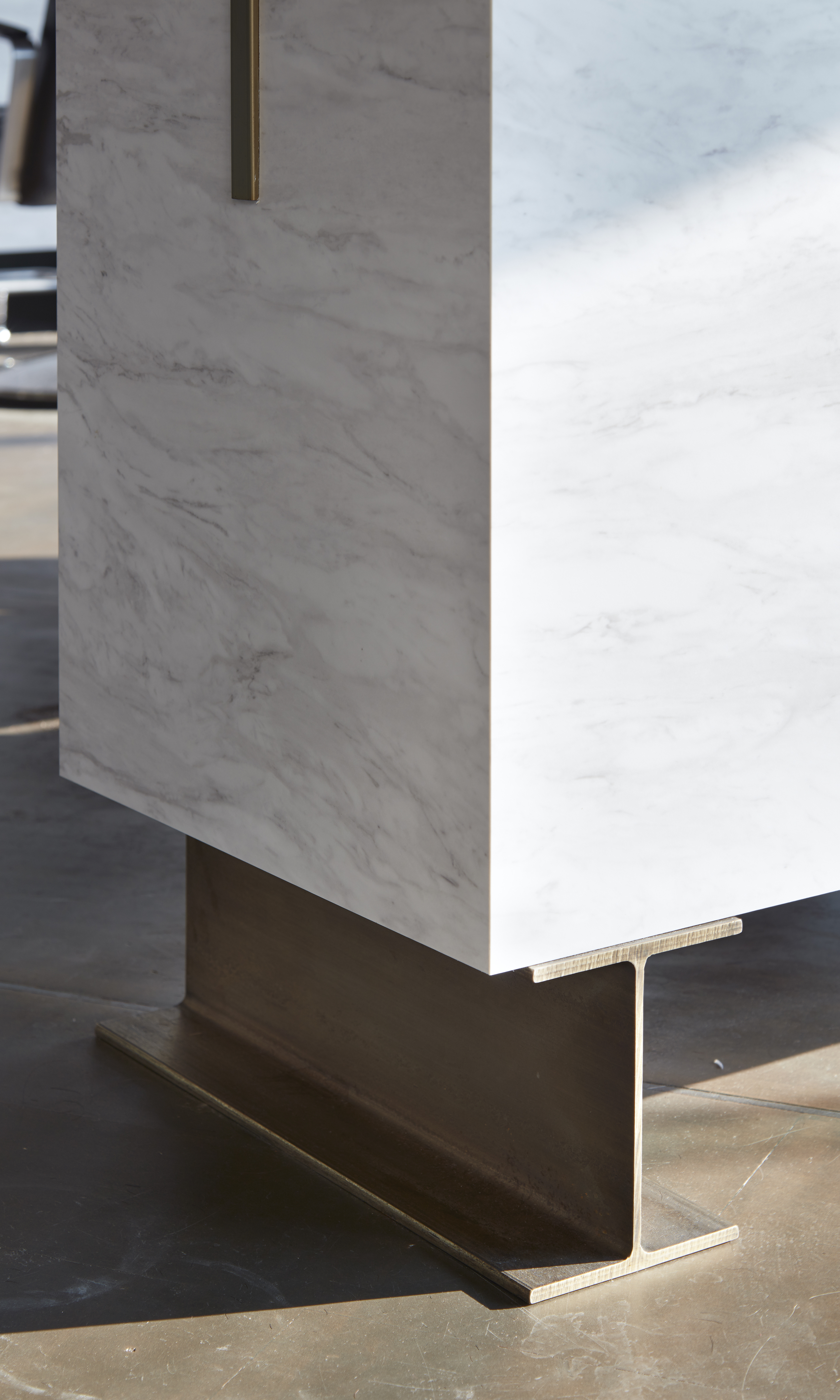 まず『削ぎ落としていく=解体』という行為において、竹のフローリングとガラスのショーケースは残し、過去につくられた記憶を継承することにした。そうやって削ぎ落とした空間の中で、既存の柱や梁などの躯体をひとつの塊と見立て、新しく加える什器や間仕切りを全て塊とすることで、徹底的に空間を彫刻化した。その中でもカット什器の塊は、H鋼の上に置くことで、ヘアカットという行為が行われる芸術作品としてひきたてた。