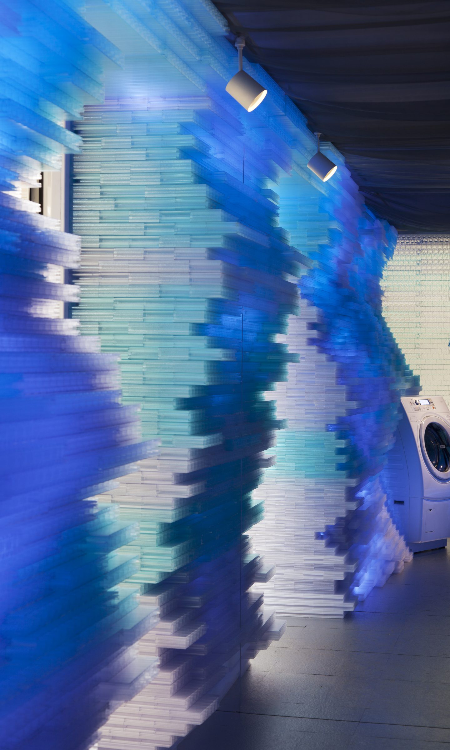 私達は利便性を求める故にテクノロジーを進化させ、それと同時に本来の自然を求めて暮らしています。テクノロジーの進化の先は、どれだけ自然に近い状況をつくりだせるかという人間と自然の共存だと考えます。「自然の与えてくれる心地よさ、快適さに習って、知恵と柔軟な発想に基づき人々の暮らしに未来を届けること」そんな未来を提案する企業のイメージを「人工物で自然現象をつくる」ことで可視化した空間です。