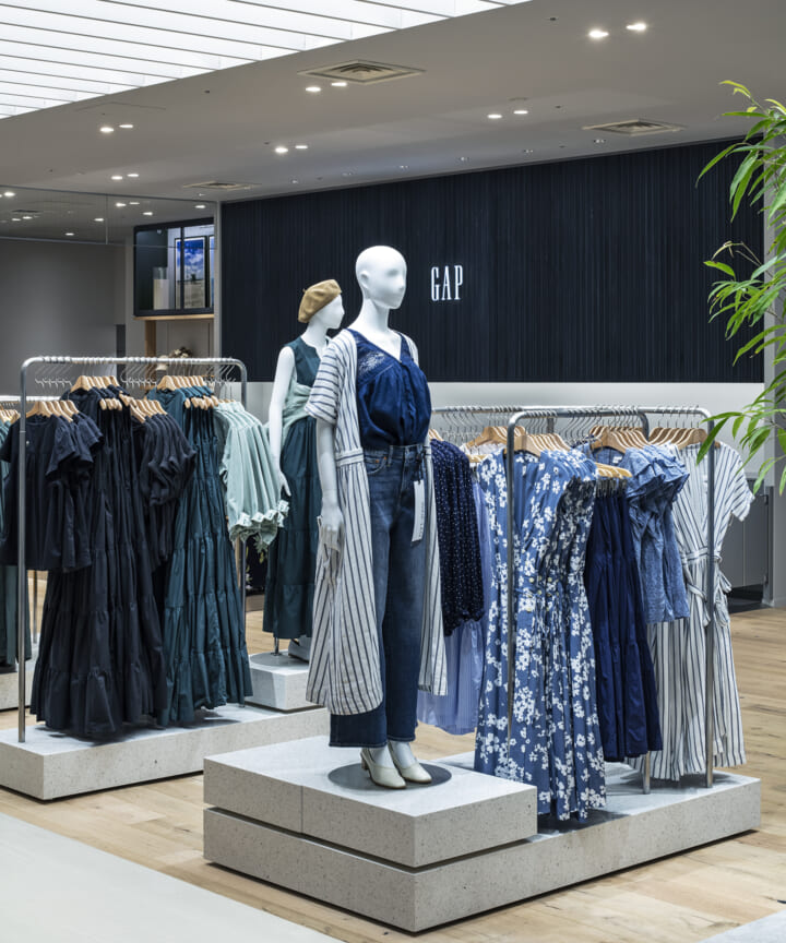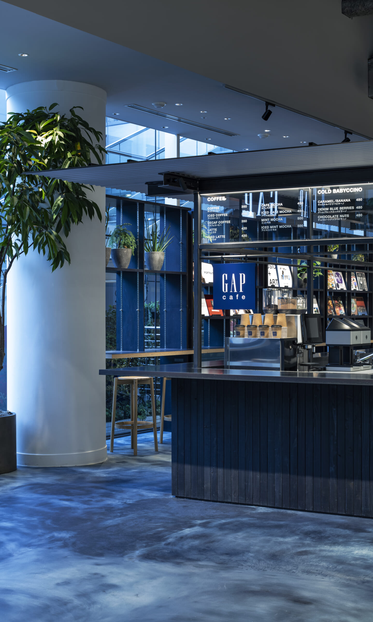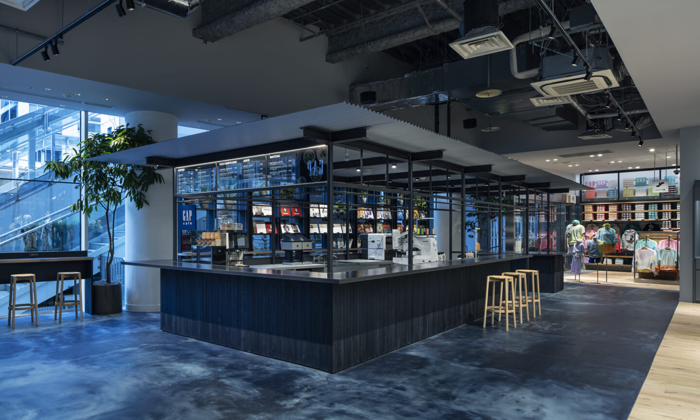 ブランドのアイデンティティーを担うデニムを象徴するインディコ染めを日本の技術に置き換え空間自体を藍染で染めて仕上げたカフェ。そのカフェの存在自体を風景と捉えて計画した物販エリアや、自然光が降り注ぐような心地良さをつくる照明計画などによって"説明的でなく感覚的に"カルフォルニアの空気感をまとうGapの世界観を体験として知って貰う場となるように全体を計画し、会話などの日常の情報を介し多様な文化が発酵してゆく場である「カフェ」の要素と「売り場」を融合させていった。
