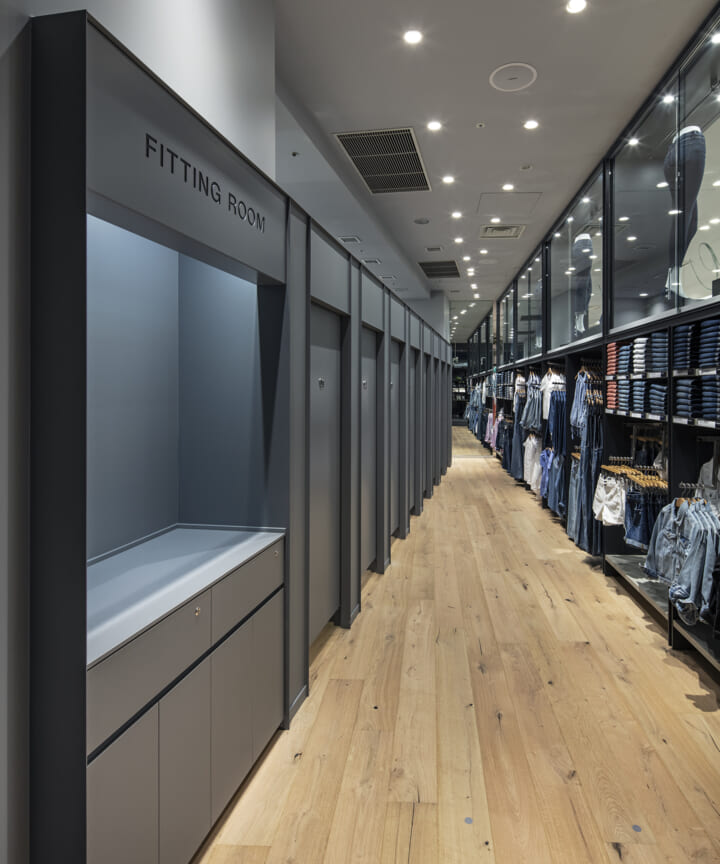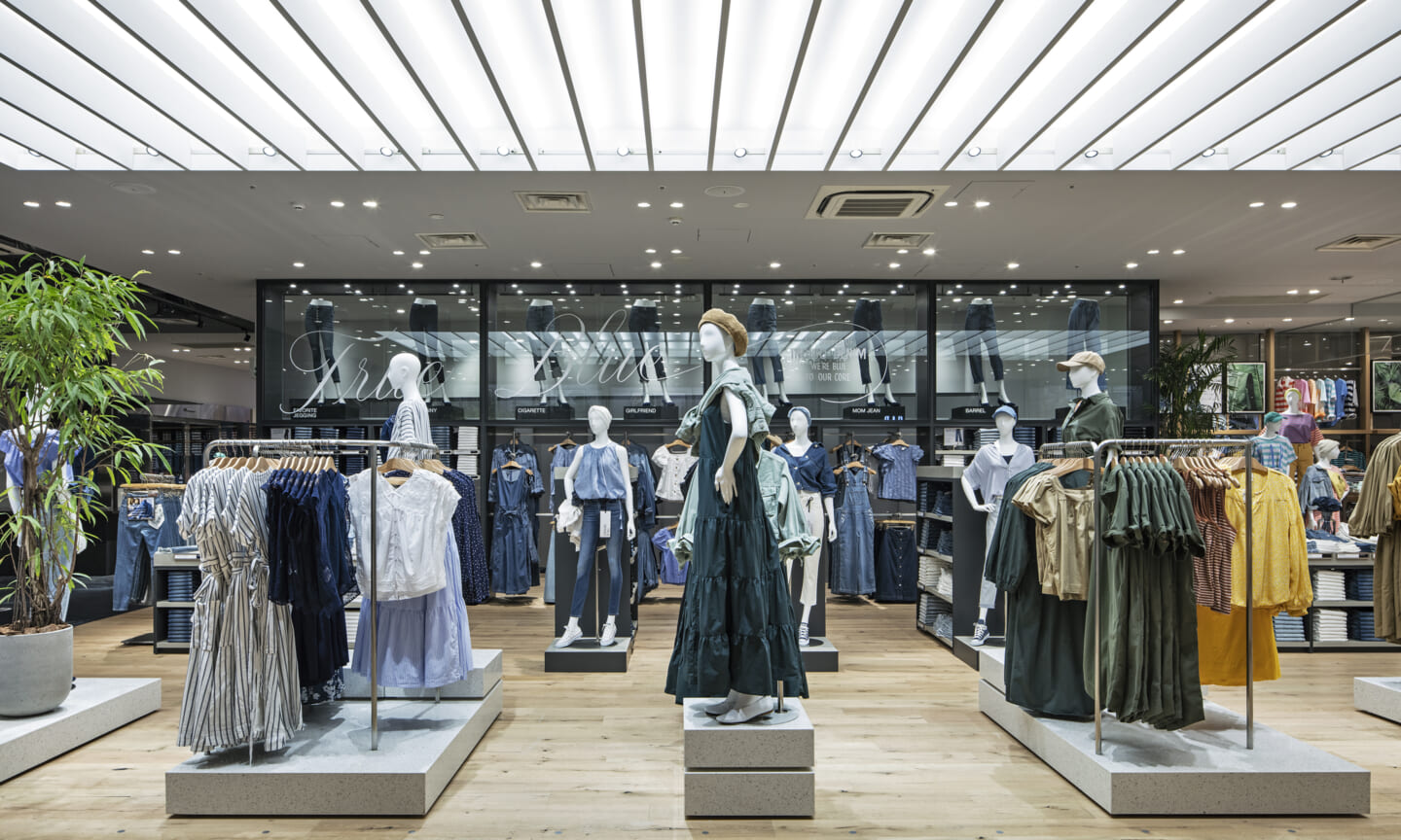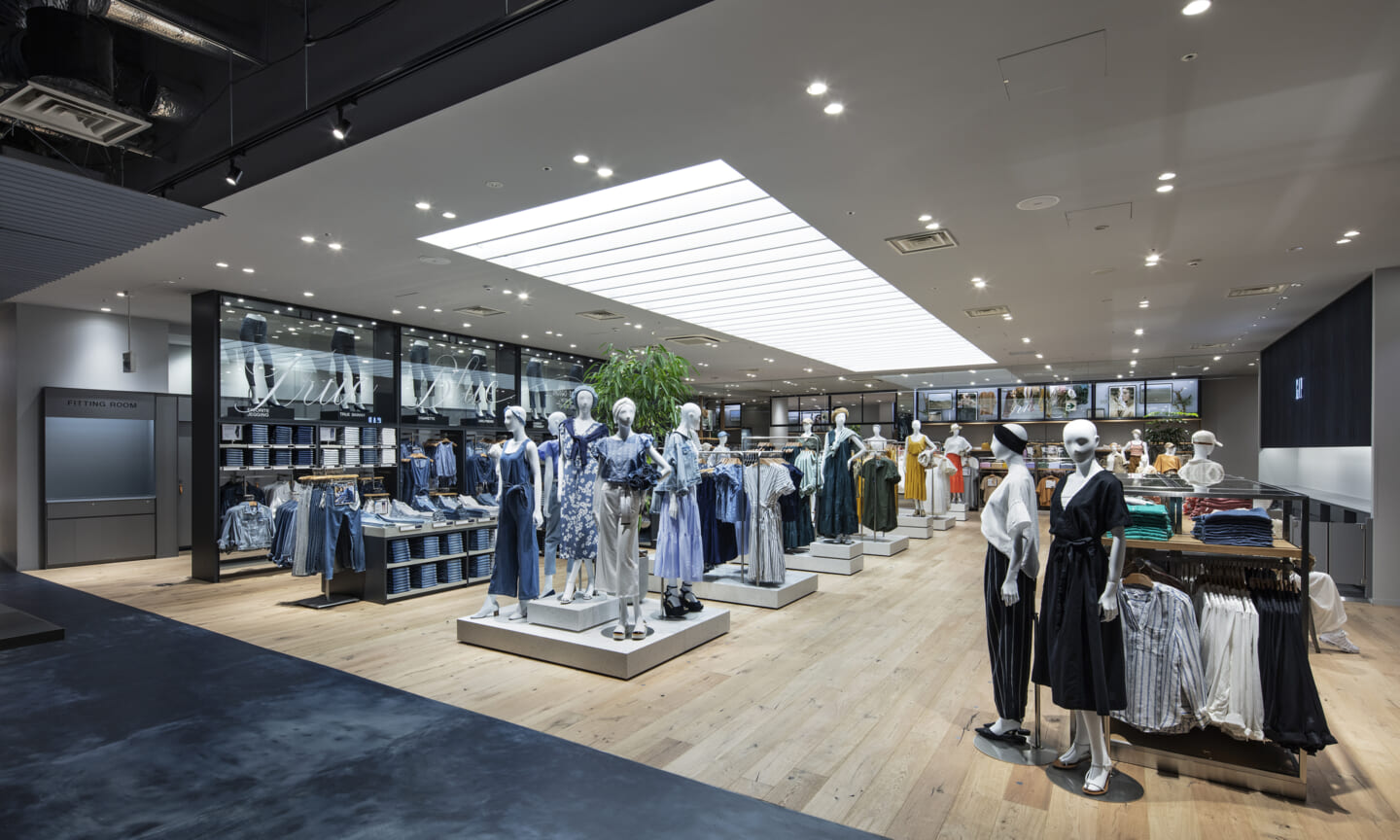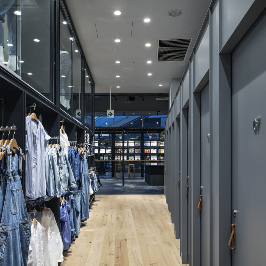 ブランドのアイデンティティーを担うデニムを象徴するインディコ染めを日本の技術に置き換え空間自体を藍染で染めて仕上げたカフェ。そのカフェの存在自体を風景と捉えて計画した物販エリアや、自然光が降り注ぐような心地良さをつくる照明計画などによって"説明的でなく感覚的に"カルフォルニアの空気感をまとうGapの世界観を体験として知って貰う場となるように全体を計画し、会話などの日常の情報を介し多様な文化が発酵してゆく場である「カフェ」の要素と「売り場」を融合させていった。