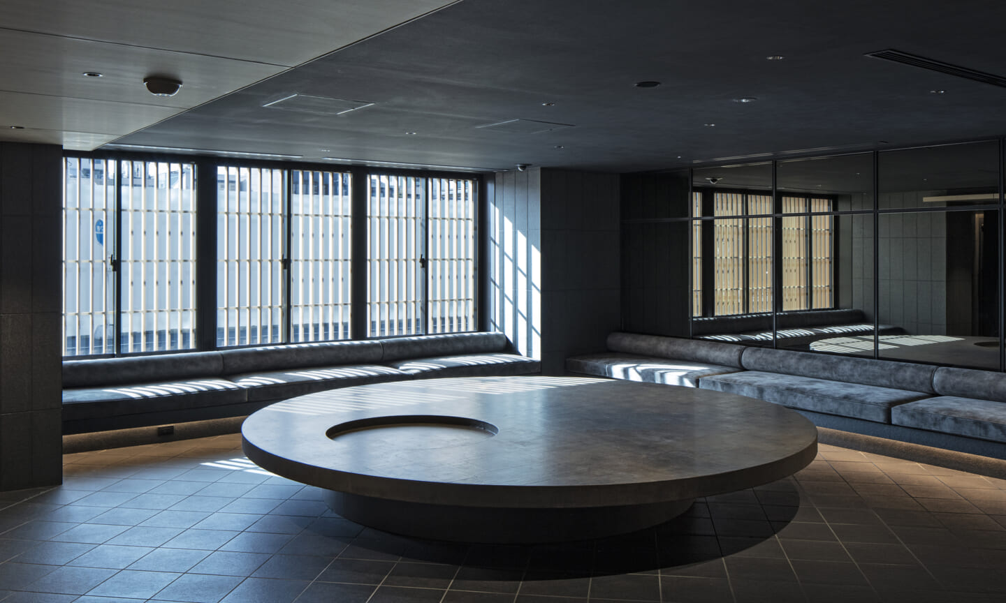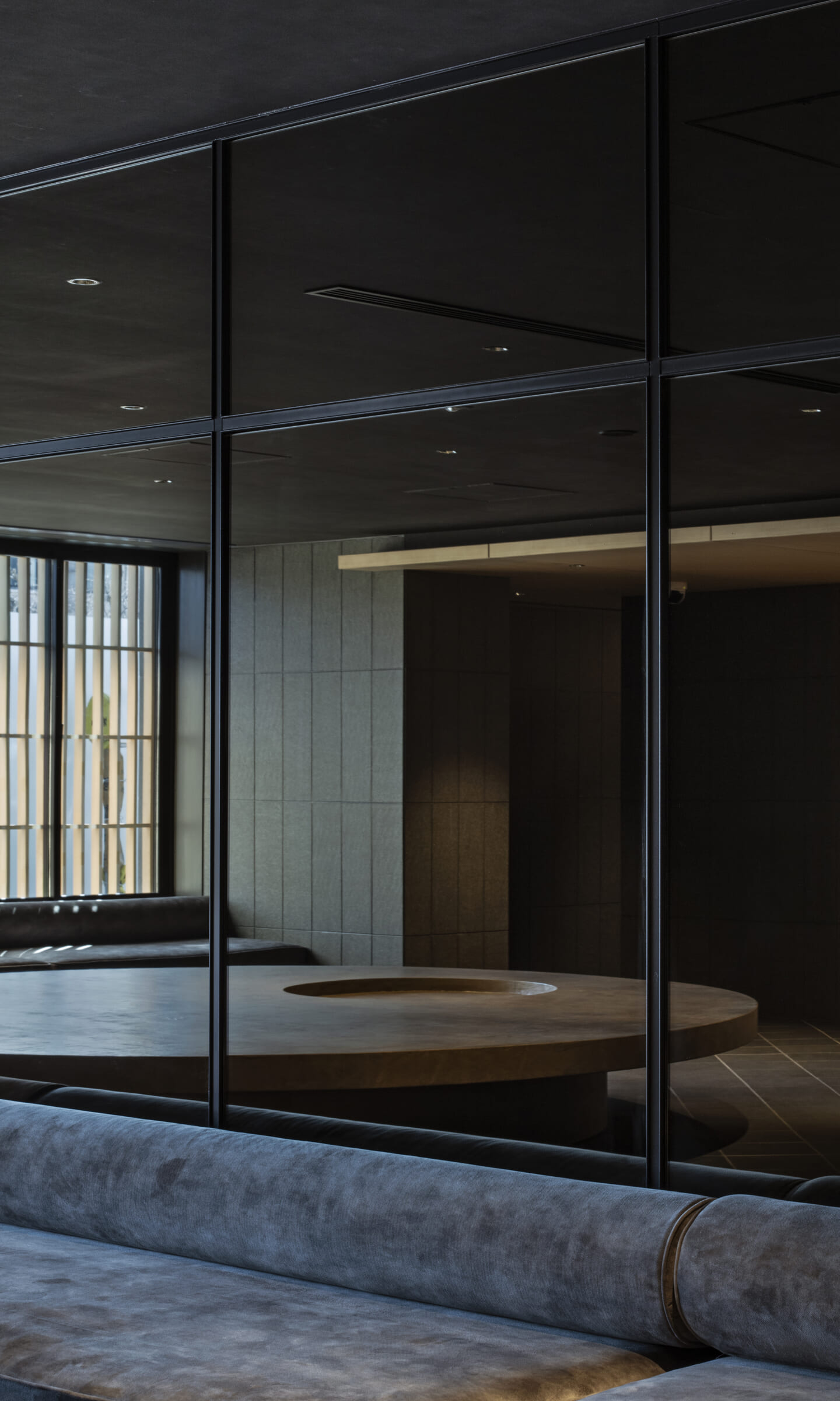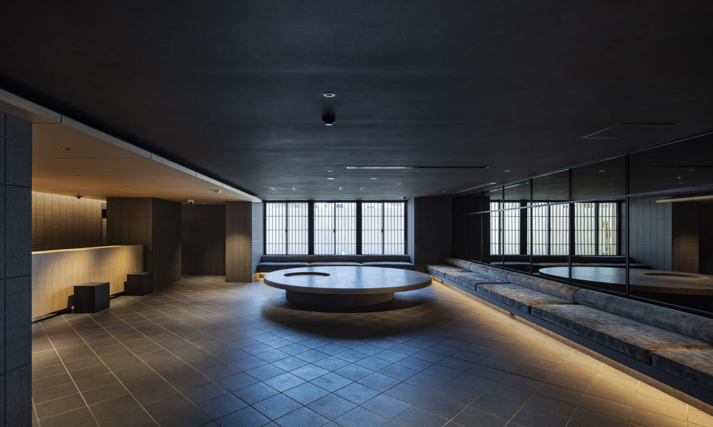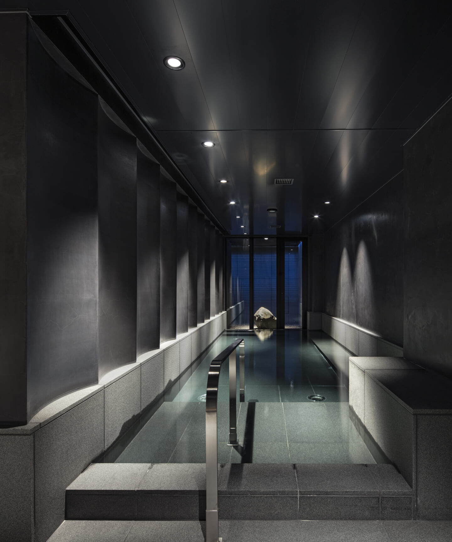 建物の中心を貫く中庭は、鑑賞する庭としてだけでなく“光の場”として計画に取り入れた。奥を表現するには当然ながら手前が必要となる。手前に暗さをつくり目線の先に光(中庭)を配することで、レストランやロビーでは格子枠で低く絞った開口部から差し込む光が、また地下の大浴場では上部からの光が曲面が連続する壁に陰影をつくり空間の奥行きを感じさせる。色味を抑えた仕上げでさらに明暗の対比を強調し、光と奥行きを顕在化させた。
