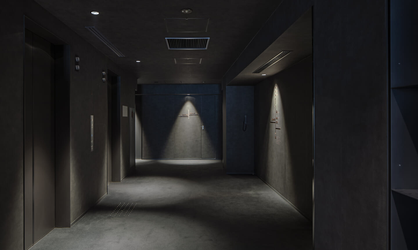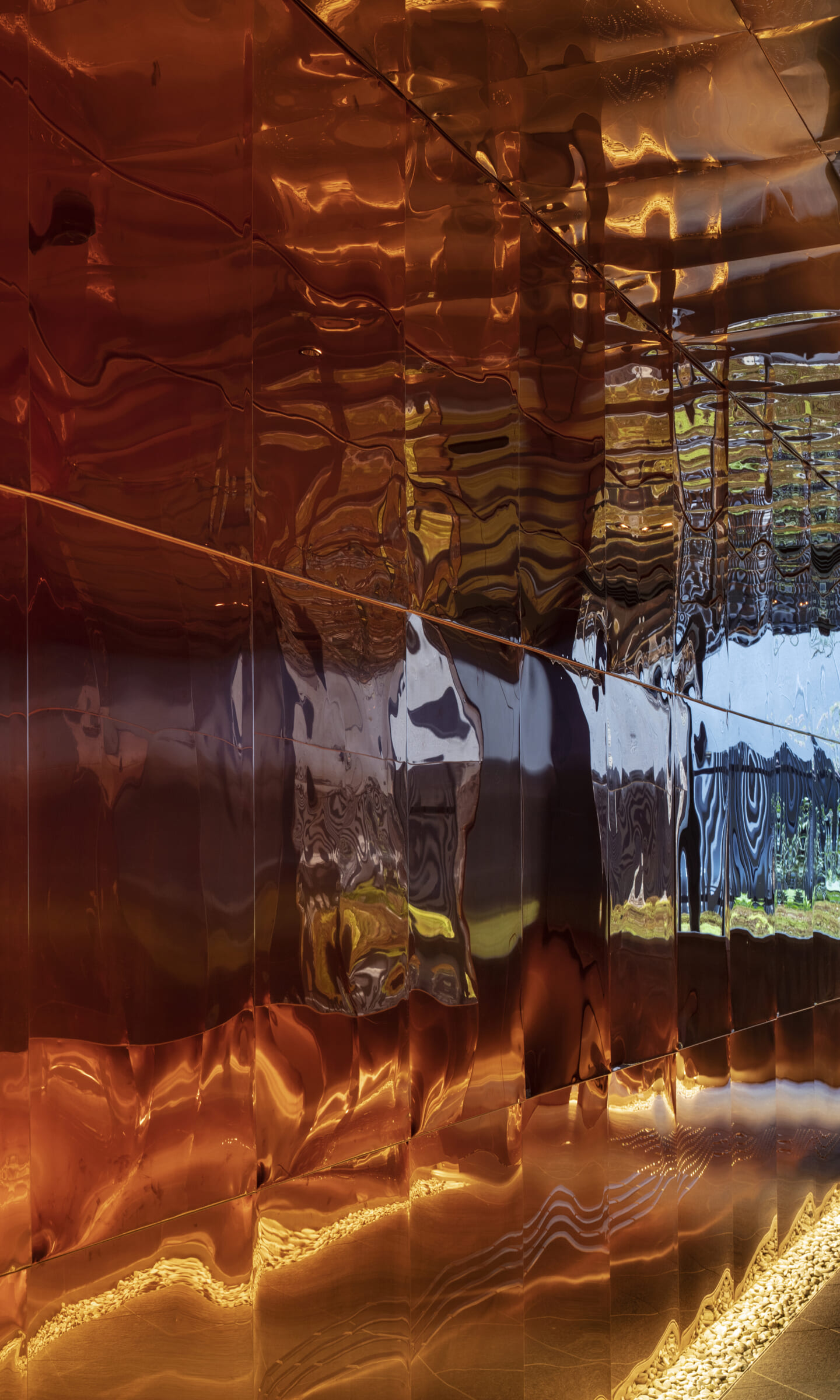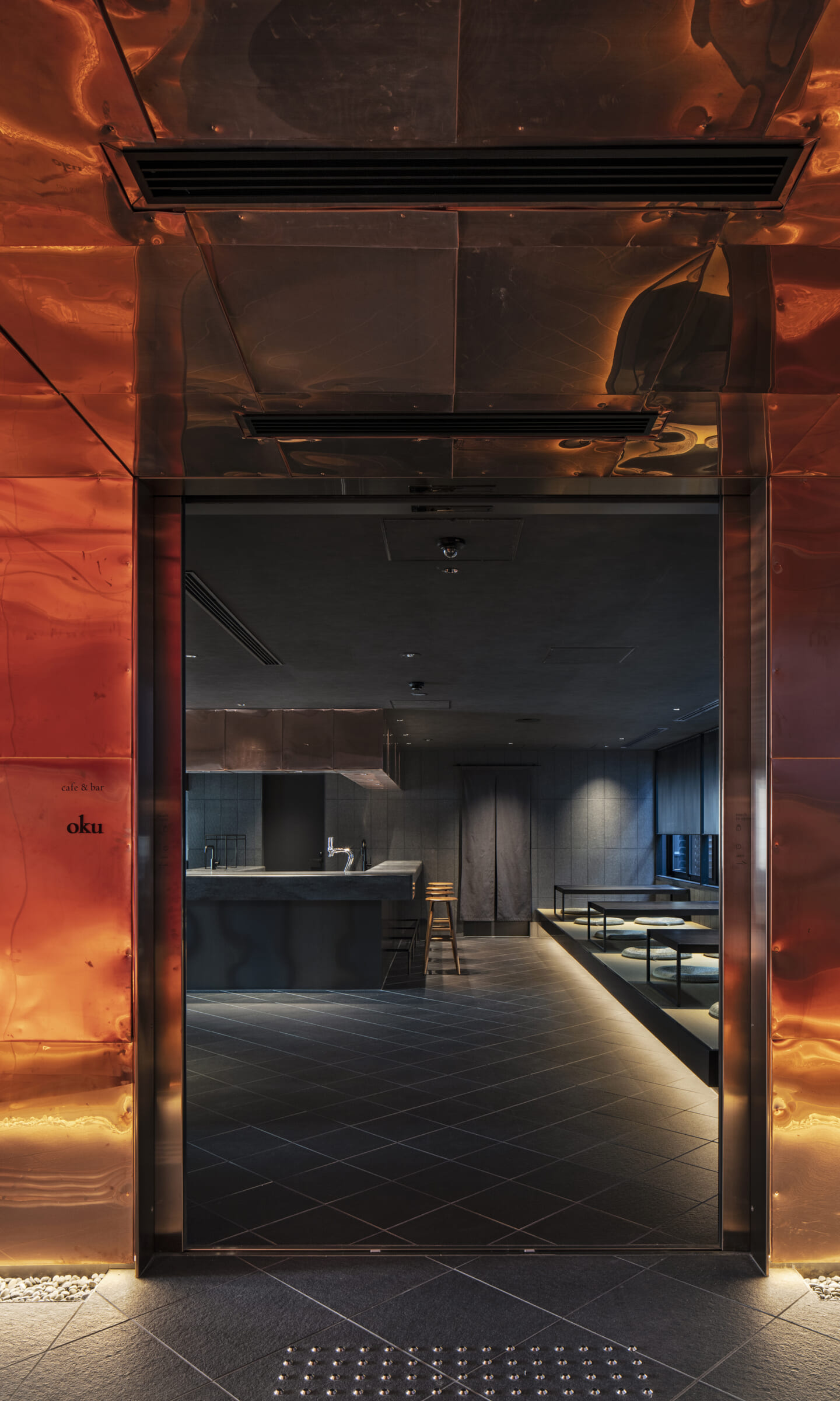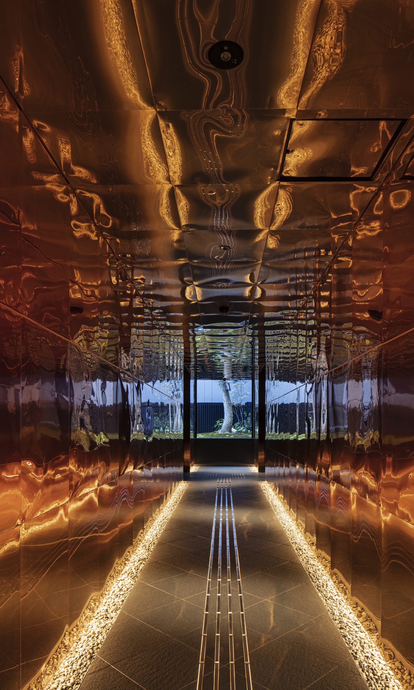 ホテルの第一印象をつくるアプローチ。ここは細長い銅の箱を建築内部に挿入するように構成し、奥の光を目指し細く長い路地を歩く体験が、街の喧騒から静けさへと気持ちをシフトさせエントランロビーにとって前室のような存在として作用する。