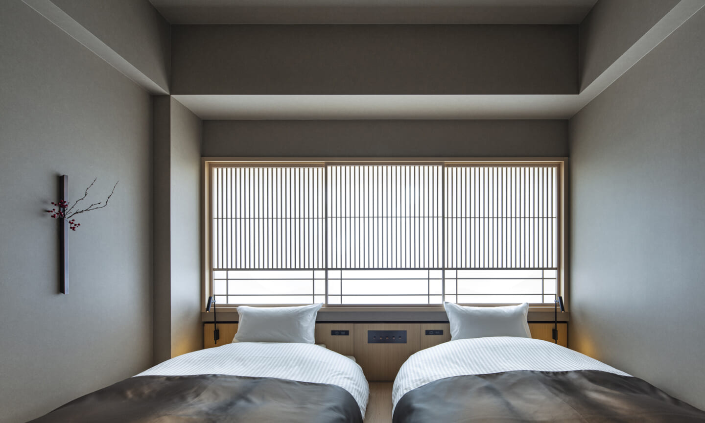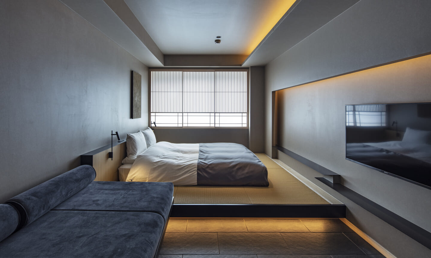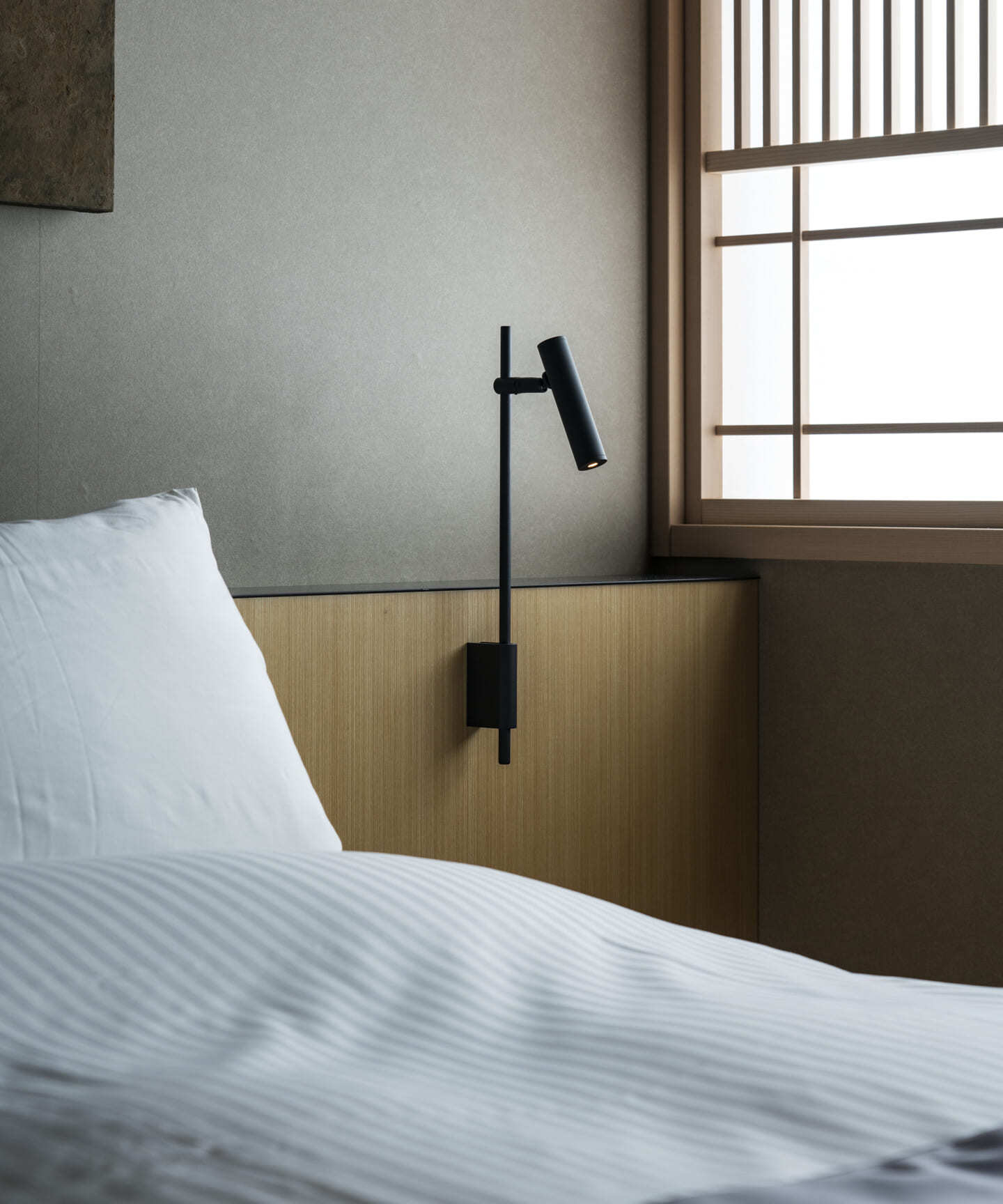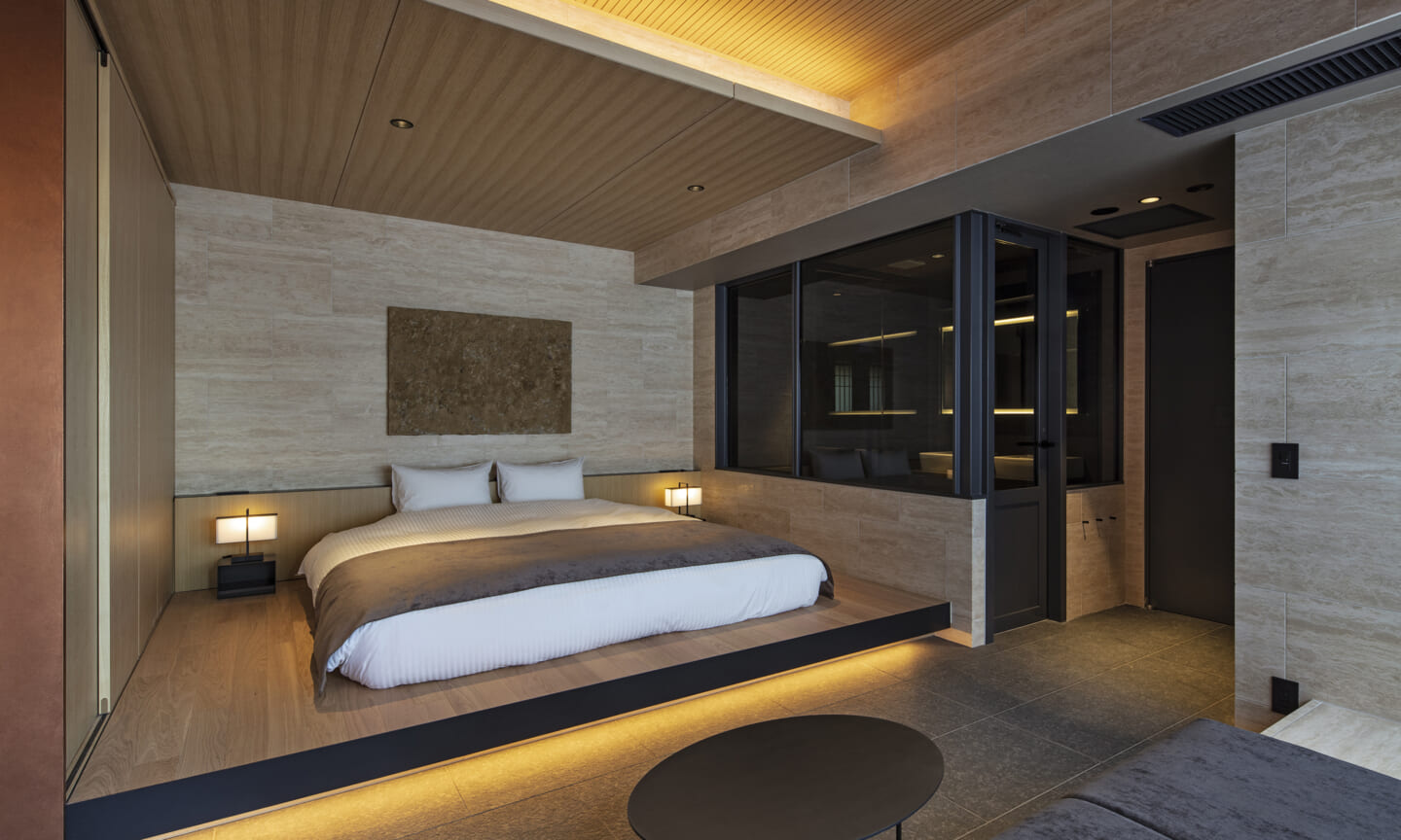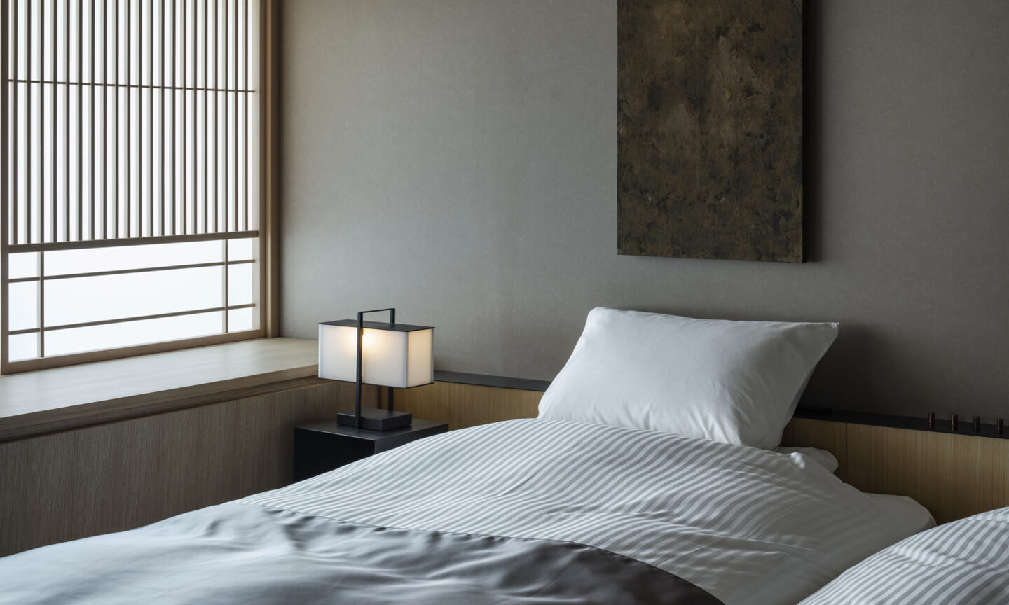 客室は、靴を脱いで床座で寛ぐ日本の生活様式を用いて、畳の小上がりやベットを造作し空間要素を絞り込むことで低いレベルで水平垂直を強調したプランとした。計画地周辺は住宅地であるため、近隣配慮の視点から窓からの景色を楽しむのではなく、障子とサッシの間に照明を仕込み開口部自体を行燈と見立て、格子の影や障子からもれる光のその先に“奥の間”を連想させ空間の広がりを感じられるよう意図している。