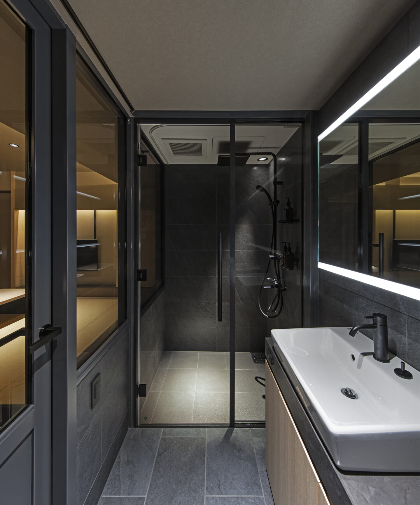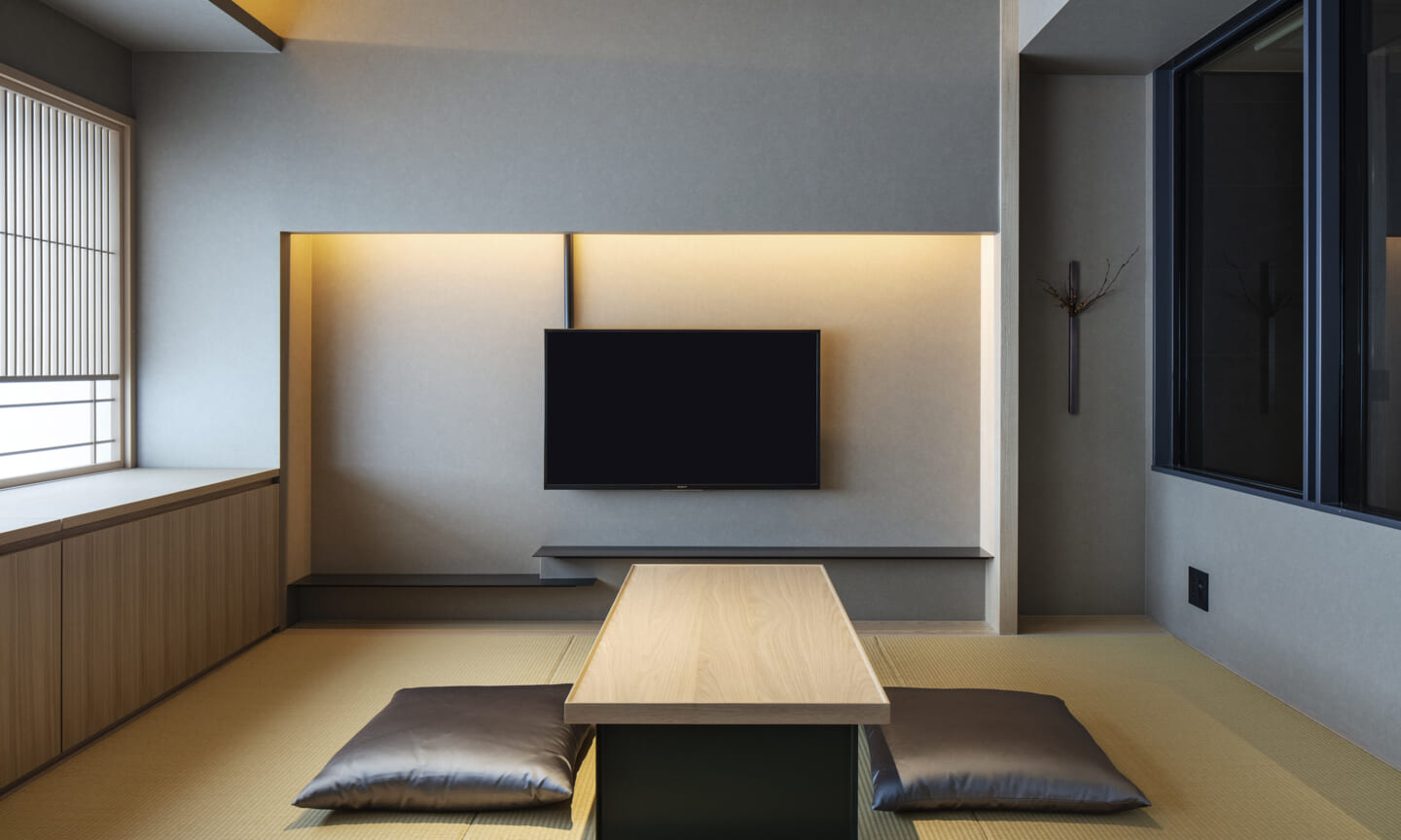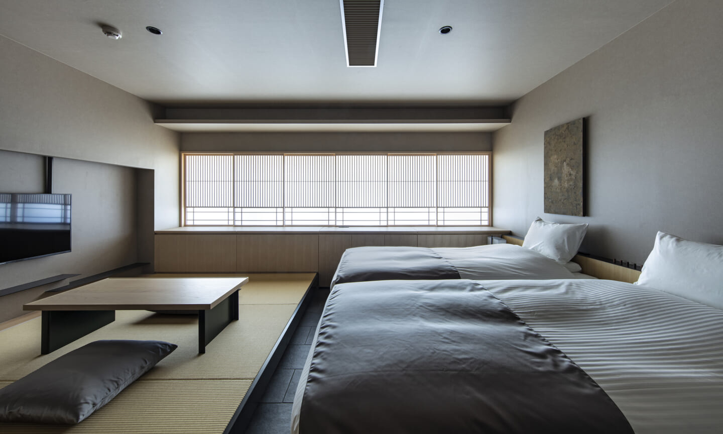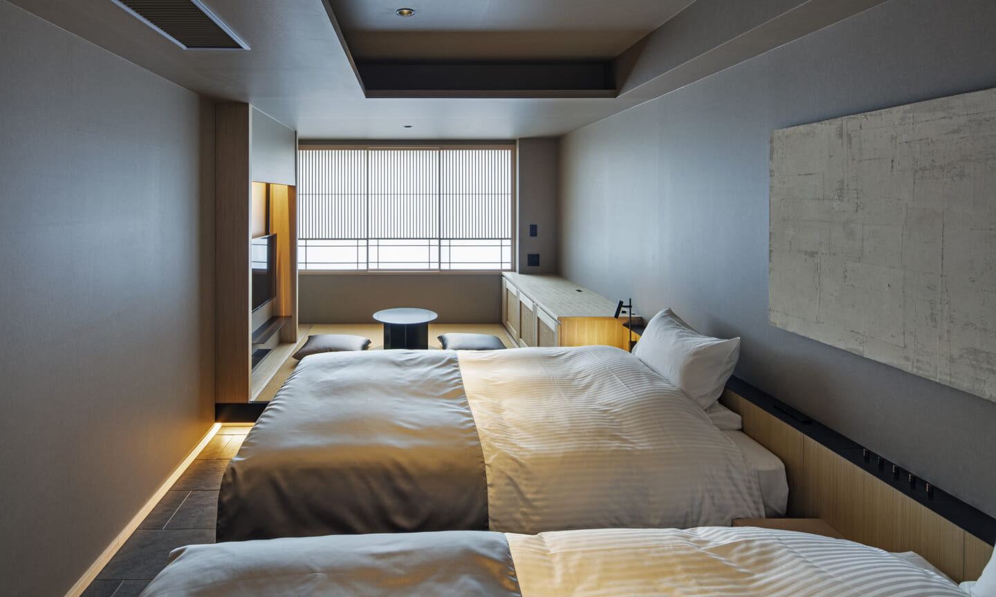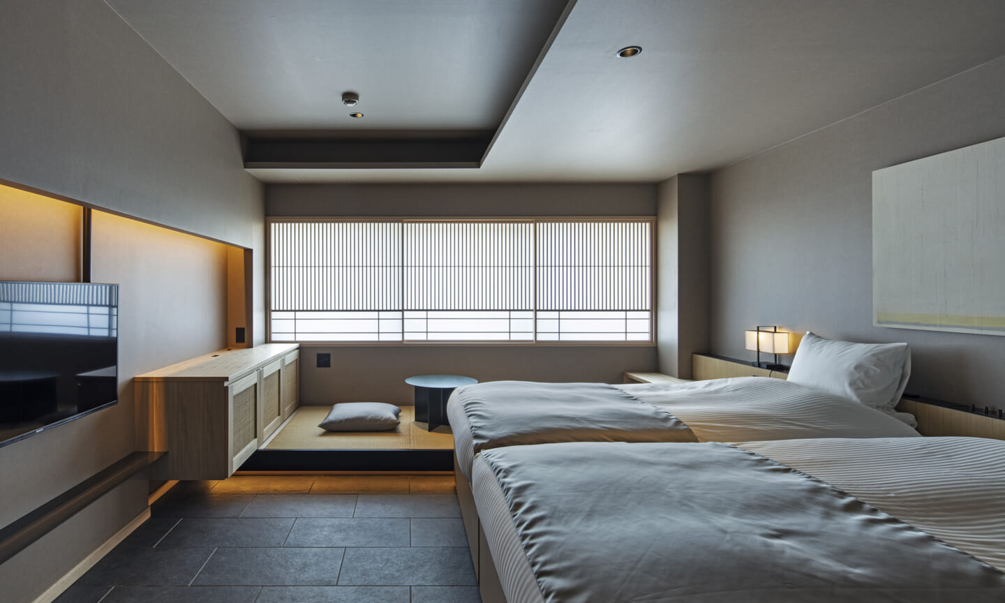 客室は、靴を脱いで床座で寛ぐ日本の生活様式を用いて、畳の小上がりやベットを造作し空間要素を絞り込むことで低いレベルで水平垂直を強調したプランとした。計画地周辺は住宅地であるため、近隣配慮の視点から窓からの景色を楽しむのではなく、障子とサッシの間に照明を仕込み開口部自体を行燈と見立て、格子の影や障子からもれる光のその先に“奥の間”を連想させ空間の広がりを感じられるよう意図している。