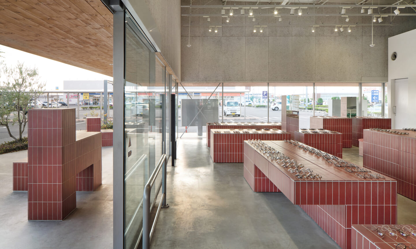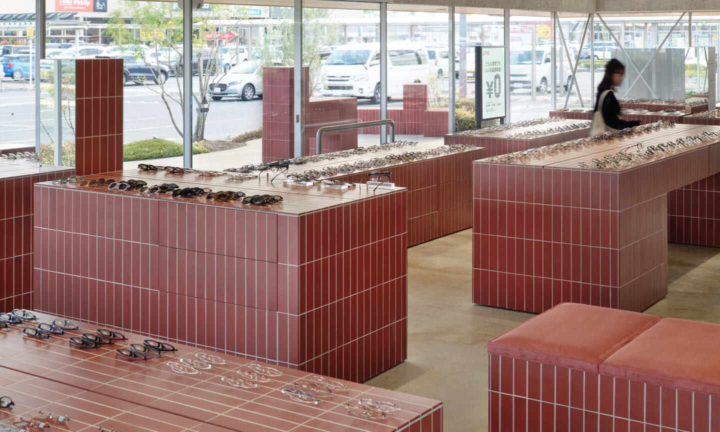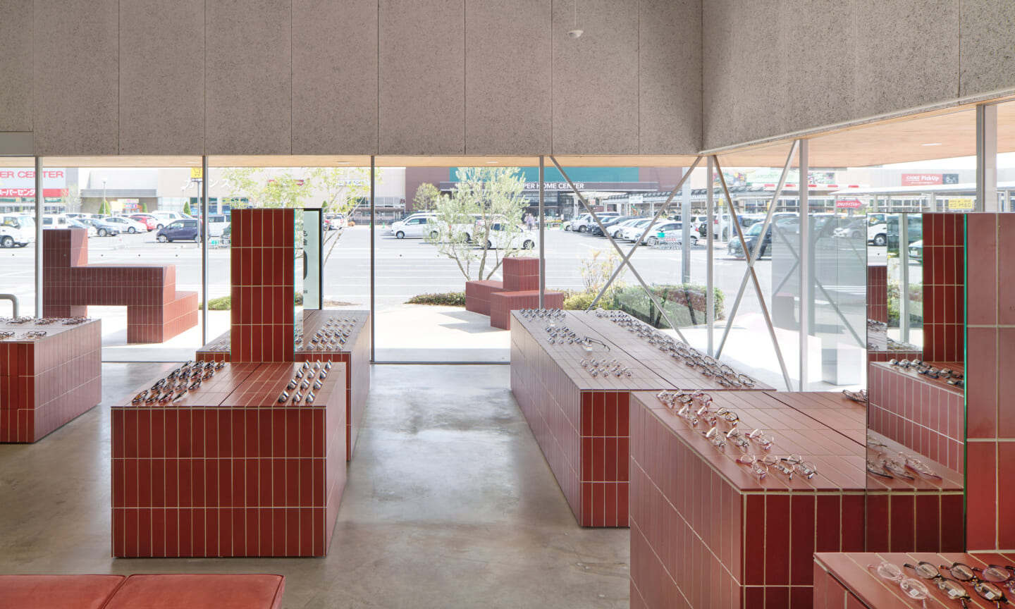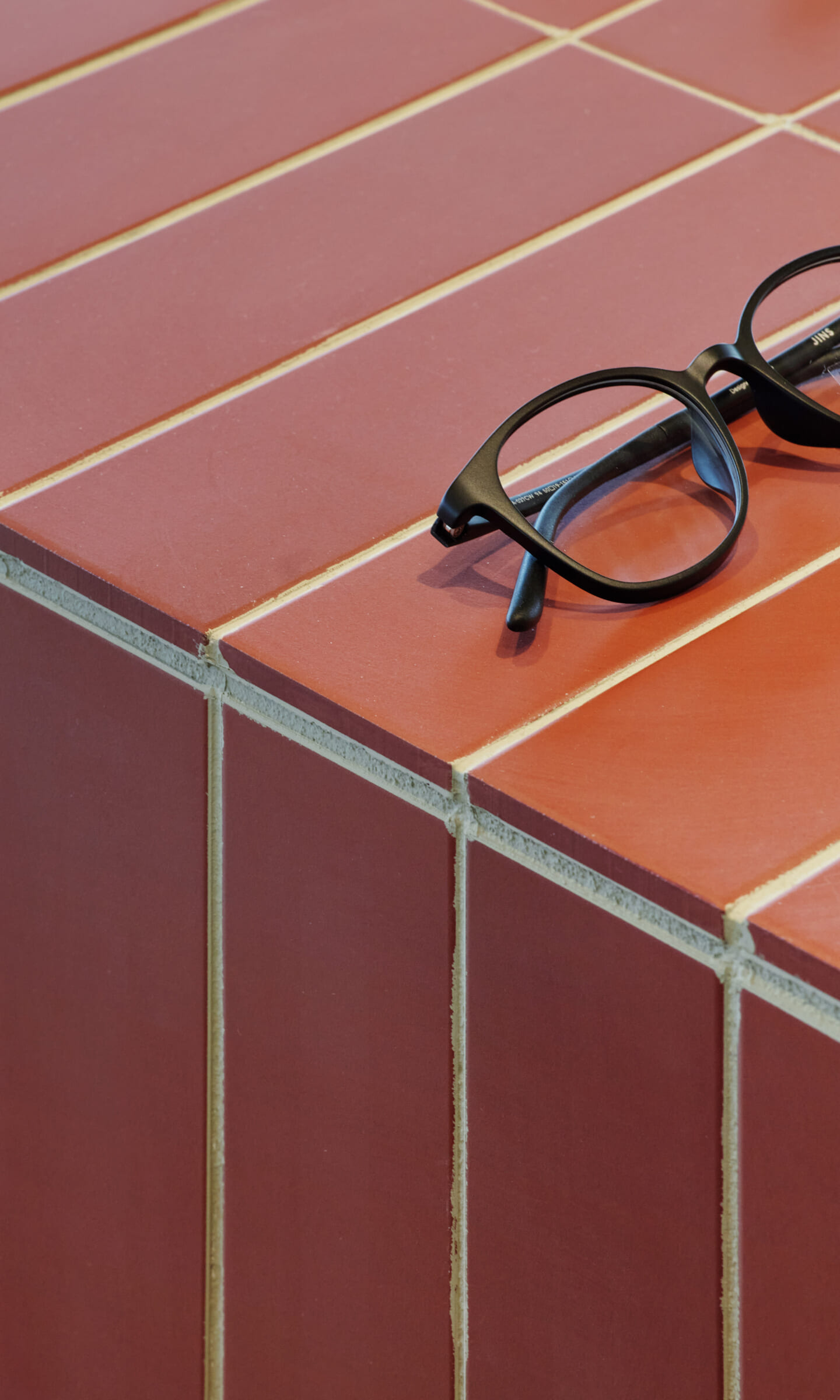 空間の多くを占めるメガネ用の什器はレンガ色のタイルの集積で構成。機能によって高さや形状が異なるキューブ状のボリュームは、什器でありベンチという居場所であり、彫刻のようなものとして捉え広場におけるオブジェのような存在として内外に点在させた。また前橋を象徴するテクスチャーであるレンガをタイルに置き換え、コーポレートカラーである赤を新たな表現で空間全体に印象的に取り入れることで創業の地にふさわしいJINS店舗の個性とし、周囲に開かれた既存建築を活かしたおおらかな公園のような売り場を目指した。