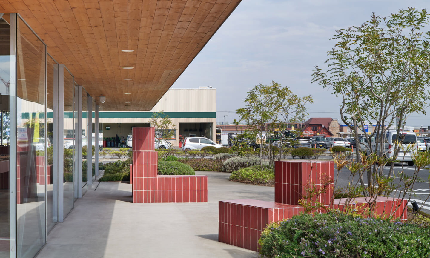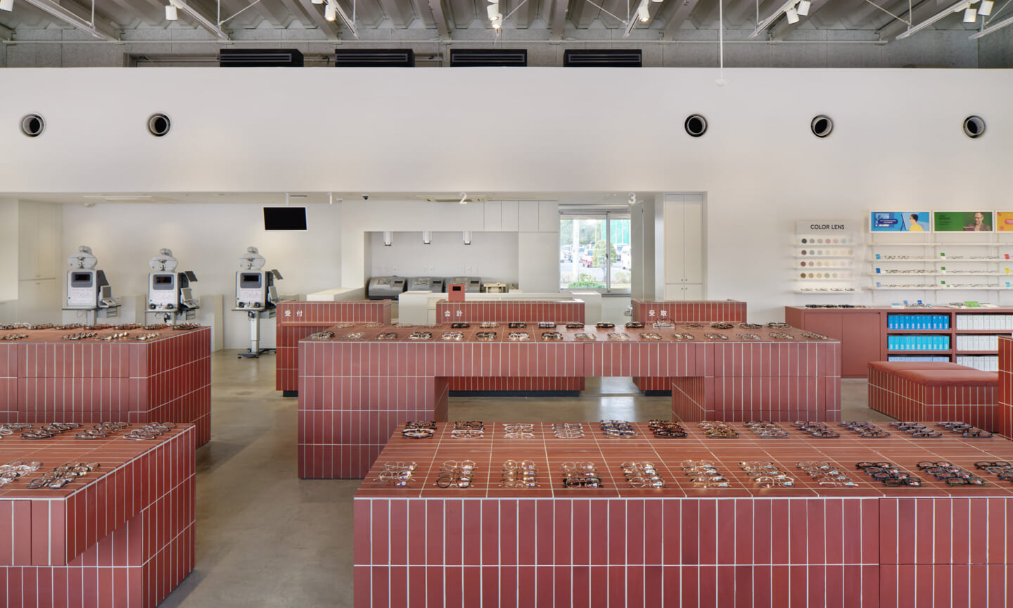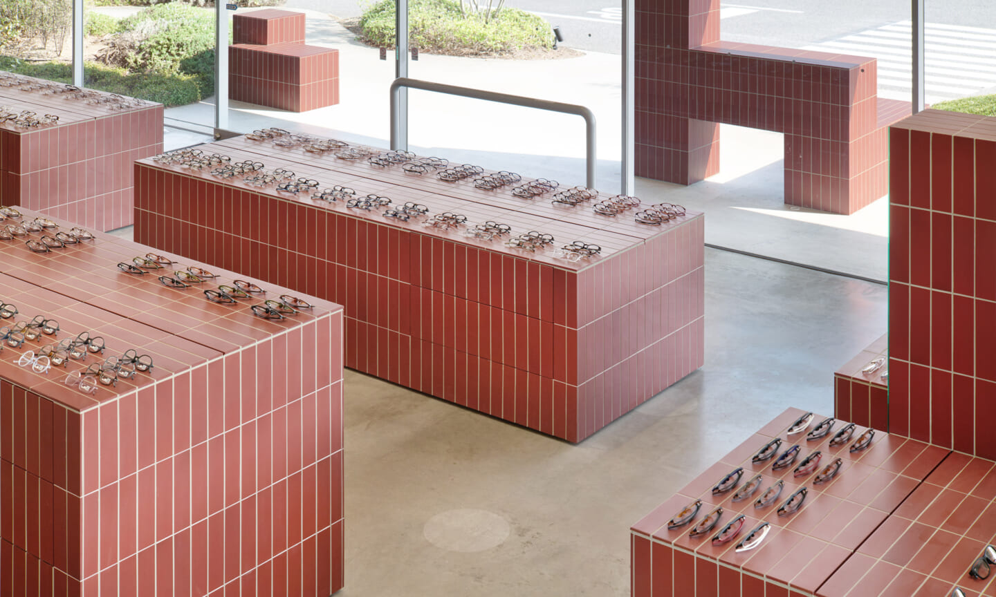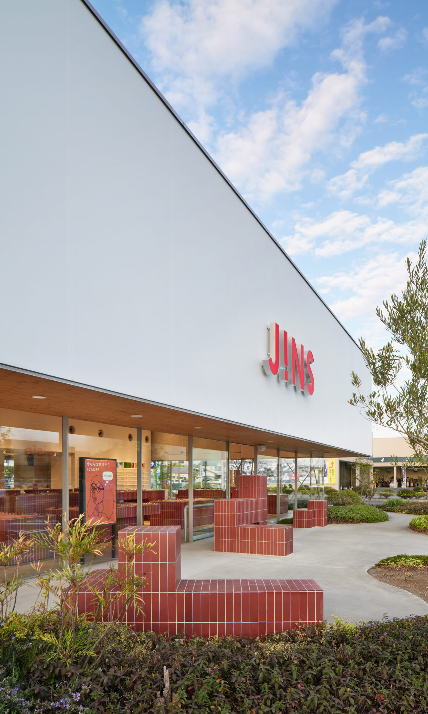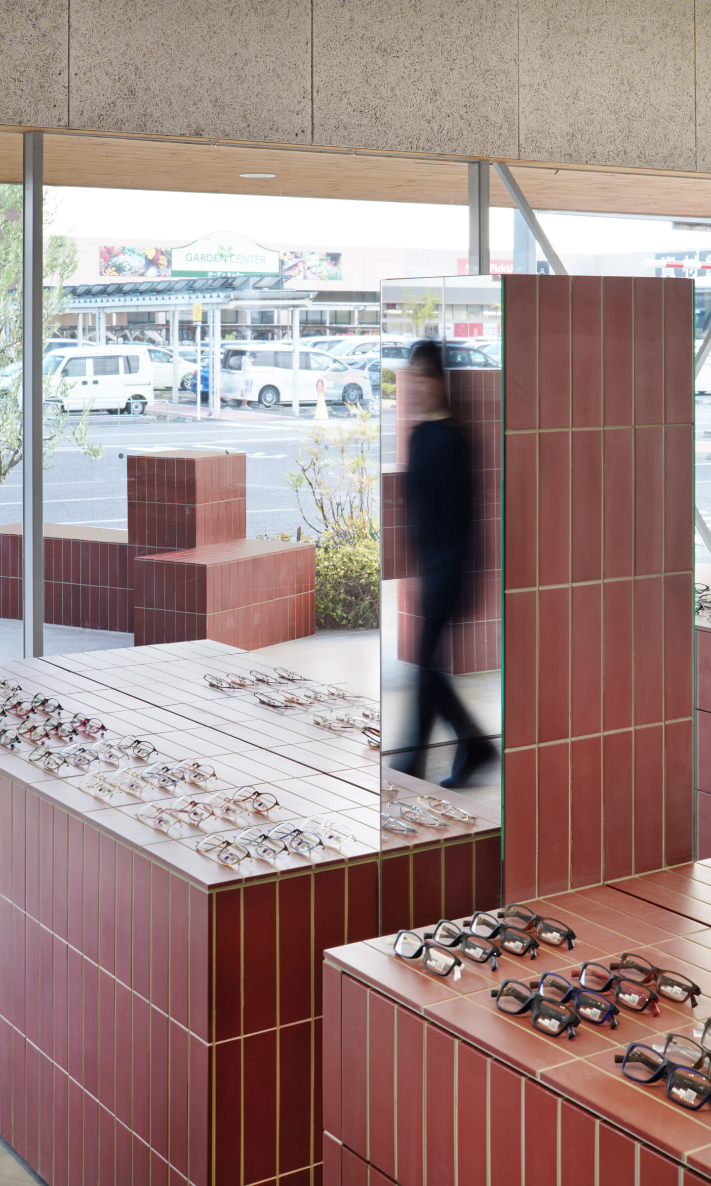 空間の多くを占めるメガネ用の什器はレンガ色のタイルの集積で構成。機能によって高さや形状が異なるキューブ状のボリュームは、什器でありベンチという居場所であり、彫刻のようなものとして捉え広場におけるオブジェのような存在として内外に点在させた。また前橋を象徴するテクスチャーであるレンガをタイルに置き換え、コーポレートカラーである赤を新たな表現で空間全体に印象的に取り入れることで創業の地にふさわしいJINS店舗の個性とし、周囲に開かれた既存建築を活かしたおおらかな公園のような売り場を目指した。