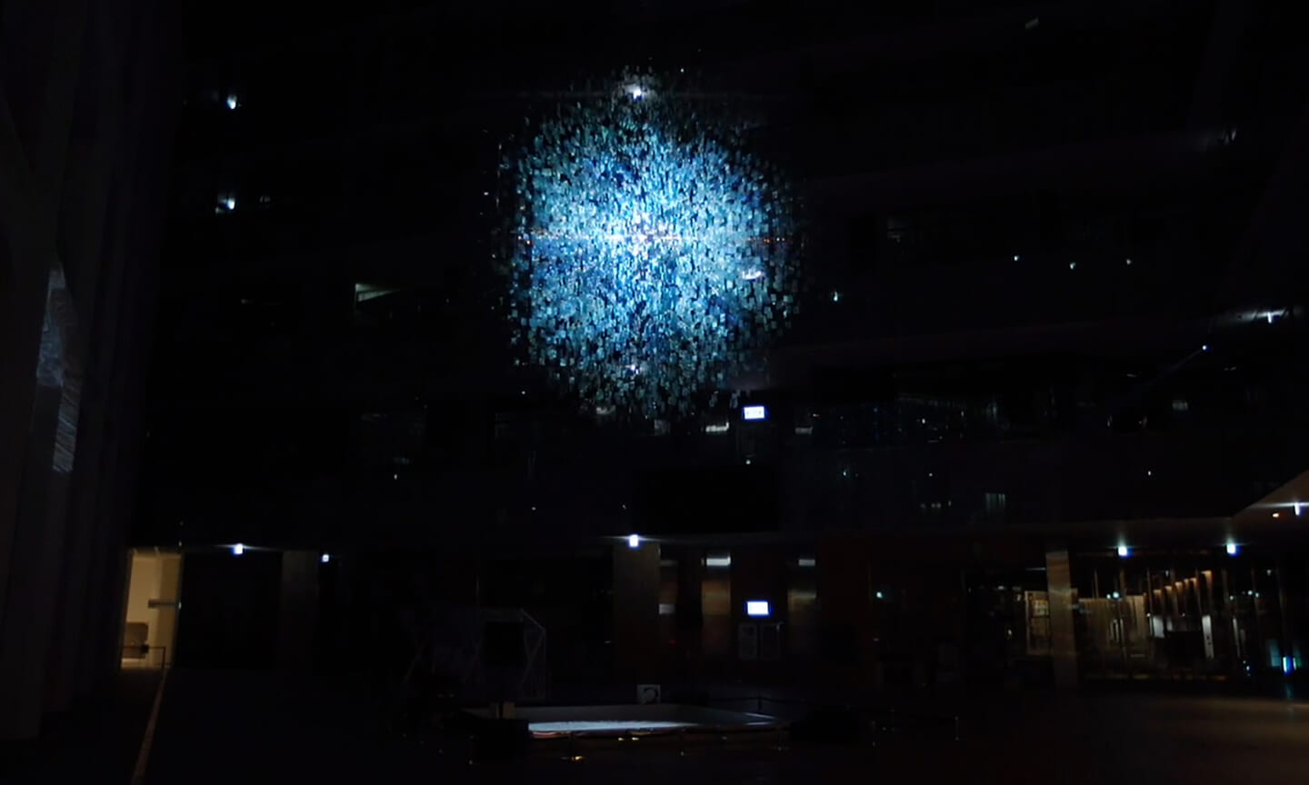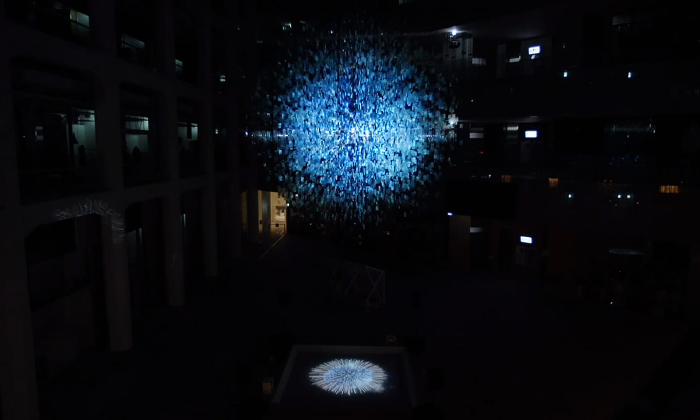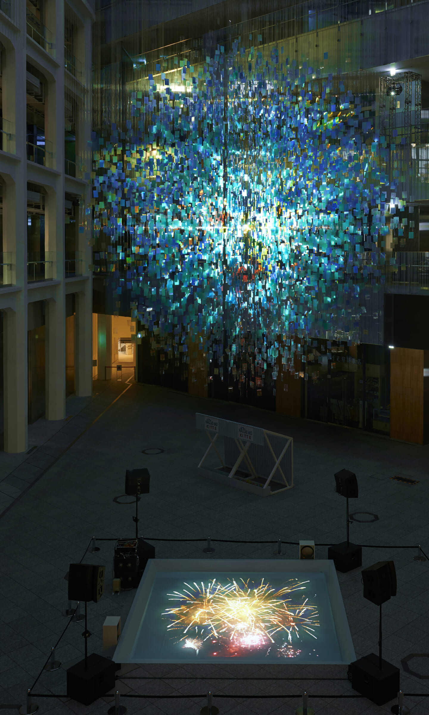 水が奏でる涼やかな音色と共に大輪の水花火によって彩られたアトリウム空間