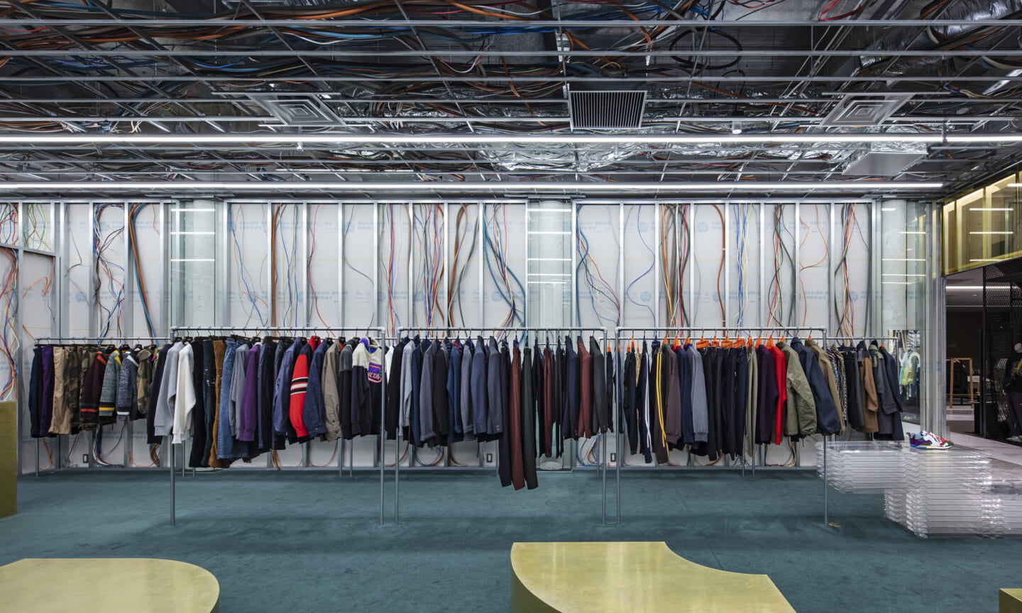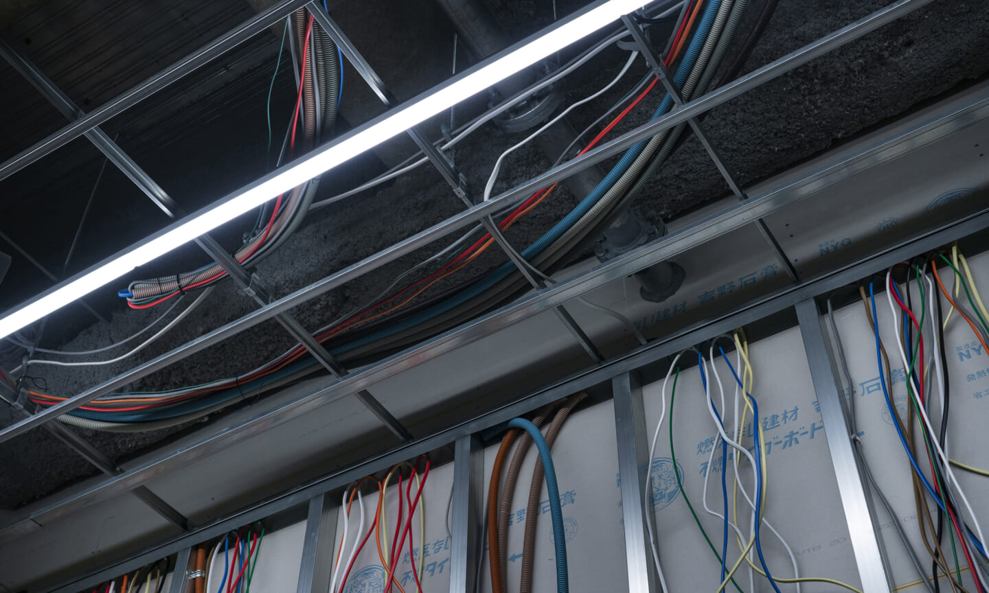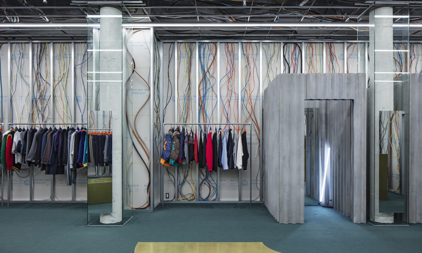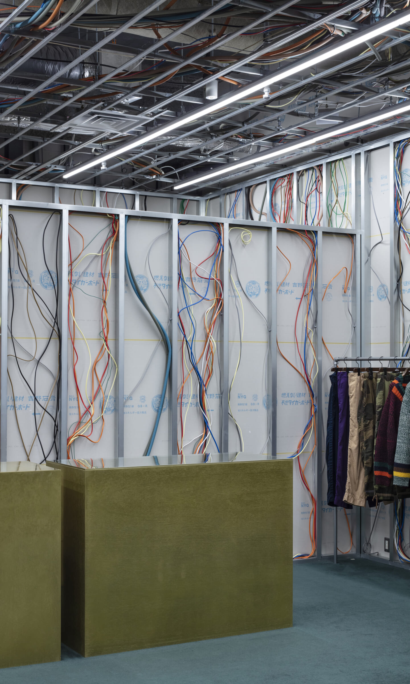 通常は仕上げ材で覆って見えなくなる軽量鉄骨の下地材や配管や配線、耐火被覆された鉄骨柱などはすべて現しとし、さらに必要のない大量の配線をフェイクとして追加。色鉛筆の種類ほどある色とりどりのカラフルな配線はKolorの洋服の特徴でもある差し色との親和性を意識し、これらフェイクの存在もチャーミングな空間のアクセントになるよう意図した。