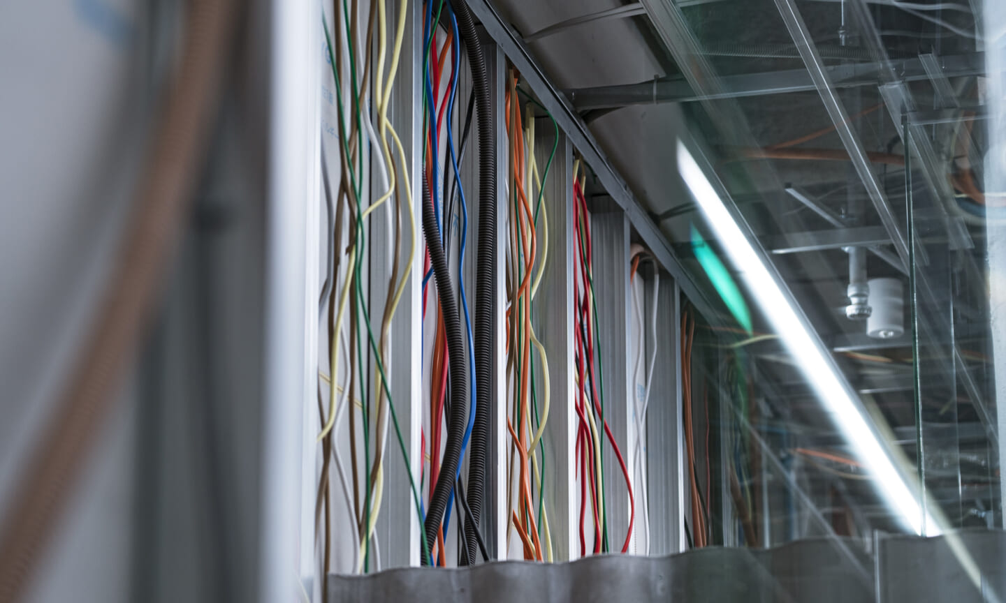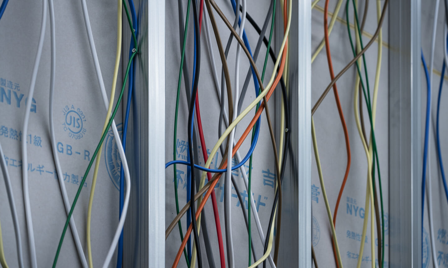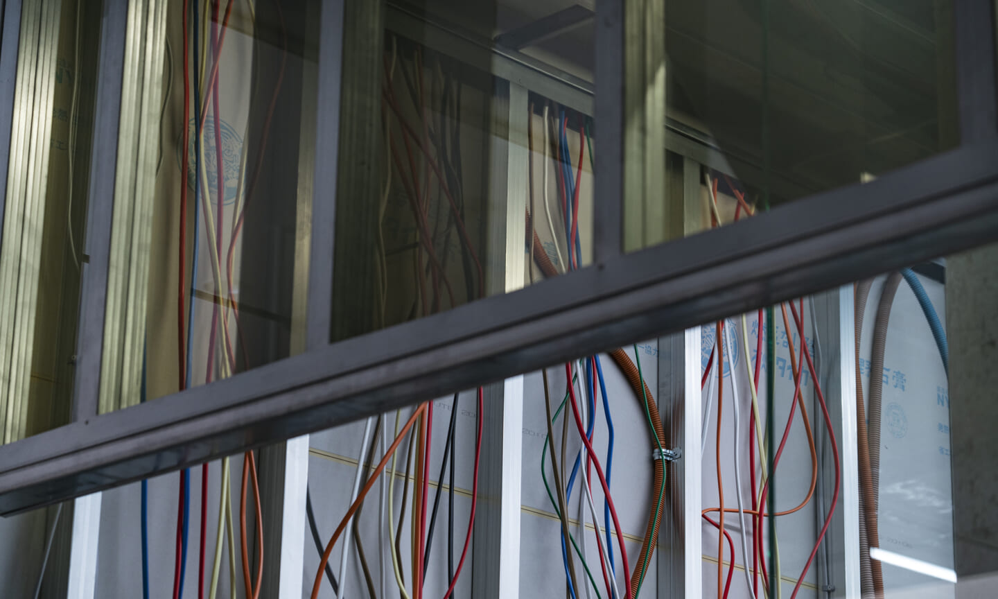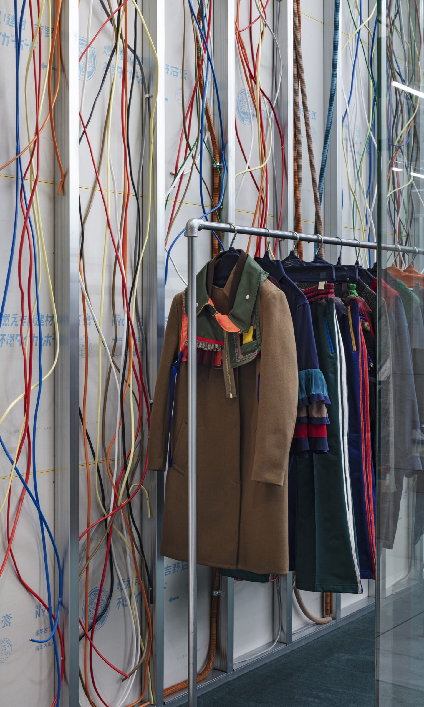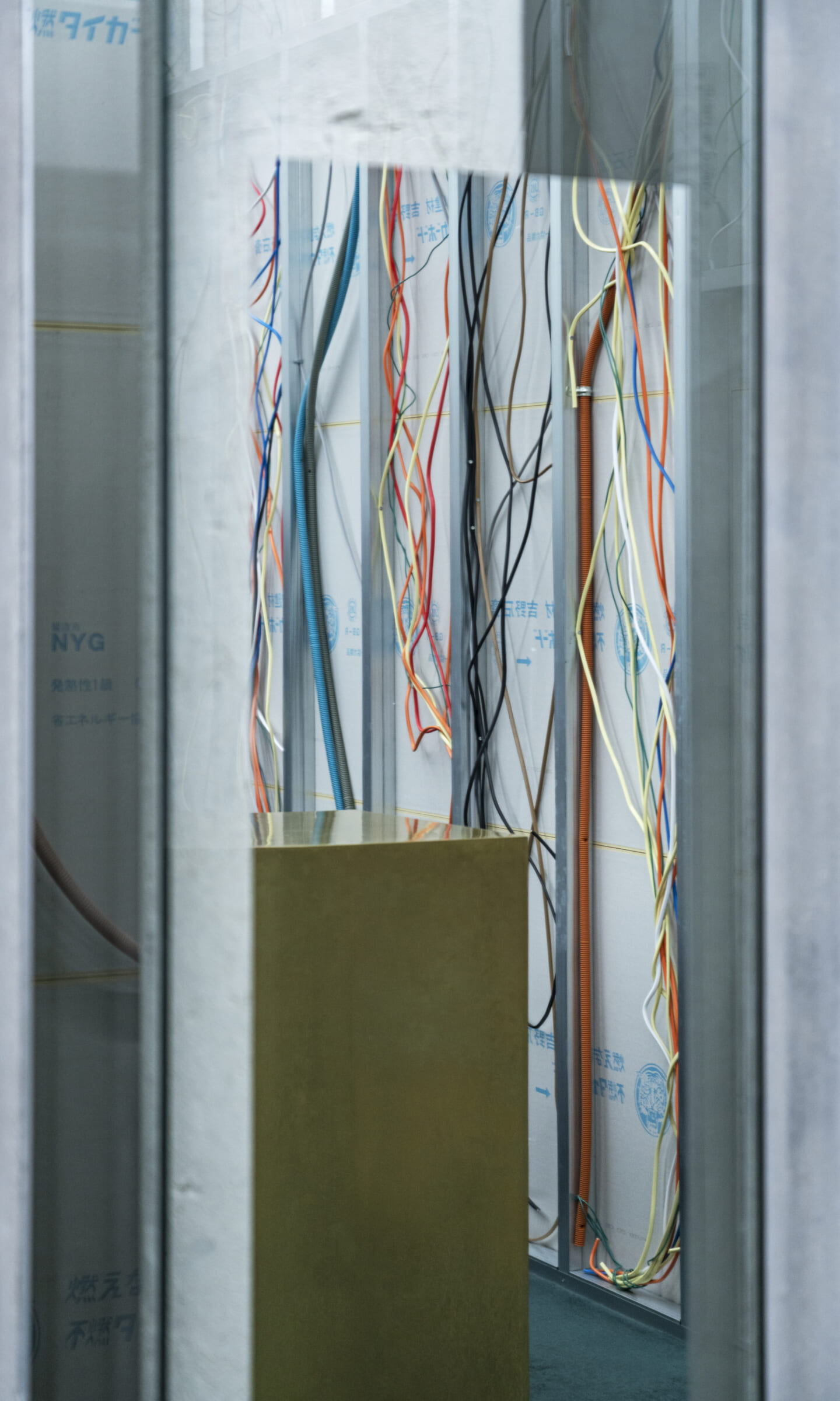 通常は仕上げ材で覆って見えなくなる軽量鉄骨の下地材や配管や配線、耐火被覆された鉄骨柱などはすべて現しとし、さらに必要のない大量の配線をフェイクとして追加。色鉛筆の種類ほどある色とりどりのカラフルな配線はKolorの洋服の特徴でもある差し色との親和性を意識し、これらフェイクの存在もチャーミングな空間のアクセントになるよう意図した。