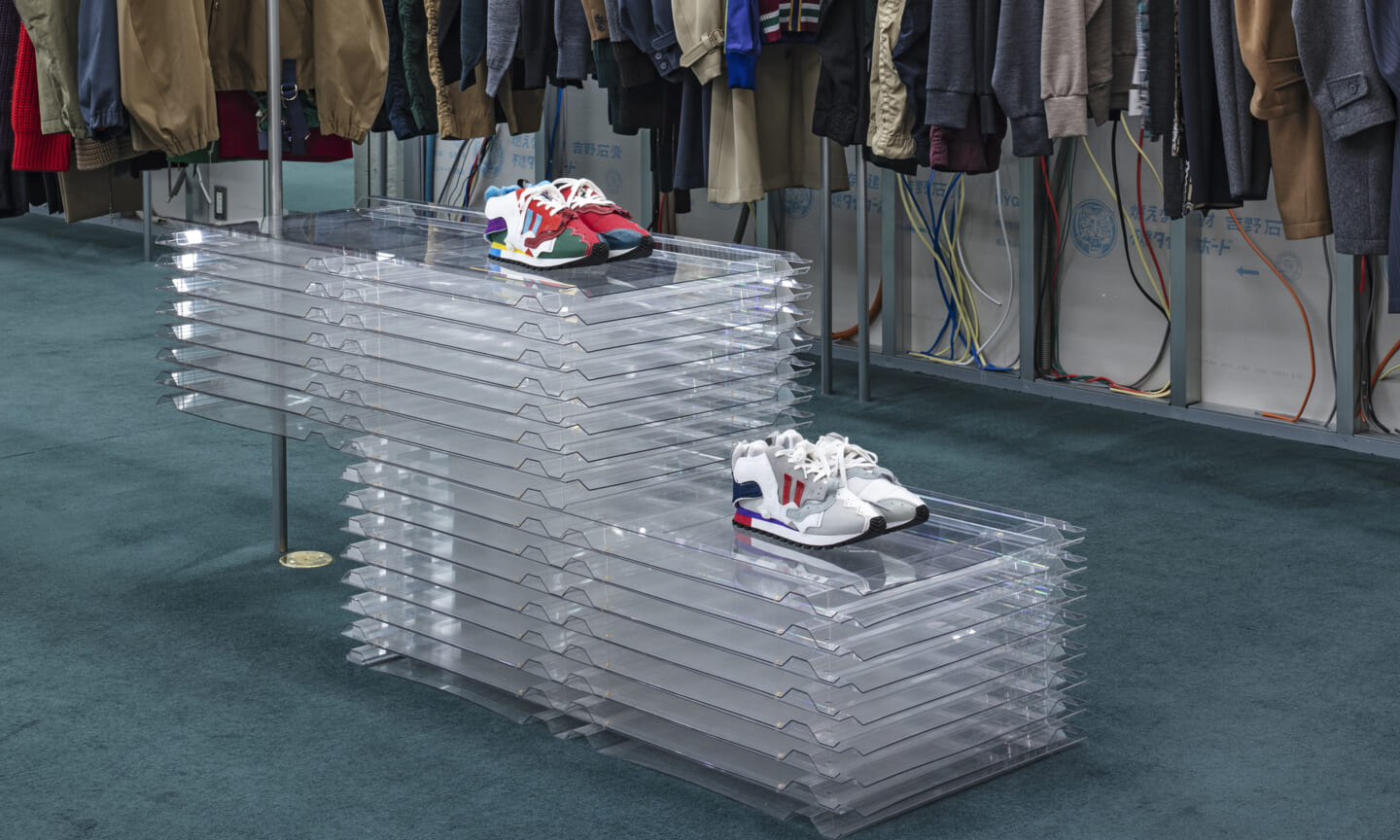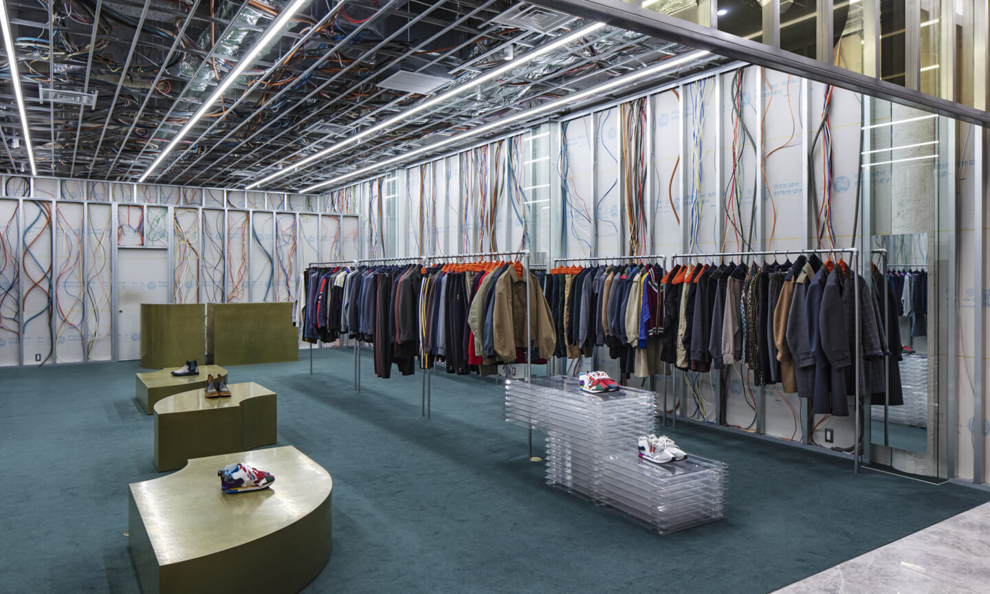 マテリアルの大半は工業製品的なチープな素材でシャープなディテールを目指し、一部にラグジュアリーな印象のカーペットやオブジェのような真鍮素材の什器を加えた。この様にさまざまな要素を対比という関係のもとデザインに落とし込むことで、ブランドの魅力にも通じる“良い違和感”と心地よい裏切りのある空間を目指した。