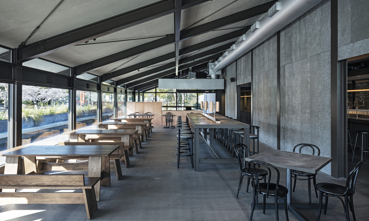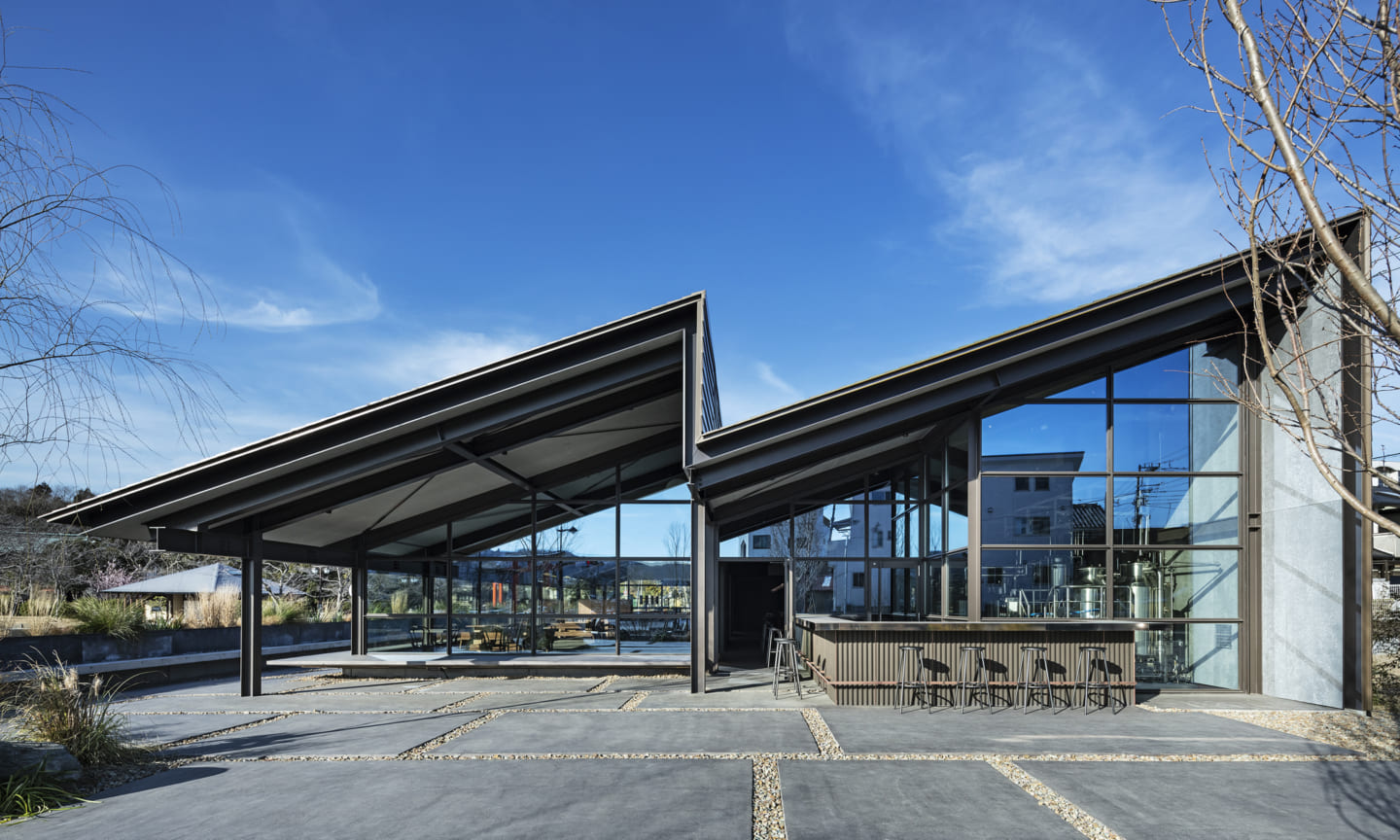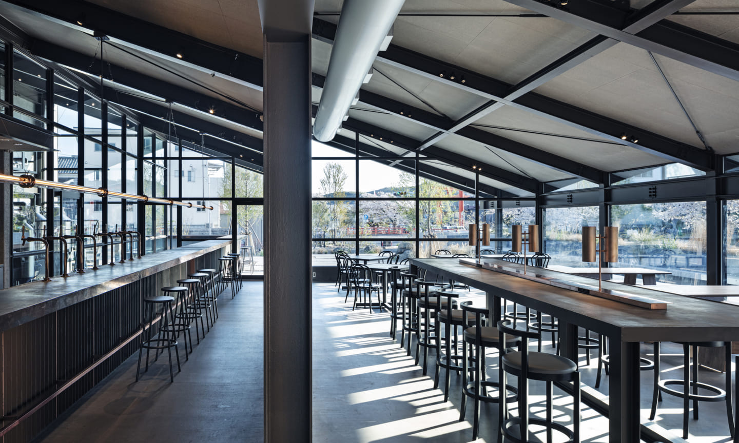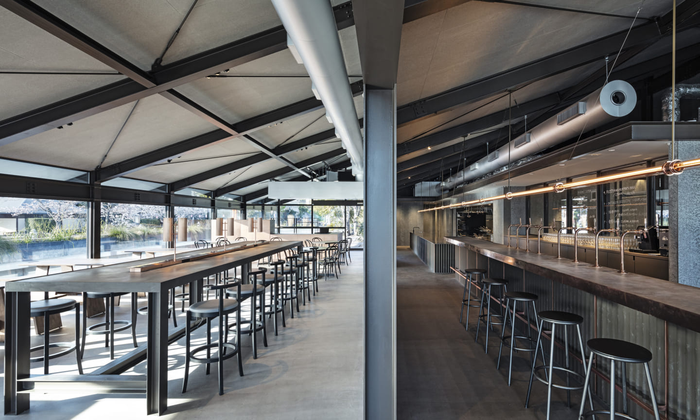 大らかな富士の稜線に習った勾配屋根により、空間を異なる高さで分節させ、「機械と用途により大きな気積が必要な醸造所」と「低い軒で隣地の桜並木と澄み切った川を借景として取り込む客席」をゆるやかに分けながらも一つの空間に統合し、周辺環境と連続的につながる構成とした。また、内と外を等価に扱い、屋外の深い軒下空間にはカウンターやベンチなど多様な拠り所をつくり、公園や道路、街に対しても賑わいが滲みだすことを意図した。