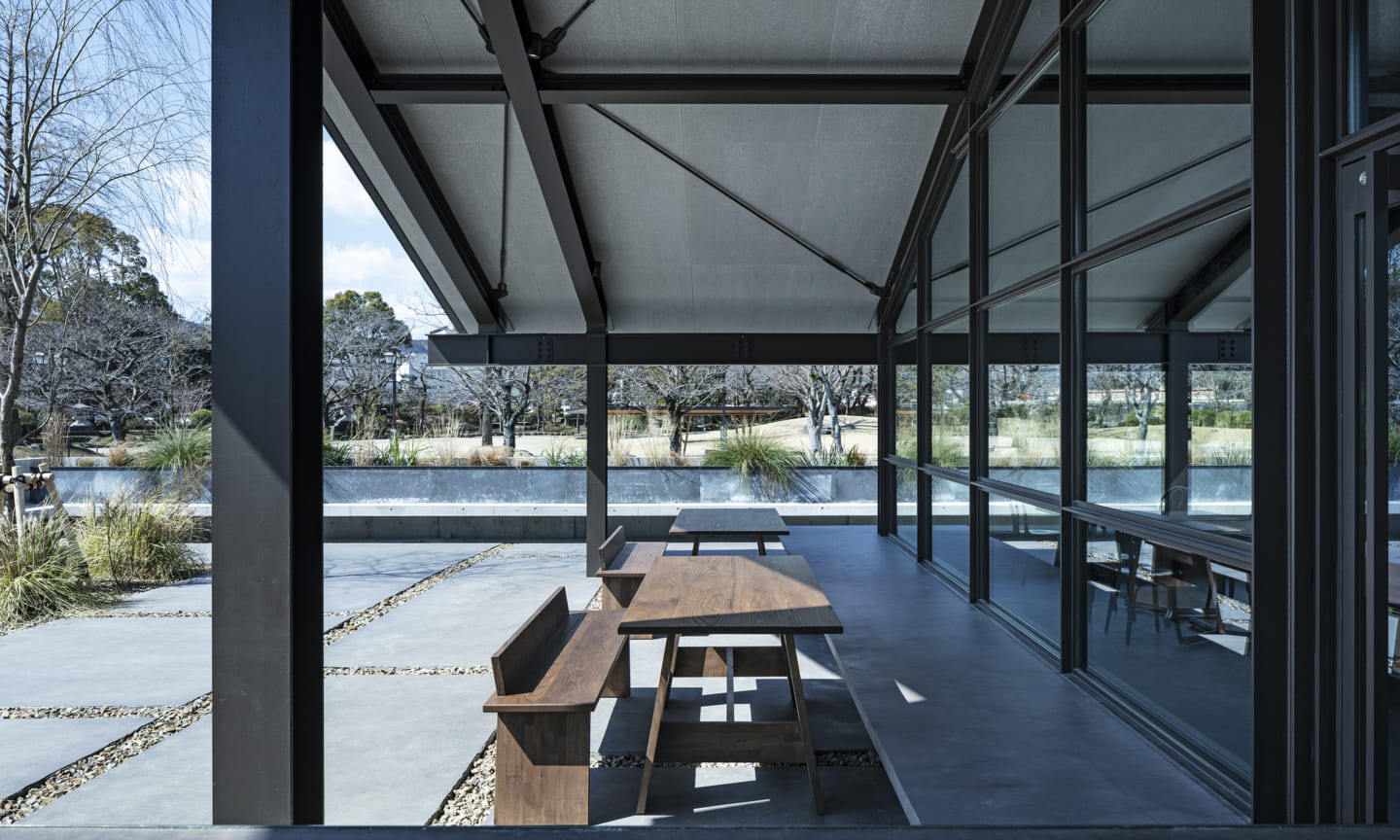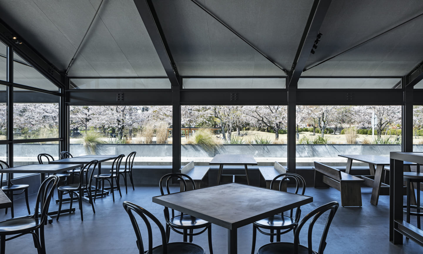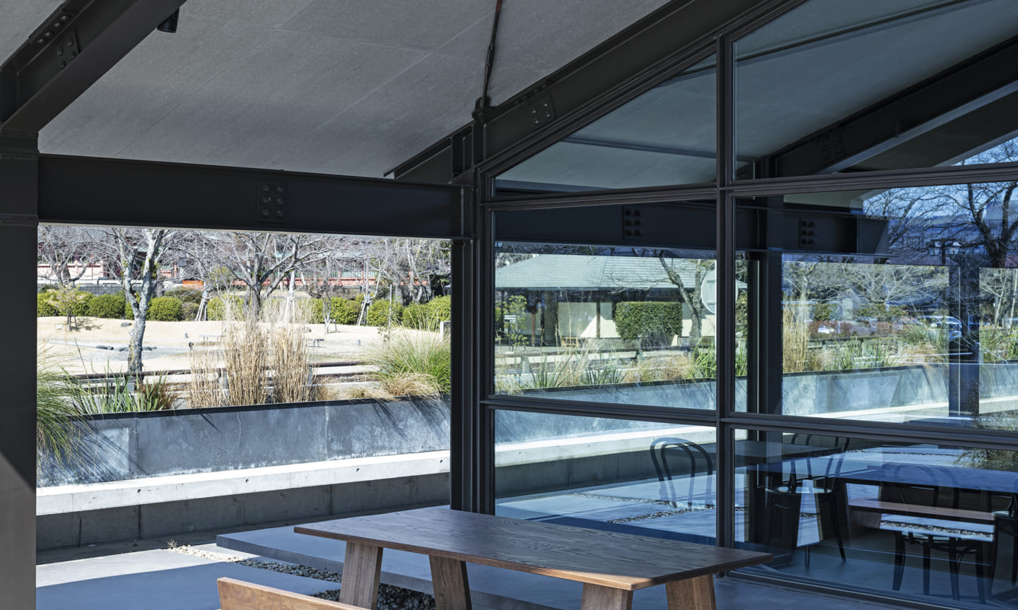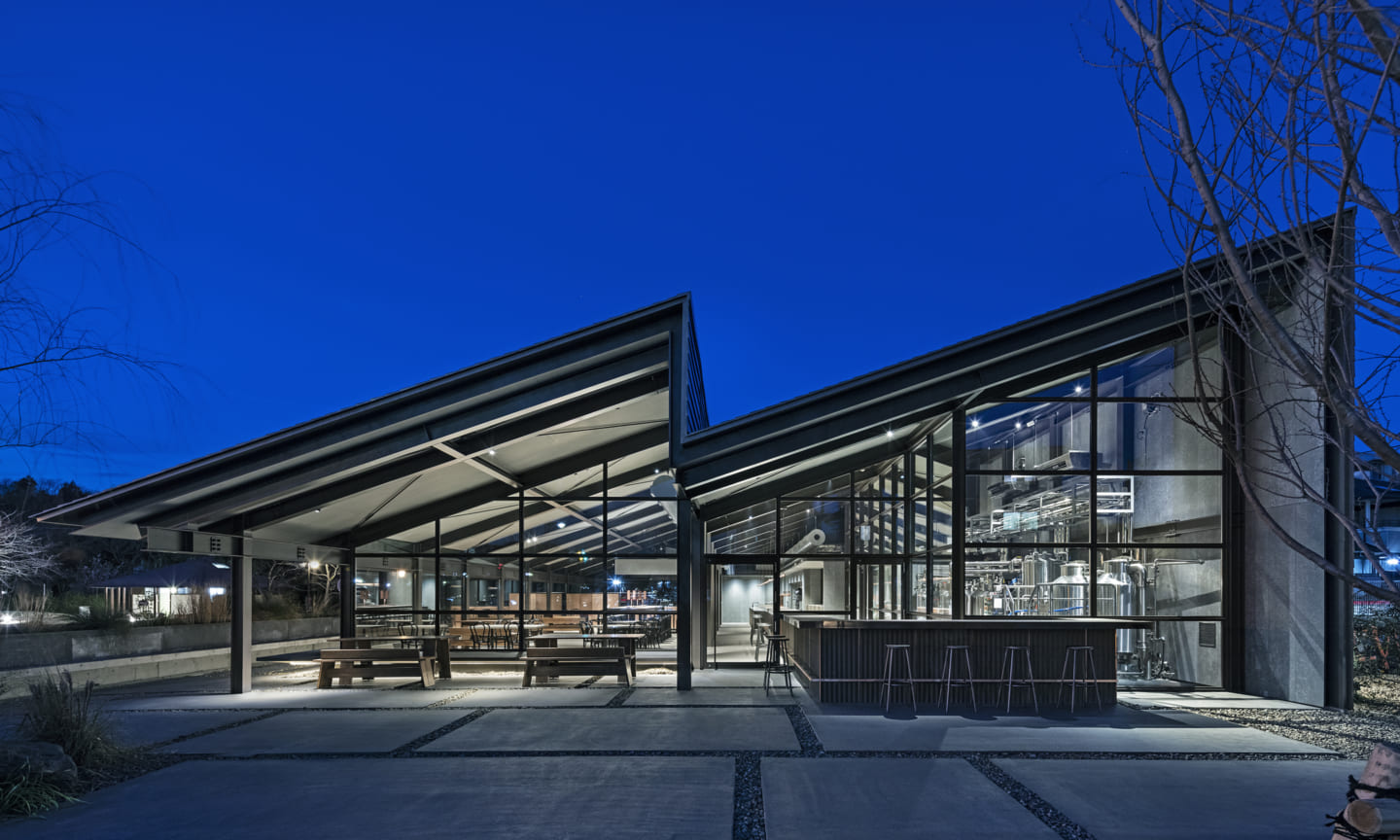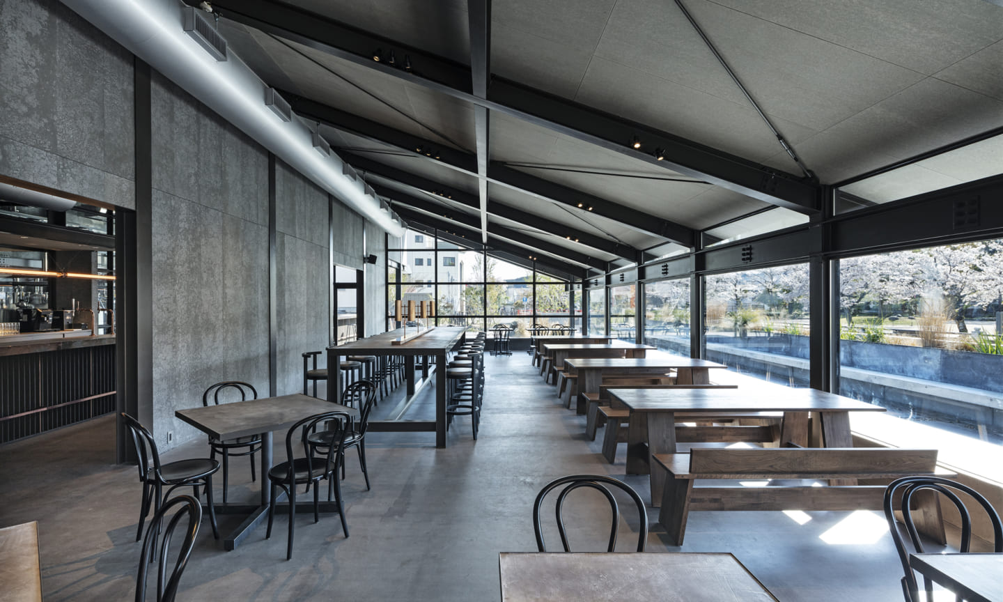 大らかな富士の稜線に習った勾配屋根により、空間を異なる高さで分節させ、「機械と用途により大きな気積が必要な醸造所」と「低い軒で隣地の桜並木と澄み切った川を借景として取り込む客席」をゆるやかに分けながらも一つの空間に統合し、周辺環境と連続的につながる構成とした。また、内と外を等価に扱い、屋外の深い軒下空間にはカウンターやベンチなど多様な拠り所をつくり、公園や道路、街に対しても賑わいが滲みだすことを意図した。